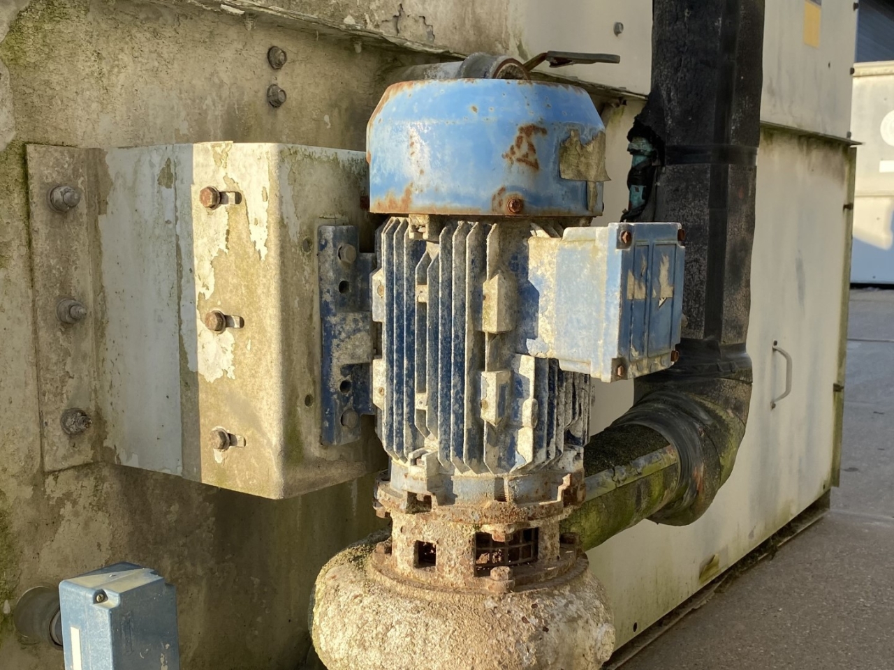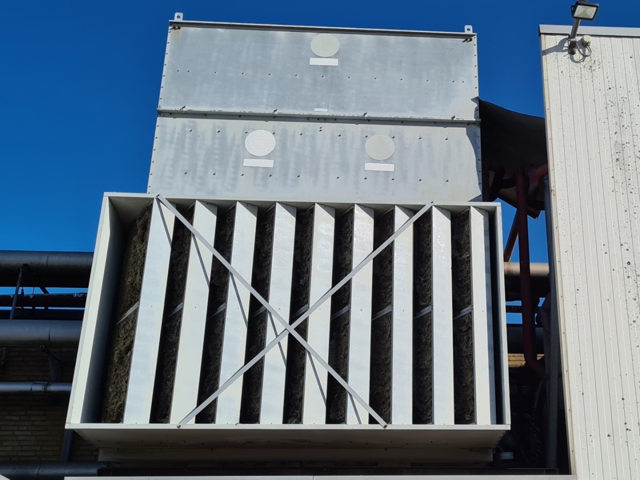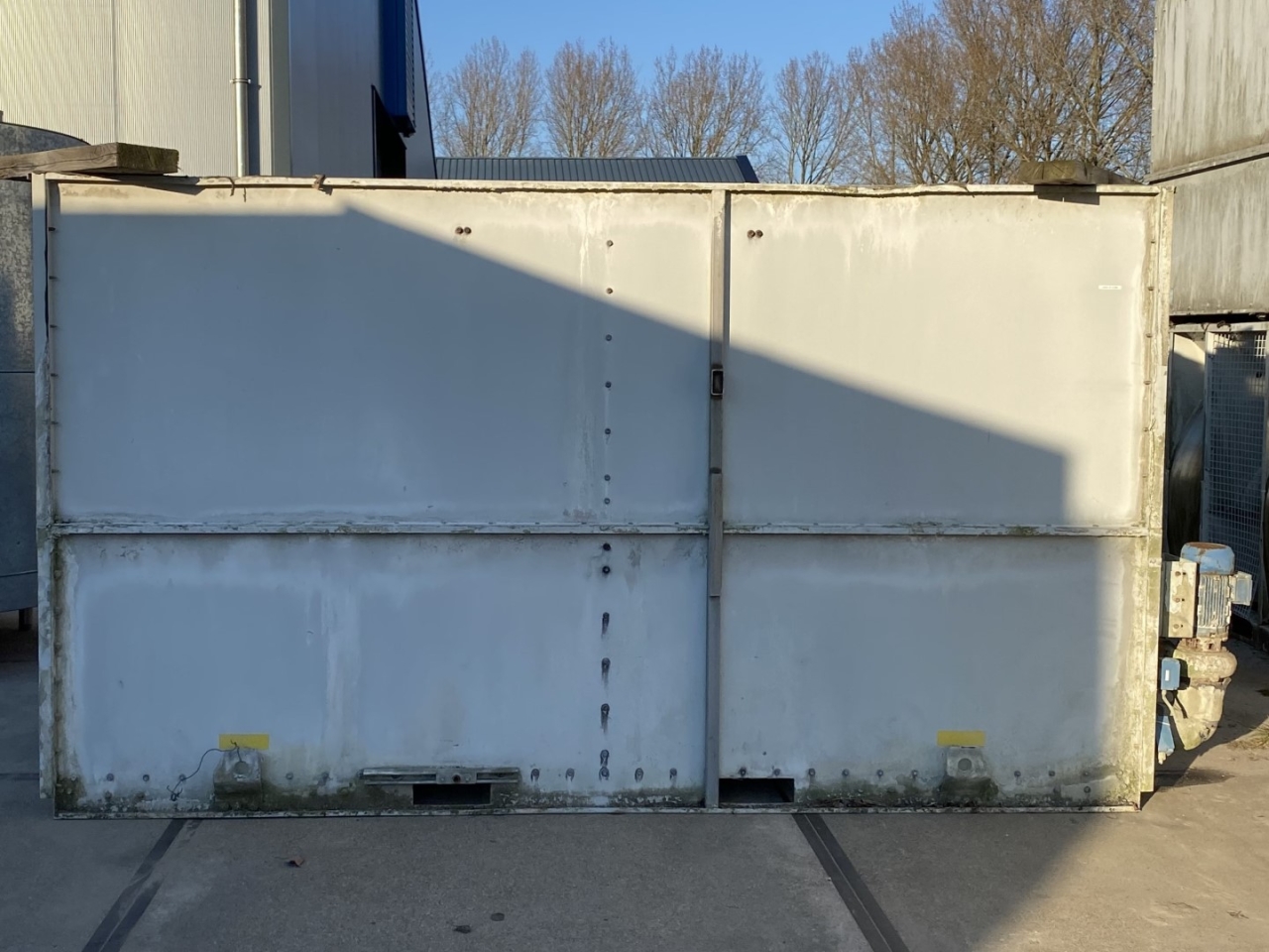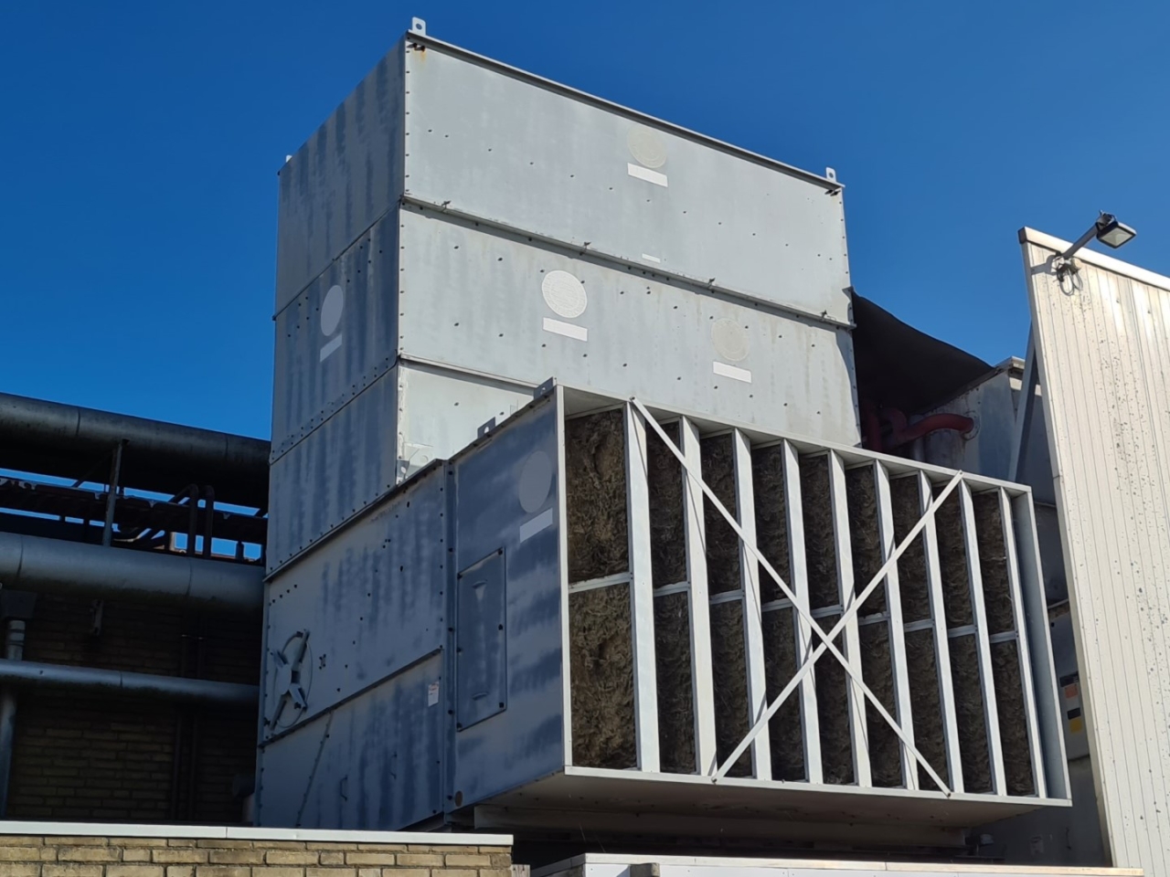 Gebruikte Baltimore VXC N275 verdampercondensor op Freon/NH3. Compleet met 2 centrifugaalventilatoren met een luchtstroom van 79.920 m³/u en een waterpomp.