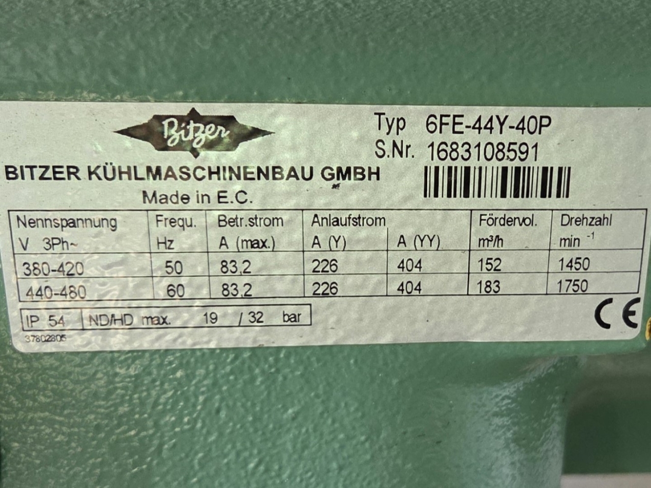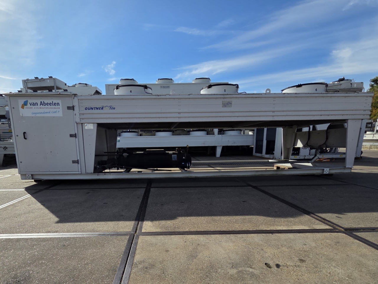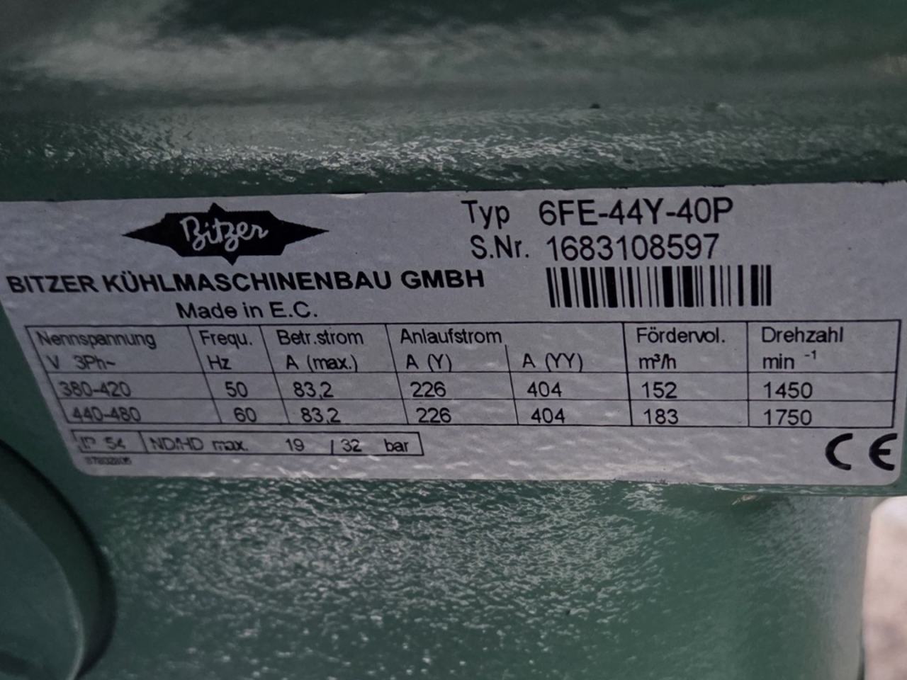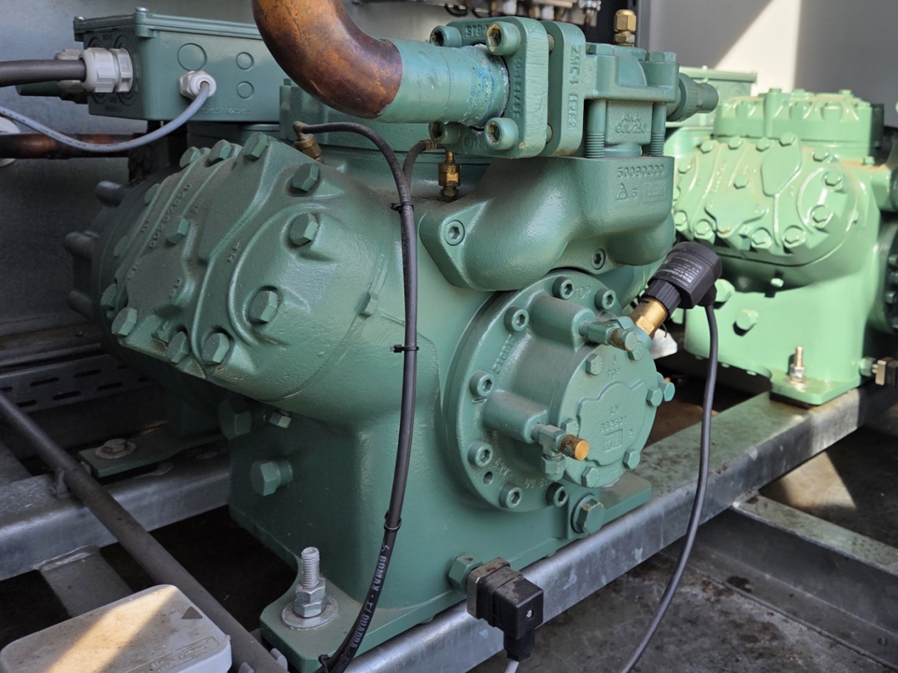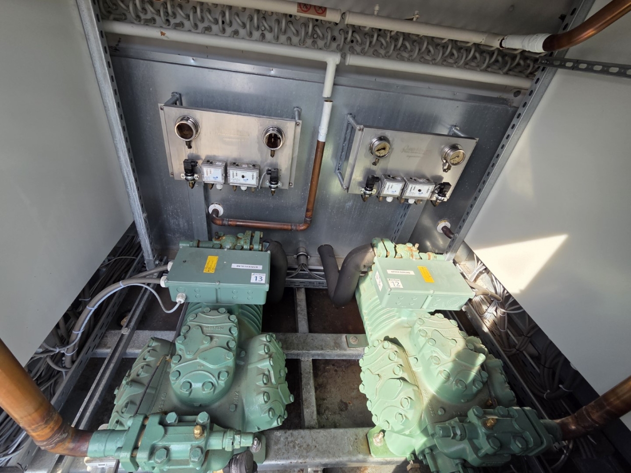 Gebruikte Bitzer condensorunit op Freon. Compleet met twee Bitzer 6FE-44Y-40P semi-hermetische zuigercompressoren, een Güntner S-GVHG 080.4A/2x3-M(S) E condensor met zes ventilatoren - 800 mm diameter, twee GVN horizontale vloeistofvaten HLR-COOL-125x2 met een inhoud van 125 liter, druk- en veiligheidsschakelaars/manometers, een schakelkast en twee Güntner schakelpanelen. De compressoren hebben een slagvolume van 304 m³/u bij 50 Hz en 366 m³/u bij 60 Hz.