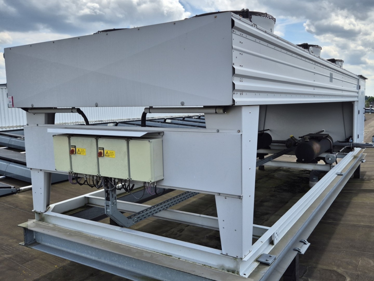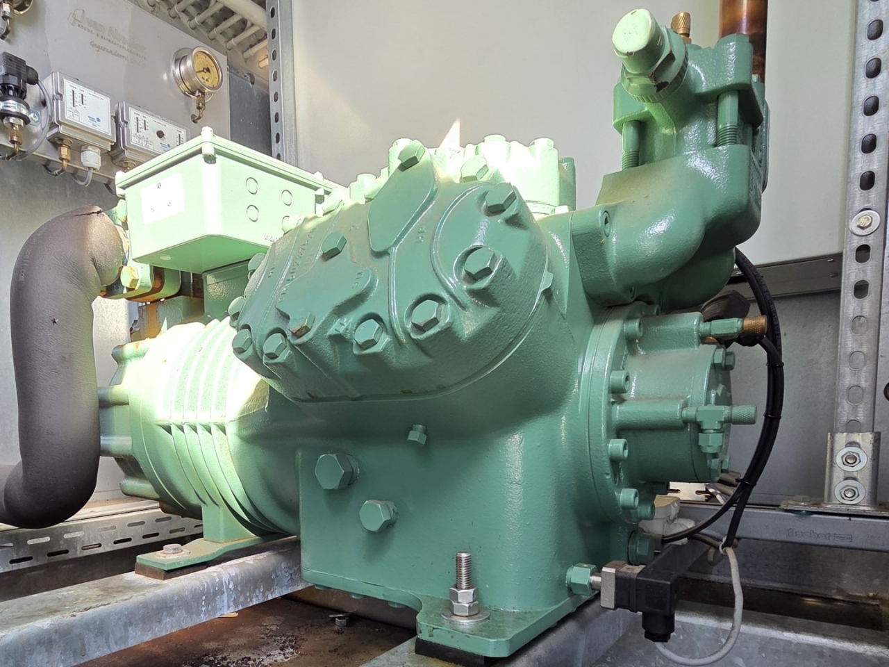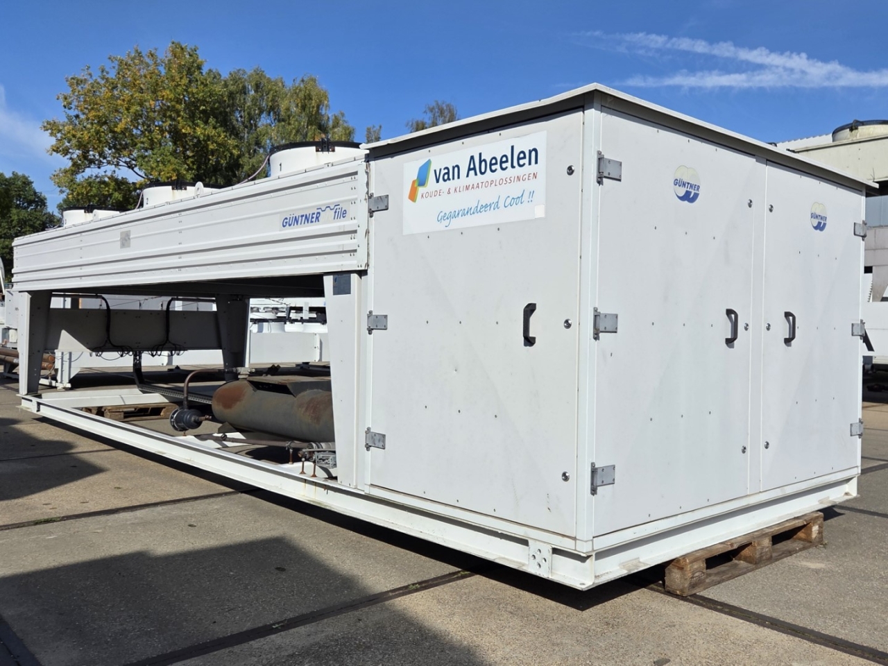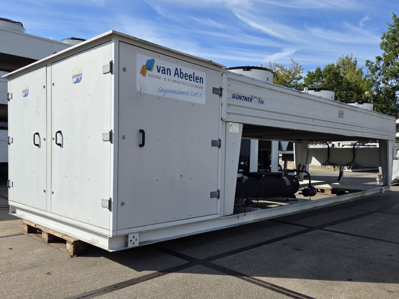 Gebruikte Bitzer condensorunit op Freon. Compleet met twee Bitzer 6FE-44Y-40P semi-hermetische zuigercompressoren, een Güntner S-GVHG 080.4A/2x3-M(S) E condensor met zes ventilatoren - 800 mm diameter, twee GVN horizontale vloeistofvaten HLR-COOL-125x2 met een inhoud van 125 liter, druk- en veiligheidsschakelaars/manometers, een schakelkast en twee Güntner schakelpanelen. De compressoren hebben een slagvolume van 304 m³/u bij 50 Hz en 366 m³/u bij 60 Hz.