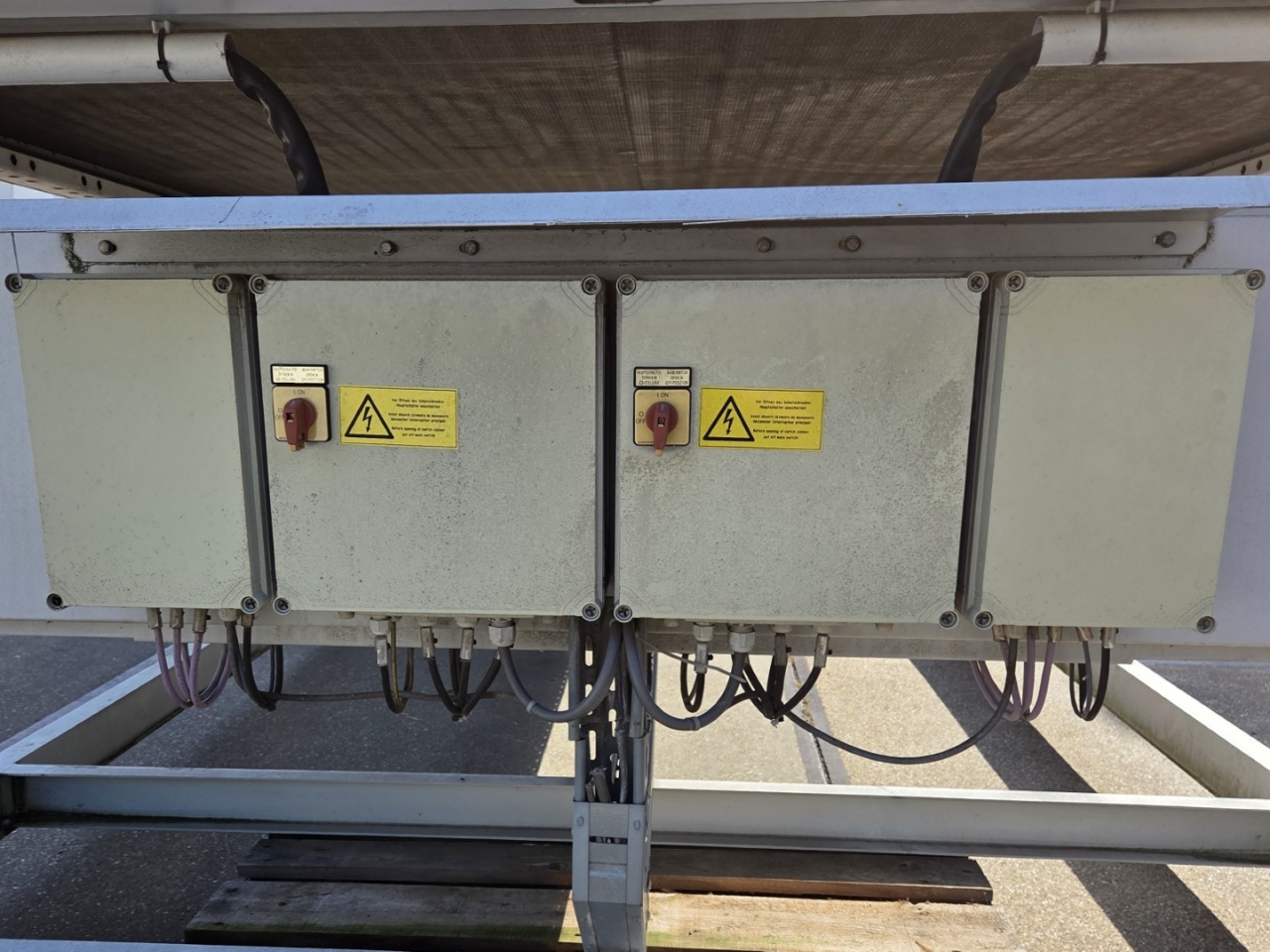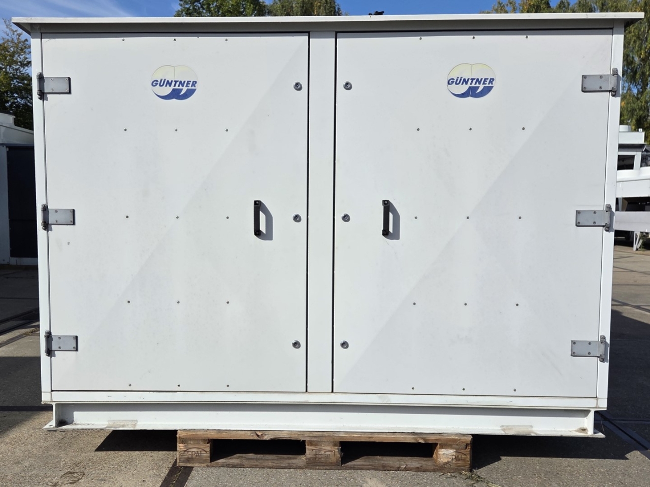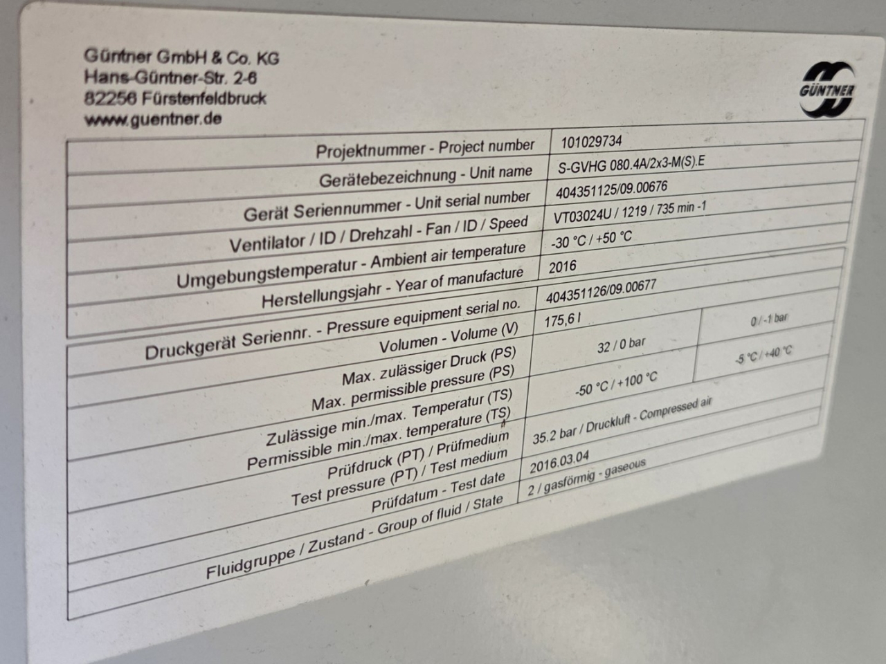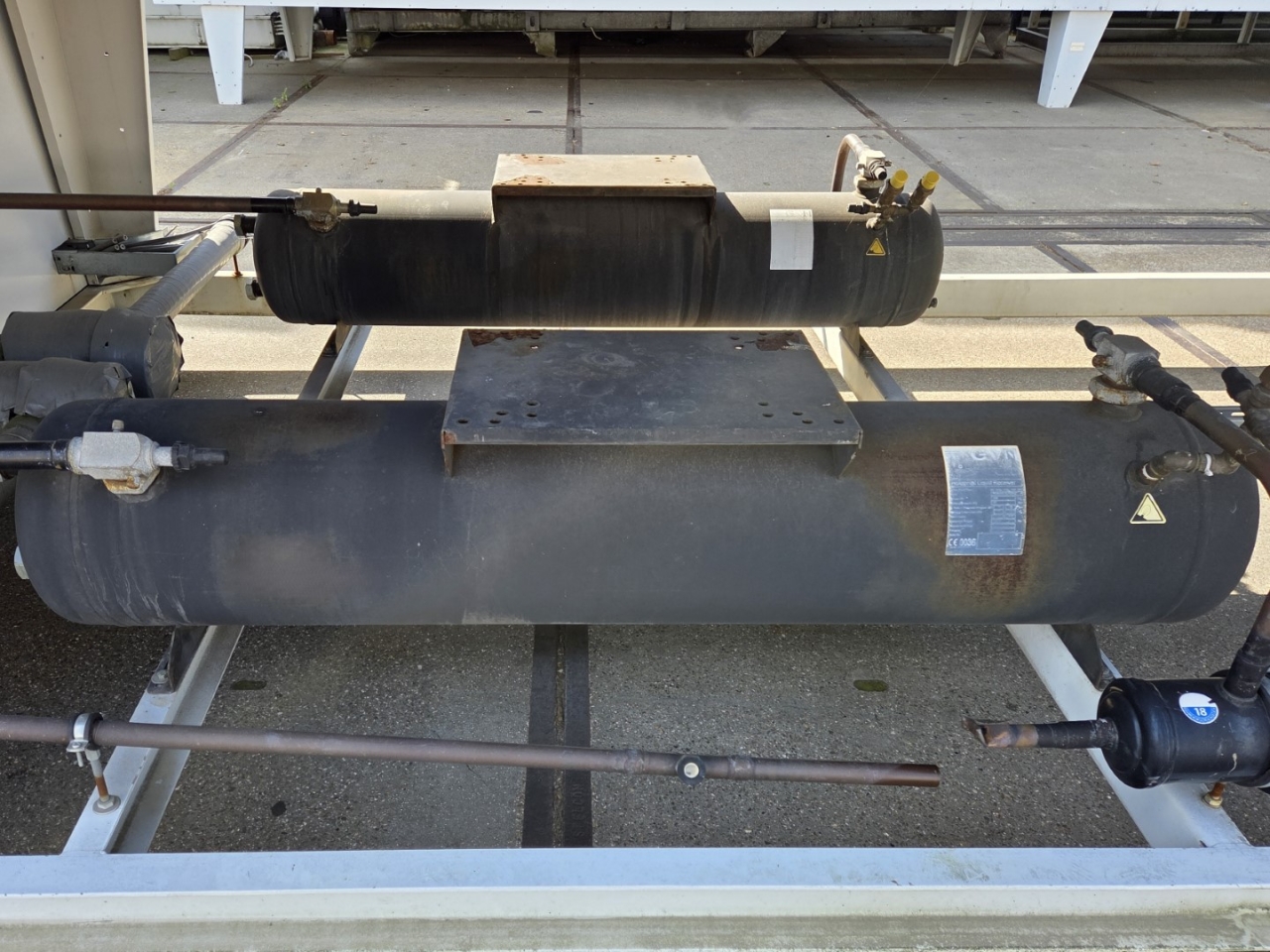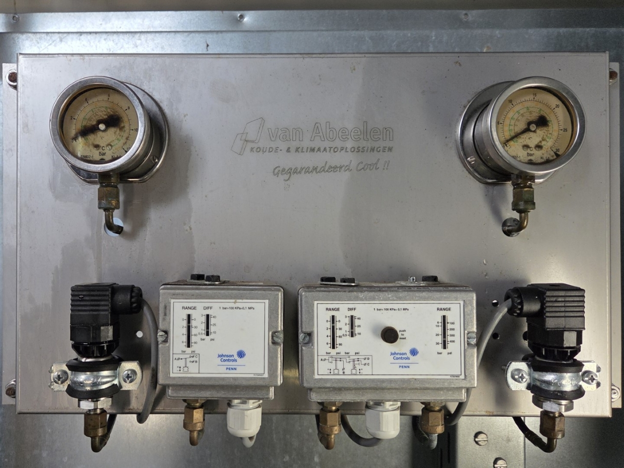 Gebruikte Bitzer condensorunit op Freon. Compleet met twee Bitzer 6FE-44Y-40P semi-hermetische zuigercompressoren, een Güntner S-GVHG 080.4A/2x3-M(S) E condensor met zes ventilatoren - 800 mm diameter, twee GVN horizontale vloeistofvaten HLR-COOL-125x2 met een inhoud van 125 liter, druk- en veiligheidsschakelaars/manometers, een schakelkast en twee Güntner schakelpanelen. De compressoren hebben een slagvolume van 304 m³/u bij 50 Hz en 366 m³/u bij 60 Hz.