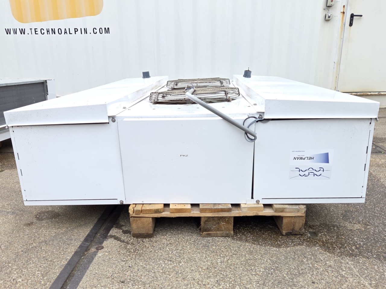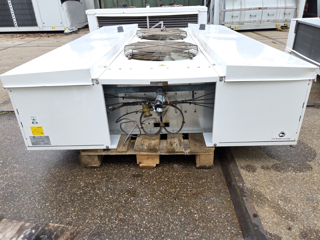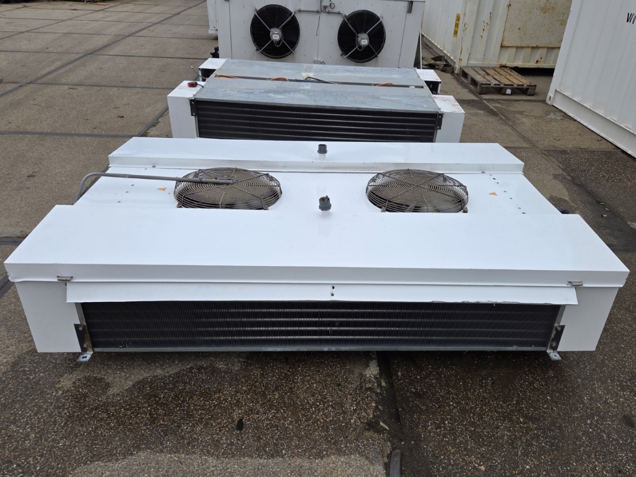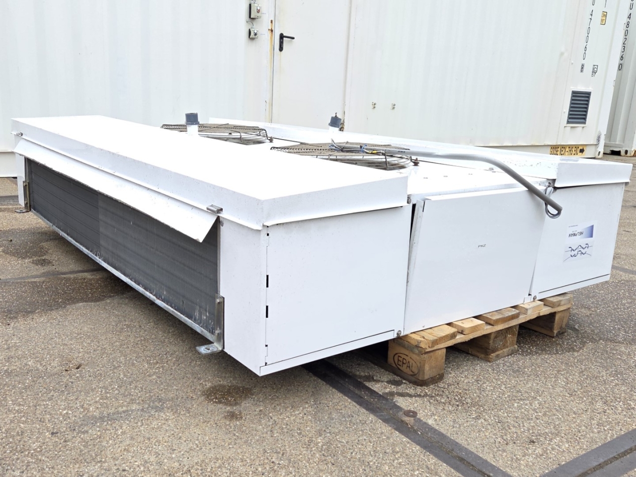 Gebruikte Alfa Laval THORD-428-7-L-H2 freon-dubbele-uitblaasverdamper. Compleet met 2 ATB AFT 71/6B-7 ventilatoren - 50/60 Hz - 0,25 kW - 920/1120 tpm - diameter 508 mm.