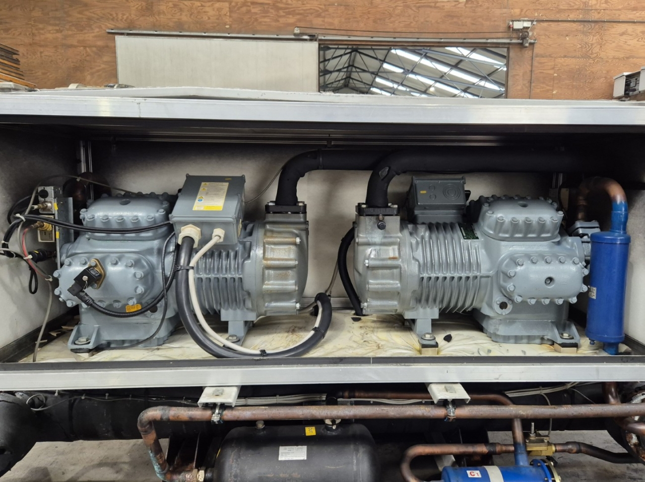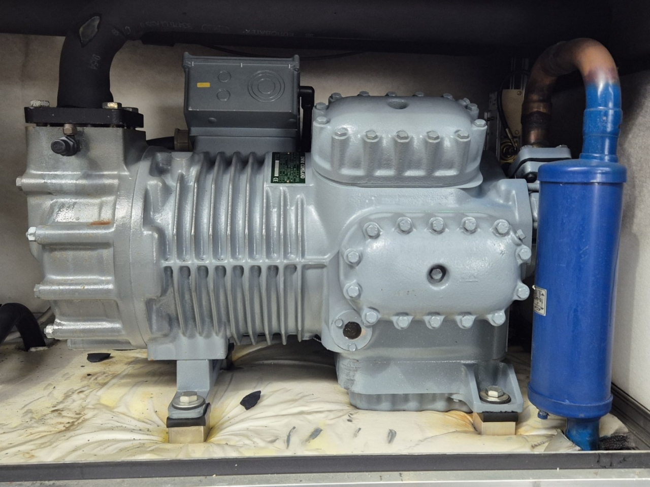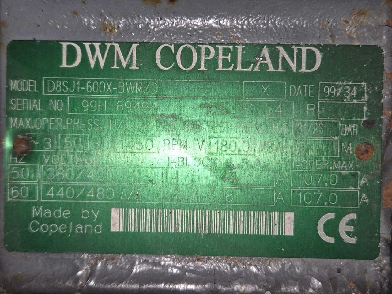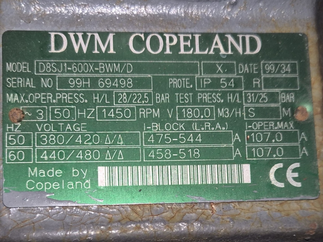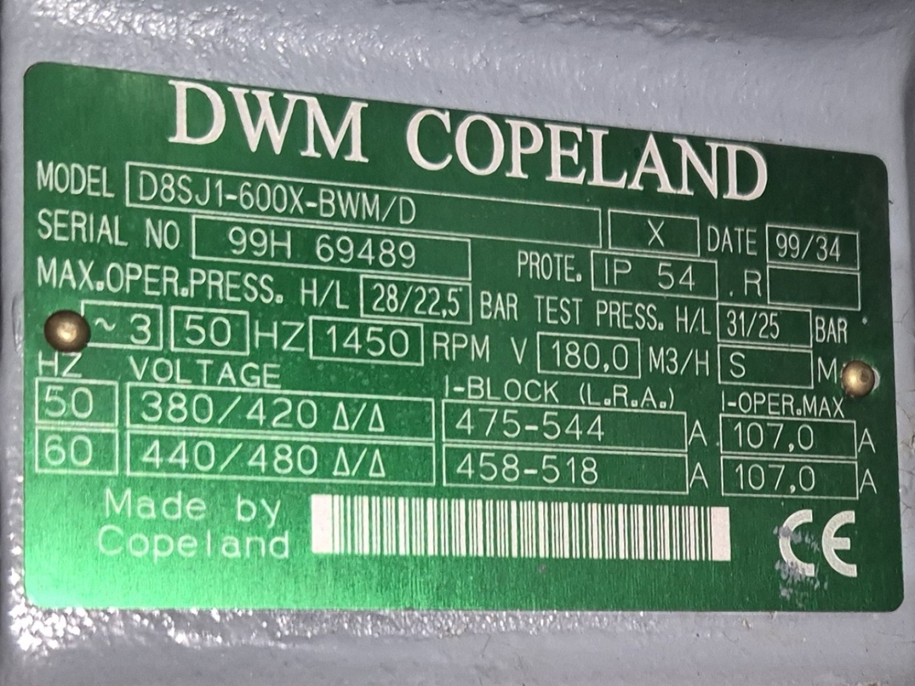 Gebruikte DWM D8SJ1-600X-BWM/D semi-hermetische zuigercompressor op freon met kijkglas. De compressor heeft een slagvolume van 180 m³/u.