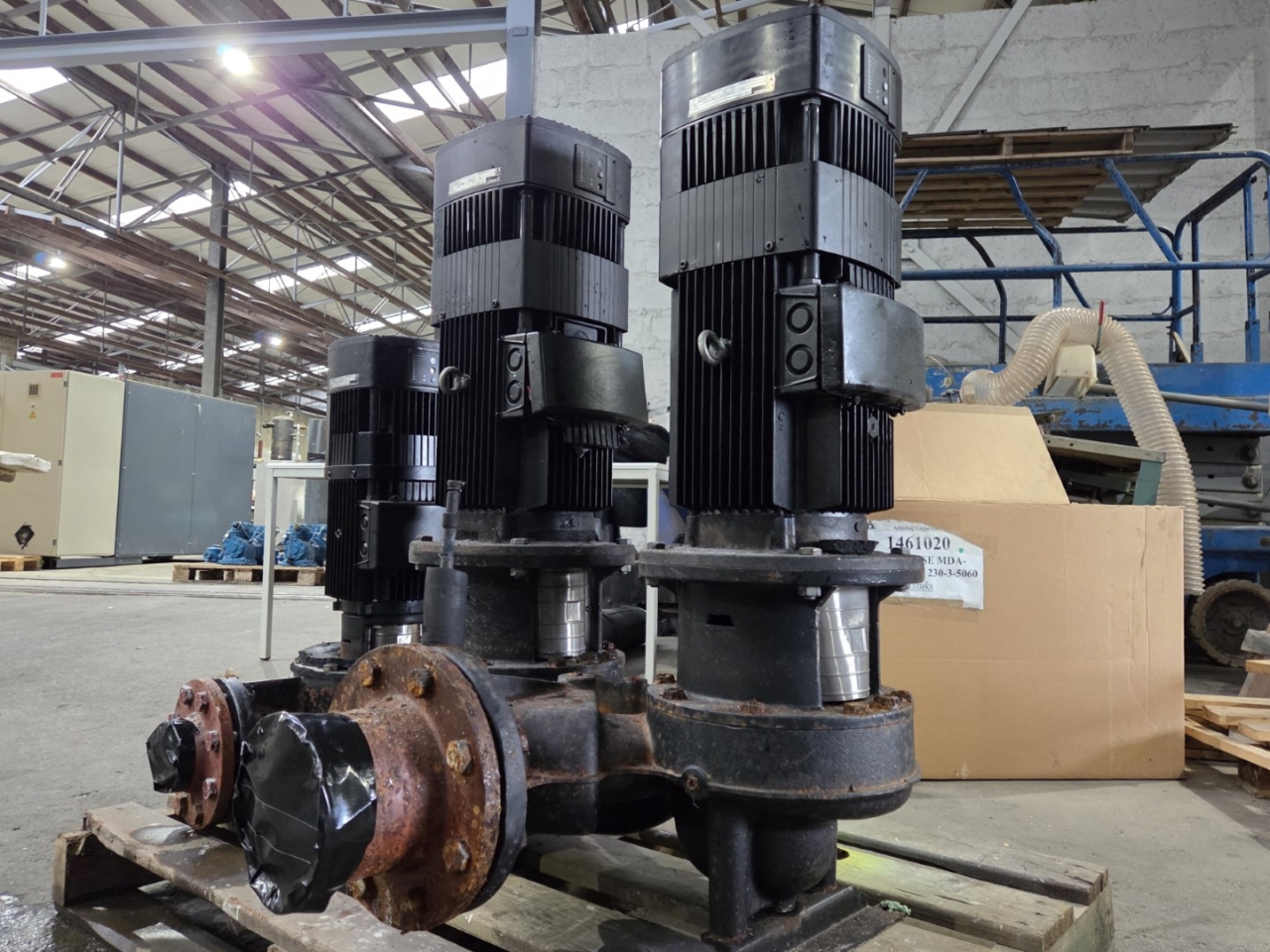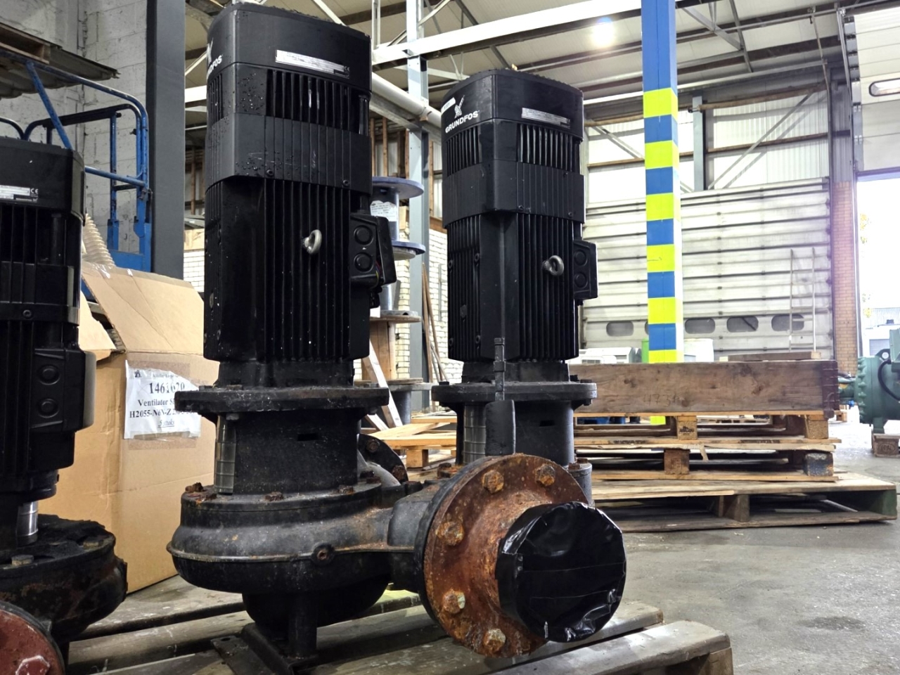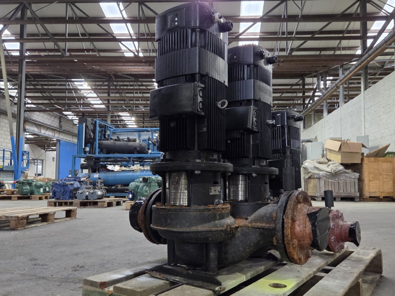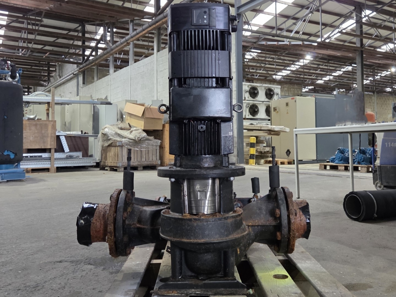 Gebruikte Grundfos LPDE 125-125/125 A-F-A-BBUE waterpomp, compleet met een Grundfos MGE132SB2-38FF265-B elektromotor 50/60 Hz - 5,5 kW - 2860 tpm. De pomp heeft de volgende specificaties: Qmax: 84,0 m³/u - Hmax: 15,0 m - Pmax: 5,5 kW. Afmetingen: 720x880x940 mm (lxbxh).