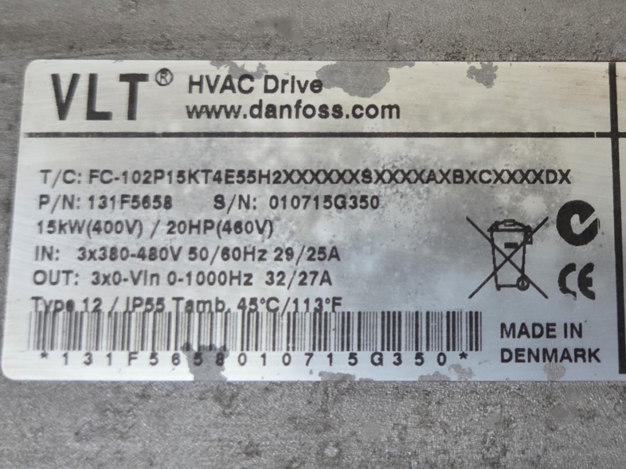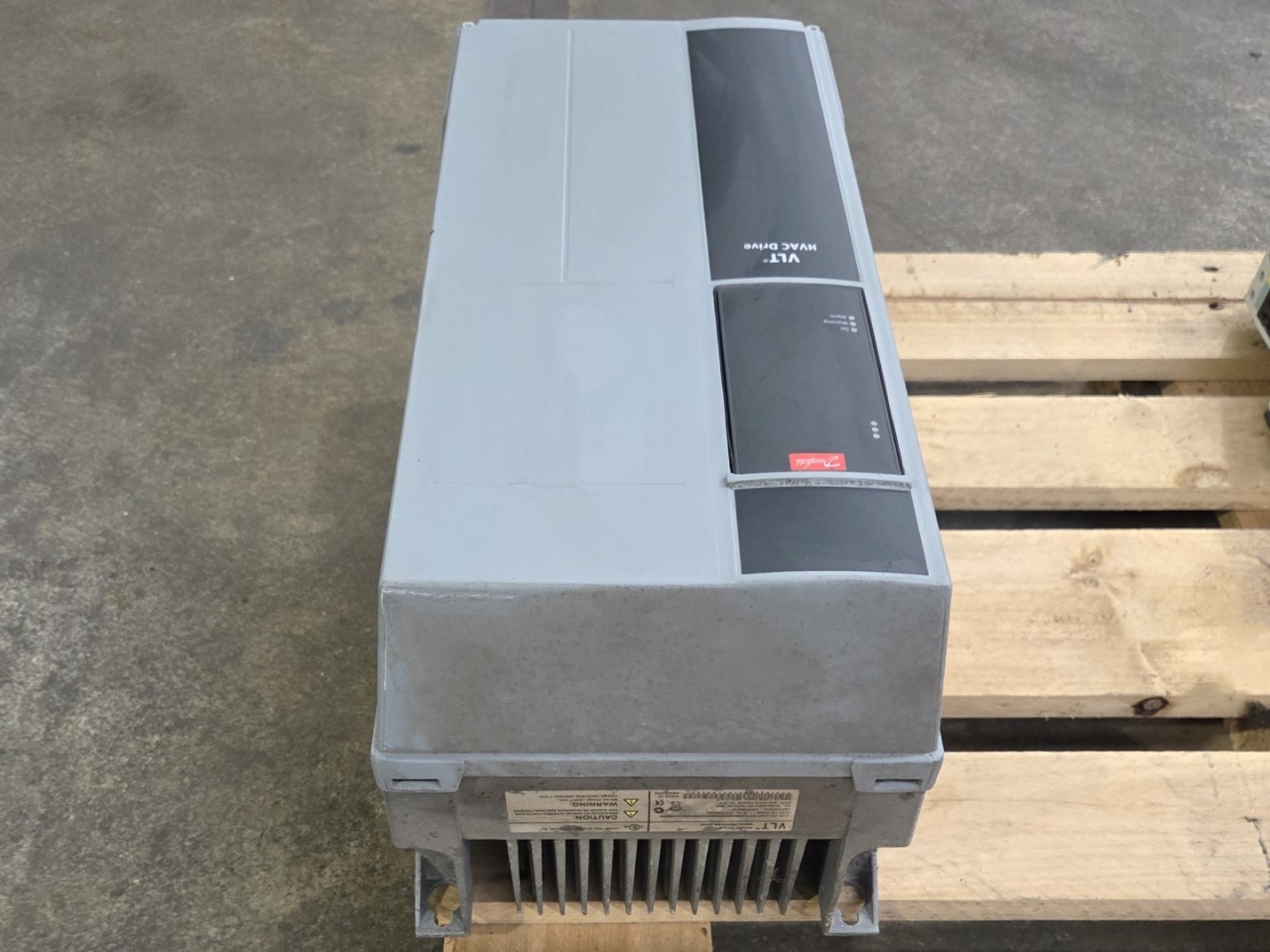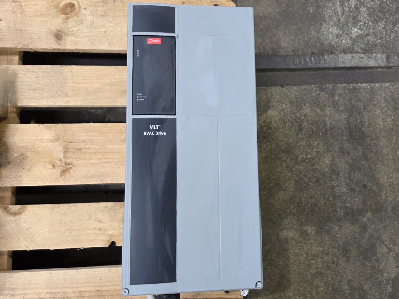 Gebruikte Danfoss VLT FC-102P15KT4E55H2 frequentieregelaar - 15 kW (400 V) / 20 pk (460 V). Onderdeelnr.: 131F5658. Afmetingen: 540 x 230 x 270 mm (LxBxH).