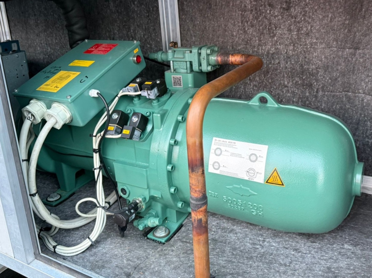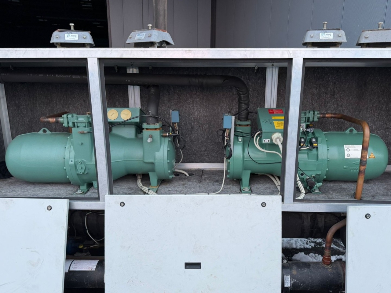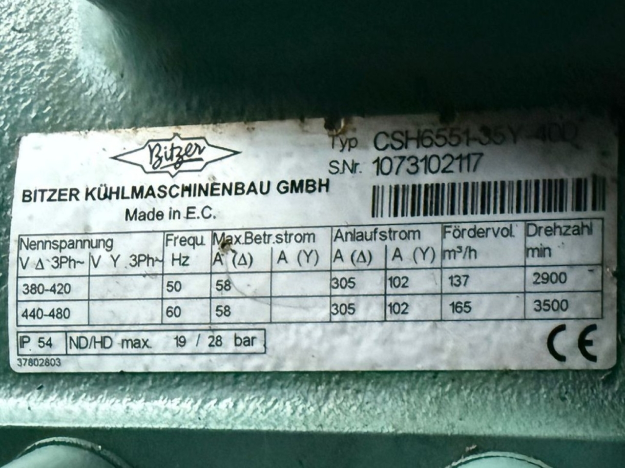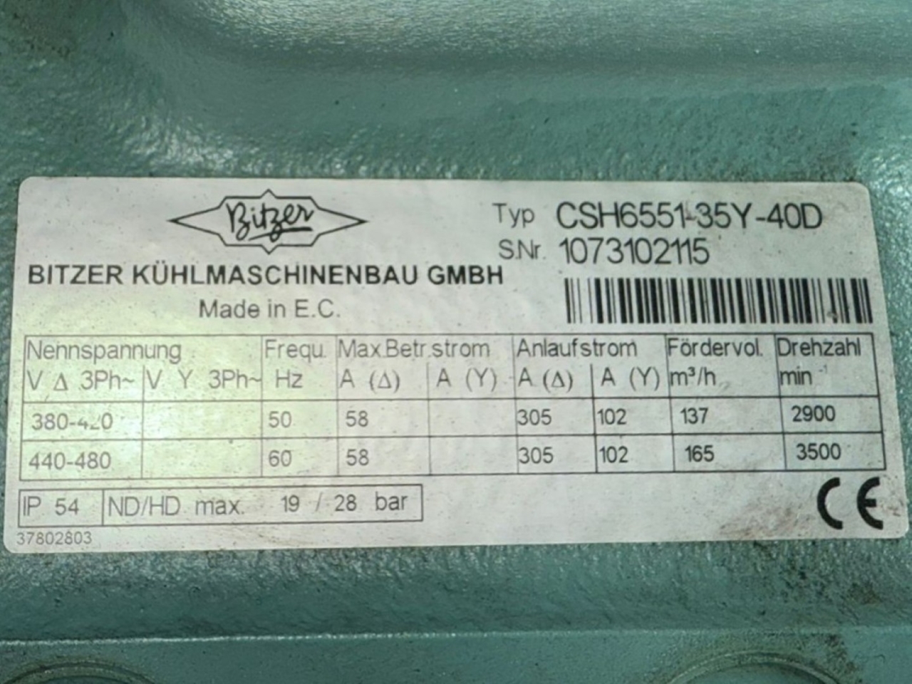 Gebruikte Bitzer CSH6551-35Y-40D semi-hermetische schroefcompressor op Freon met kijkglas. De compressor heeft een verplaatsing van 137 m³/h bij 50 Hz en 165 m³/h bij 60 Hz.