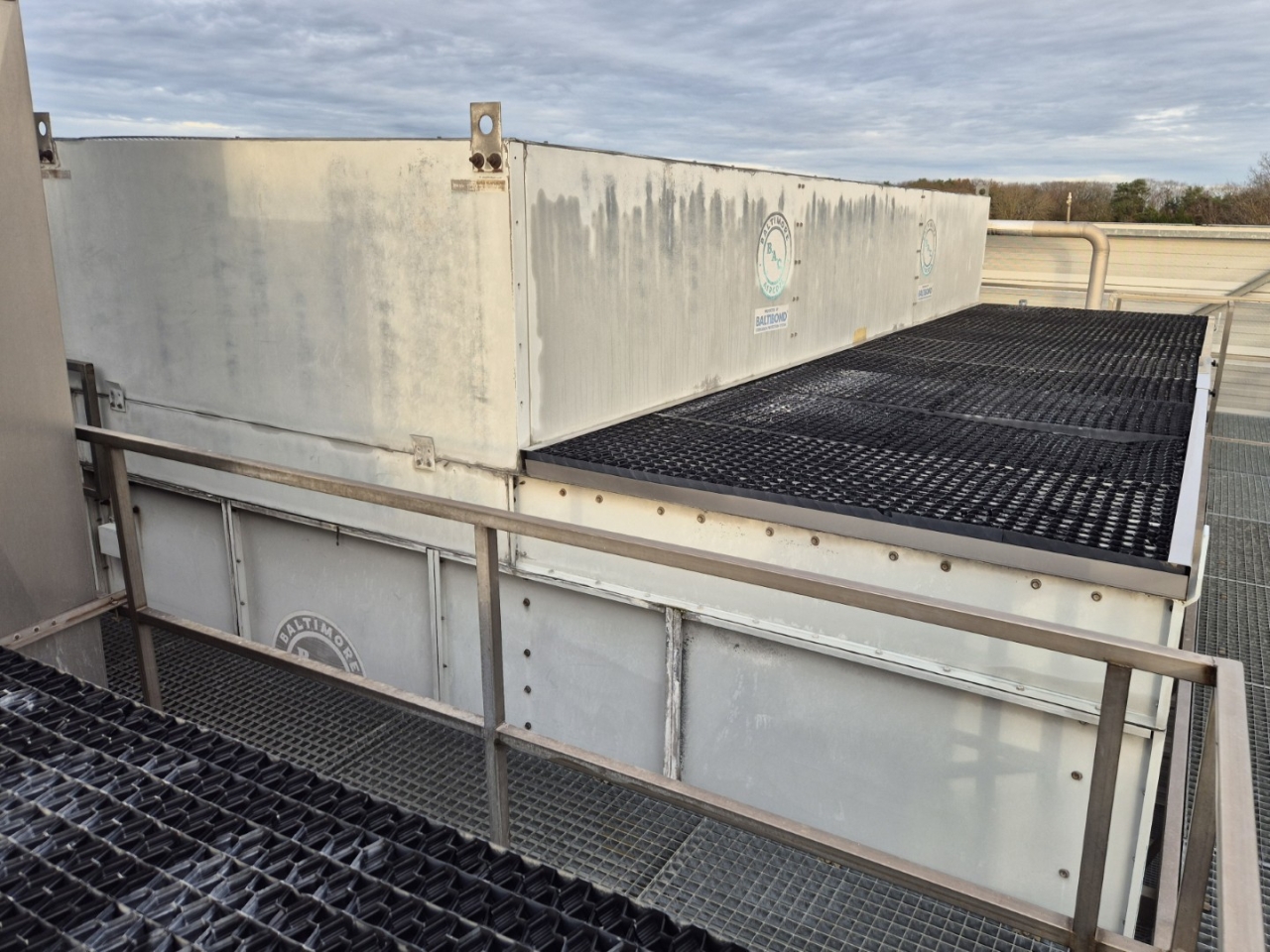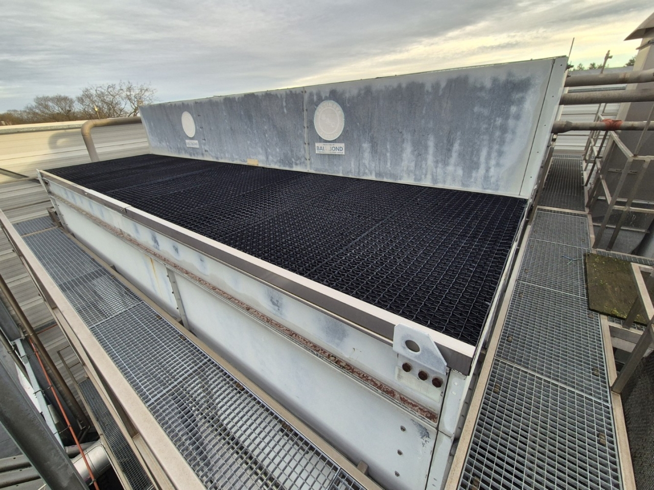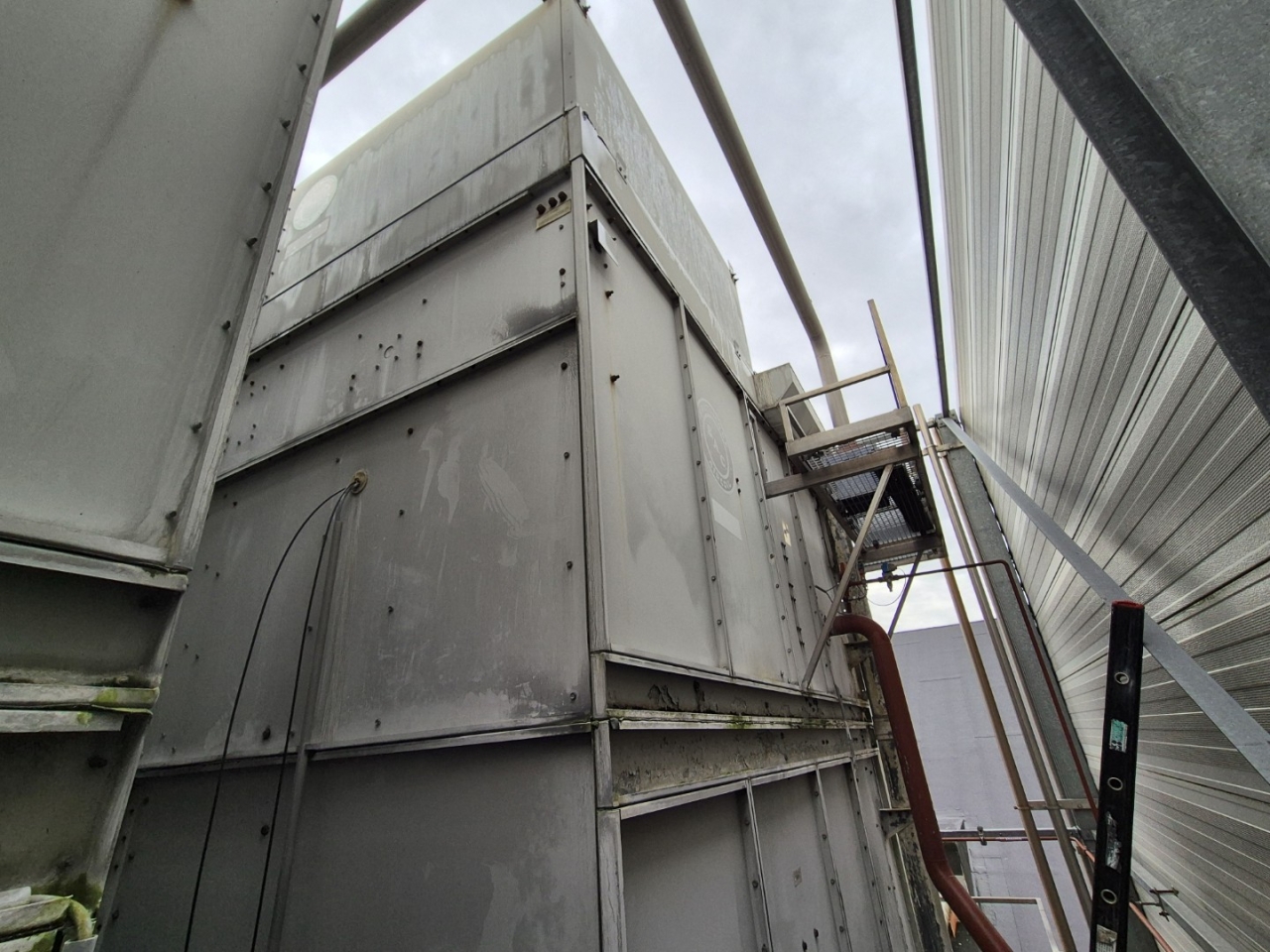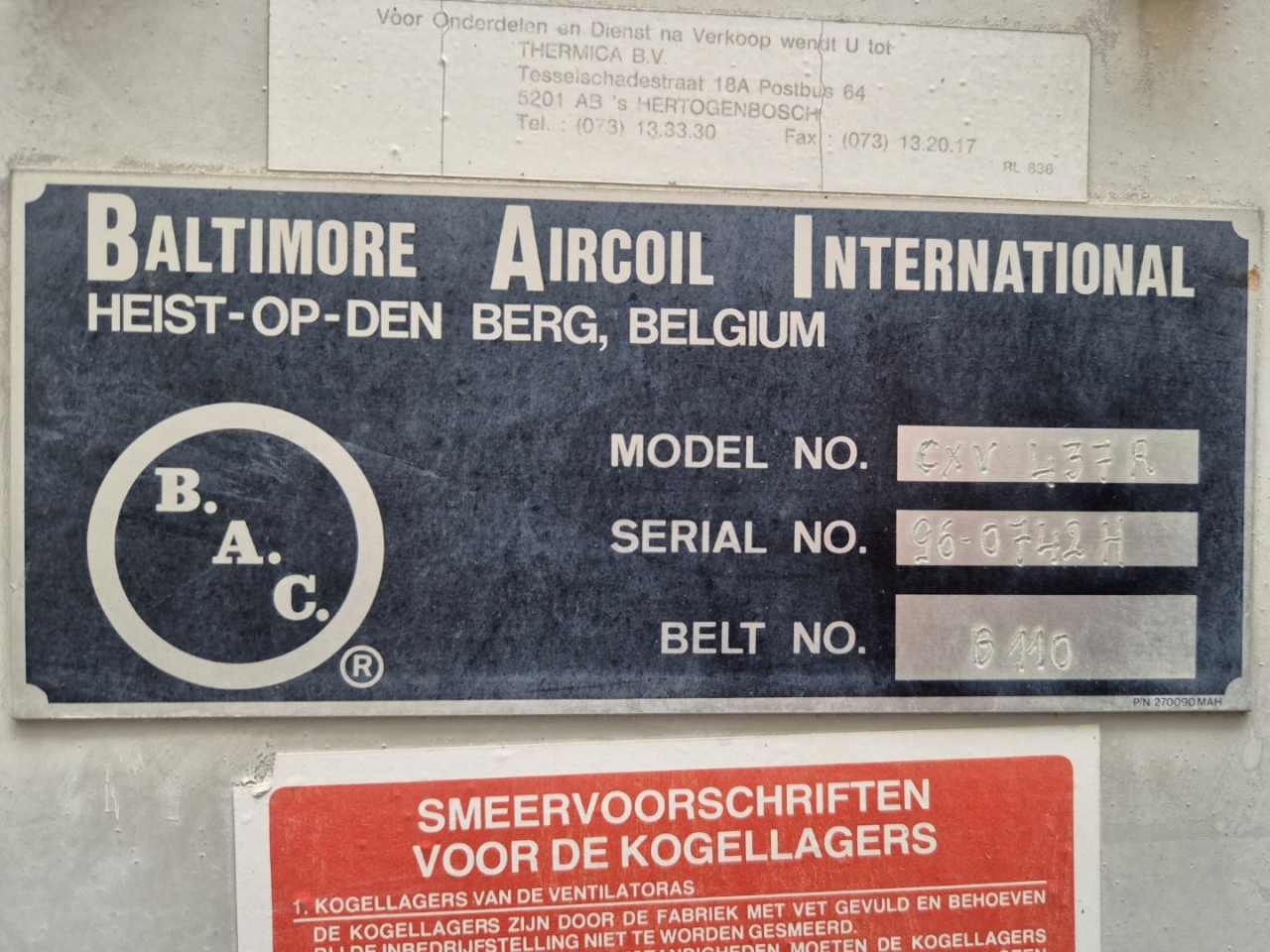 Gebruikte Baltimore CXV 437 R verdampingscondensor op NH3 (ammoniak). Compleet met 3 ventilatoren, elk aangedreven door een eigen elektromotor van 15 kW, die een luchtstroom van 192.960 m³/h produceren. Capaciteit van 1360 kW bij de volgende temperaturen: +30°C/+22°C.