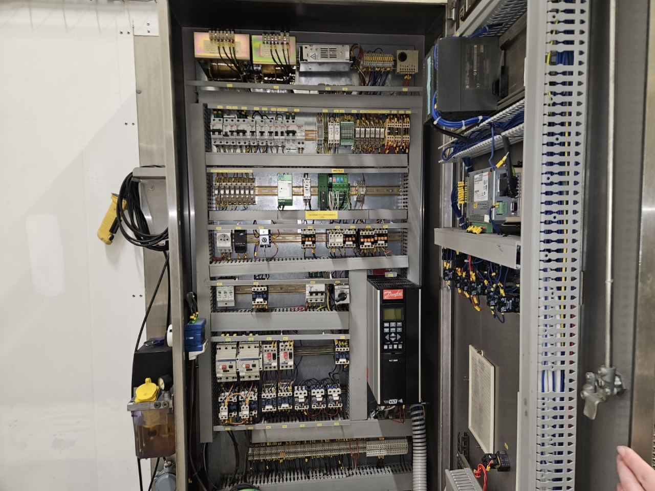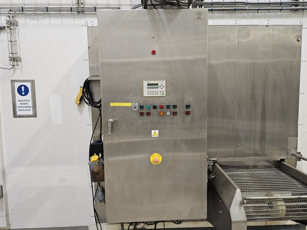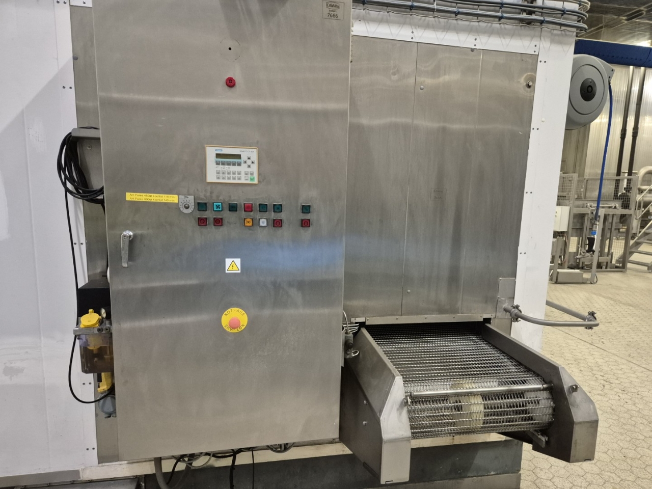 De vriezer wordt geleverd met een schakelkast voorzien van een Danfoss VLT 5000 frequentieregelaar en een Siemens Simatic C7-621 PLC. Deze geavanceerde besturingsconfiguratie maakt het mogelijk om de bedrijfsparameters nauwkeurig af te stemmen op verschillende producten en productieomstandigheden, wat flexibiliteit en consistente vriesresultaten garandeert.