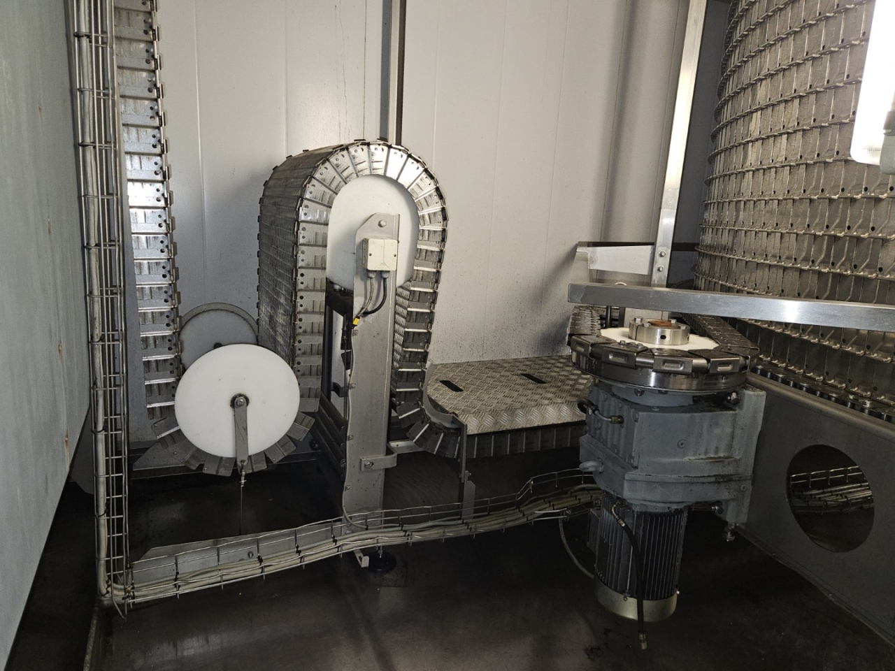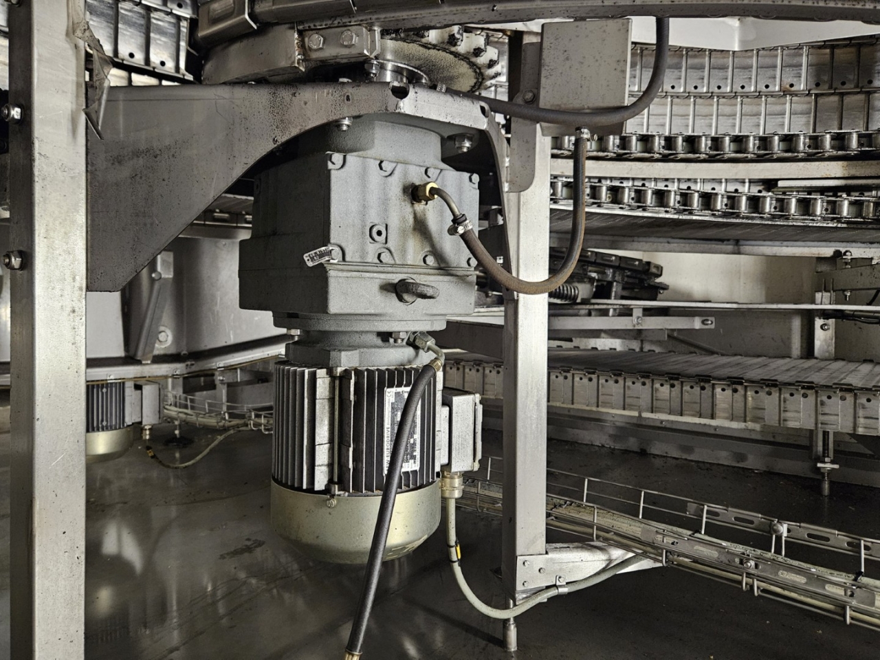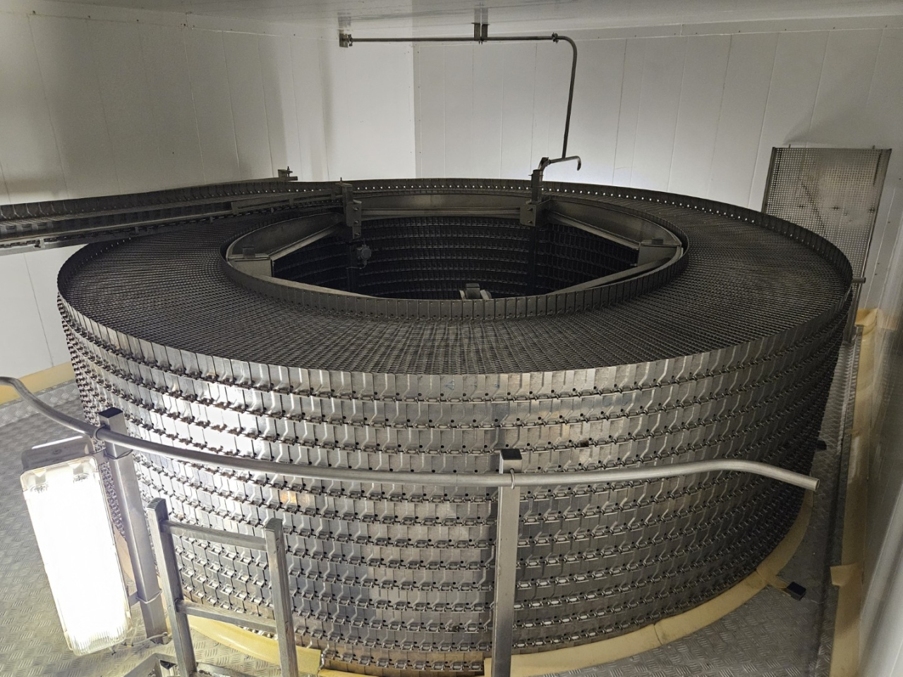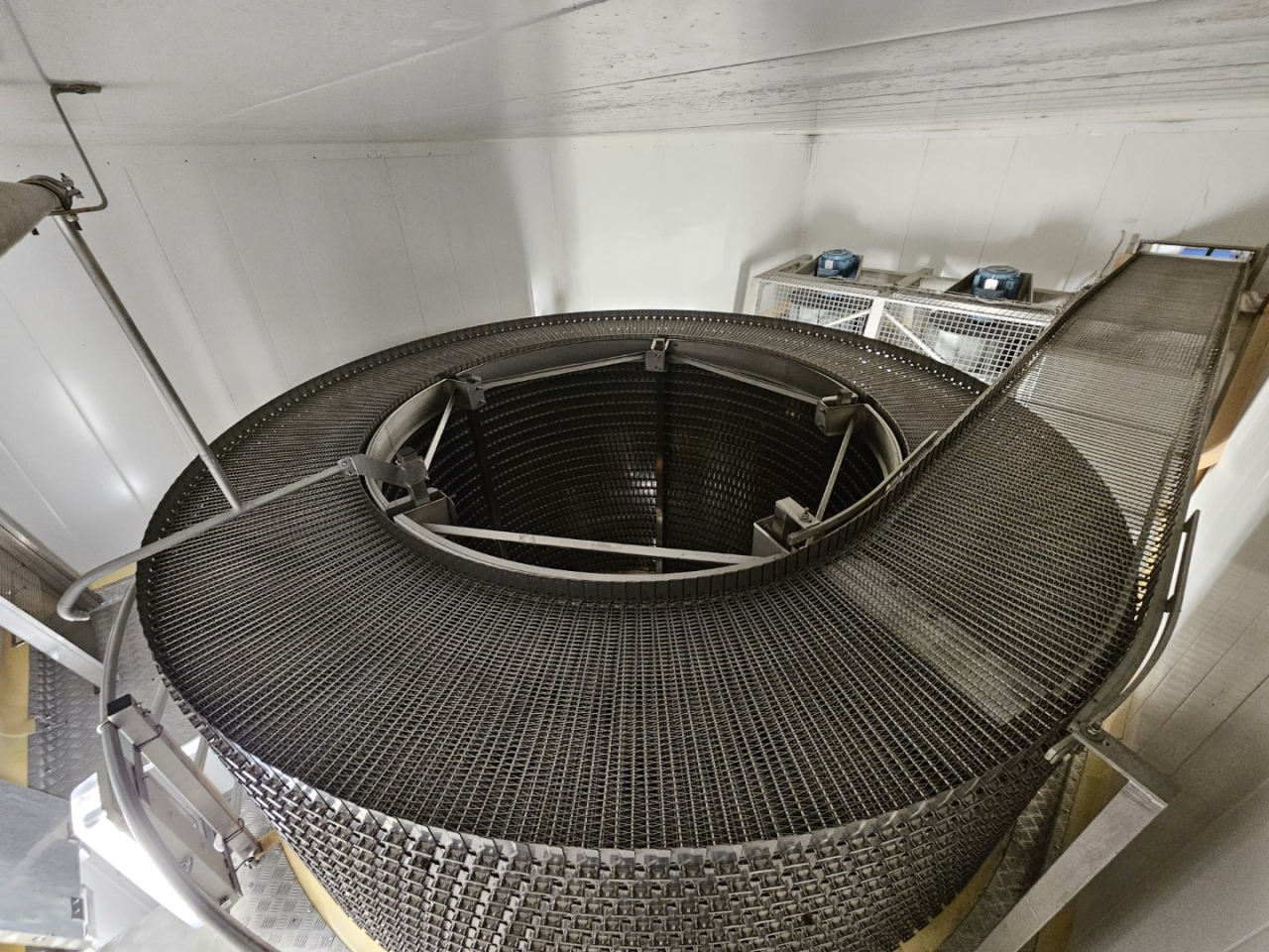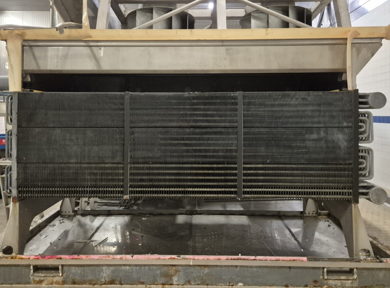 De Frigoscandia spiraalvriezer is uitgerust met een roestvrijstalen transportband van circa 335 meter lang, wat een totaal vriesoppervlak van ongeveer 170 m² oplevert. Met een invoerhoogte van circa 880 mm kan het systeem eenvoudig worden geïntegreerd in bestaande productielijnen. De band wordt aangedreven door een SEW-EURODRIVE R87F DV100L4 elektromotor, wat een stabiele en betrouwbare werking garandeert.