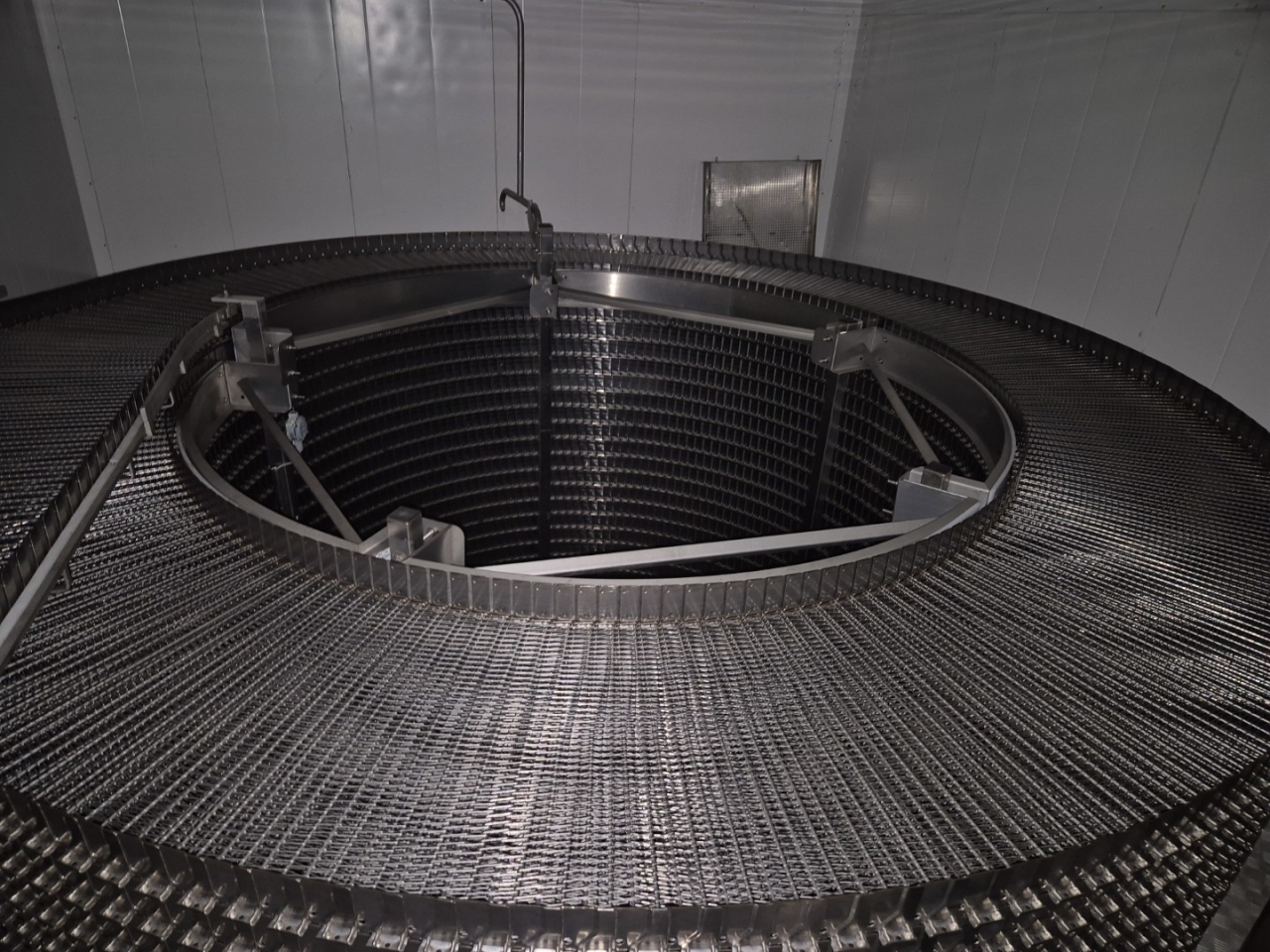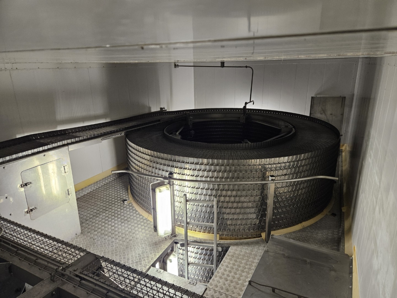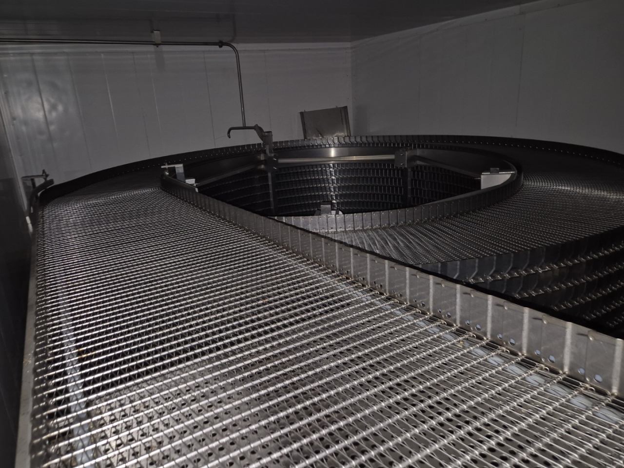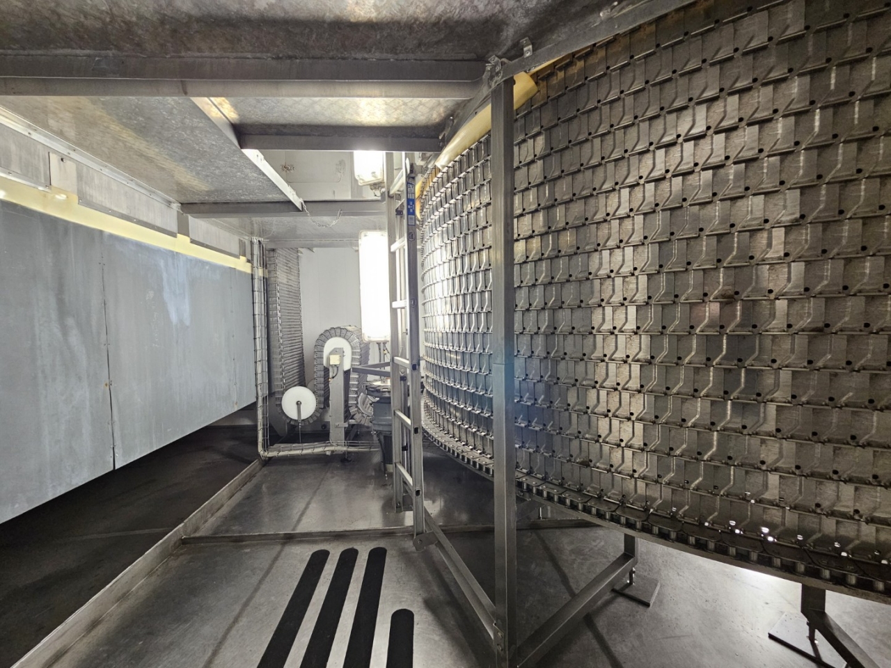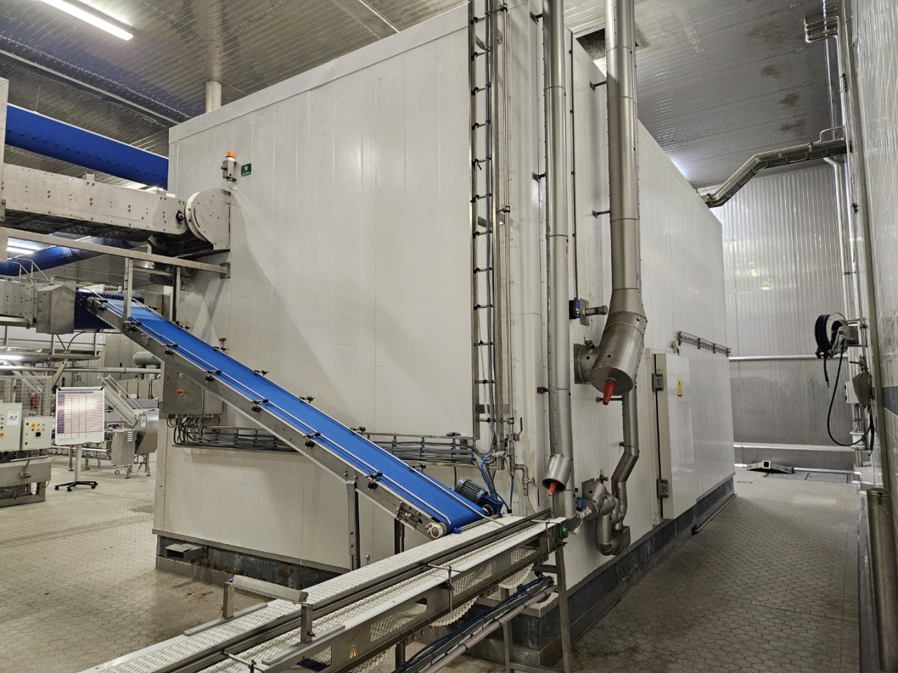 De Frigoscandia spiraalvriezer is uitgerust met een roestvrijstalen transportband van circa 335 meter lang, wat een totaal vriesoppervlak van ongeveer 170 m² oplevert. Met een invoerhoogte van circa 880 mm kan het systeem eenvoudig worden geïntegreerd in bestaande productielijnen. De band wordt aangedreven door een SEW-EURODRIVE R87F DV100L4 elektromotor, wat een stabiele en betrouwbare werking garandeert.