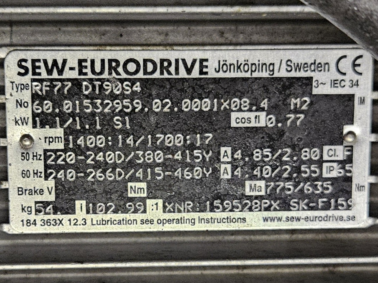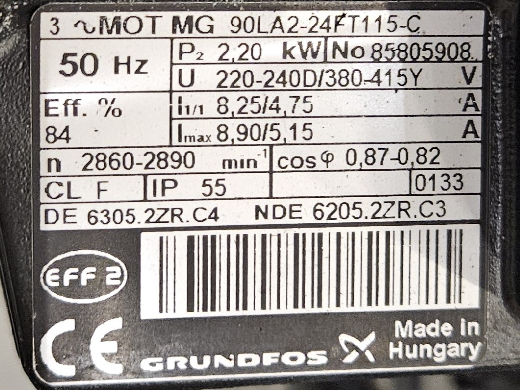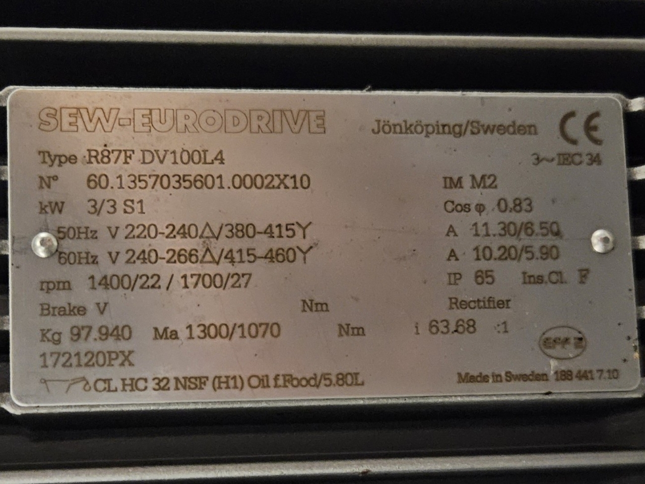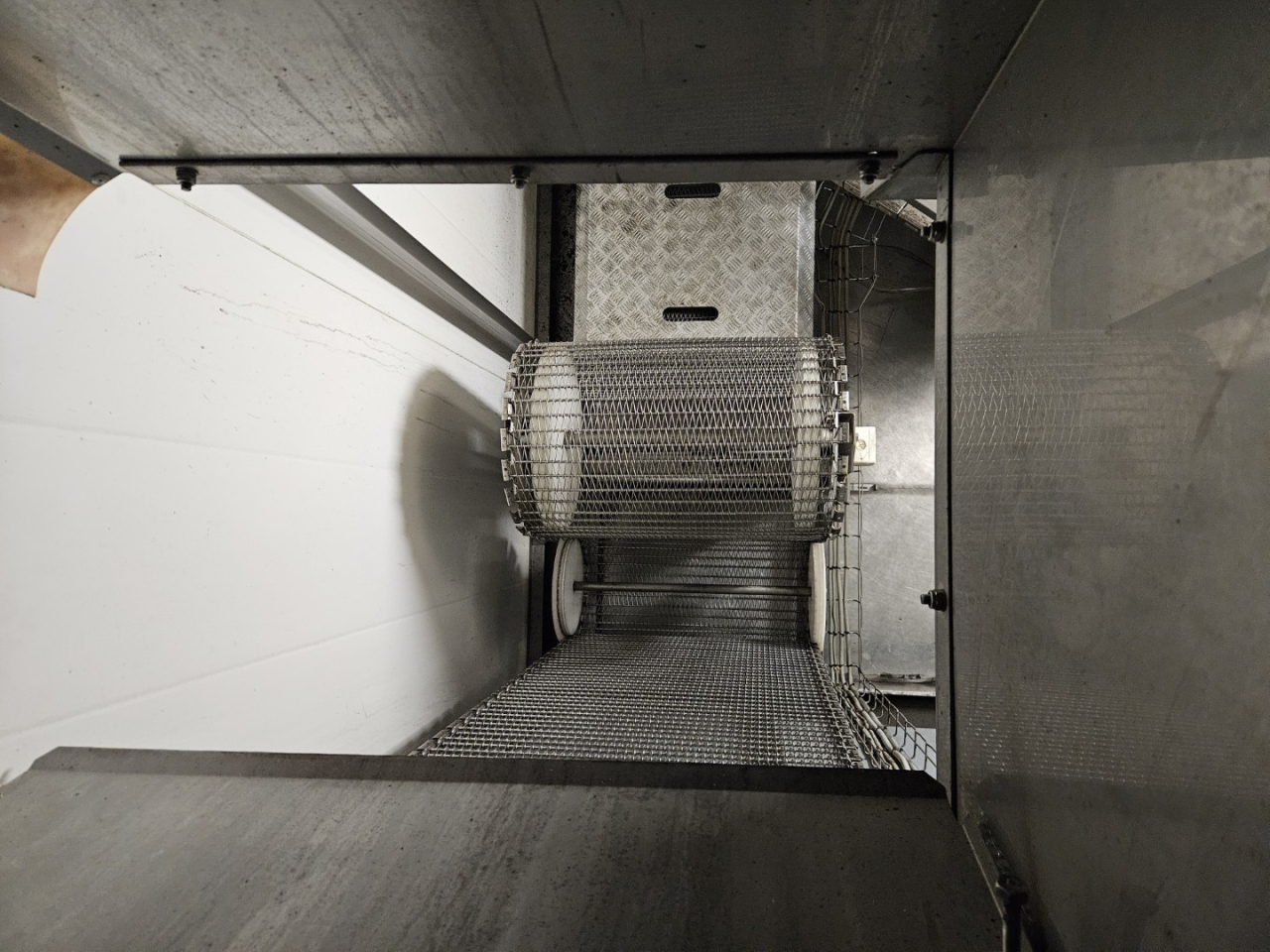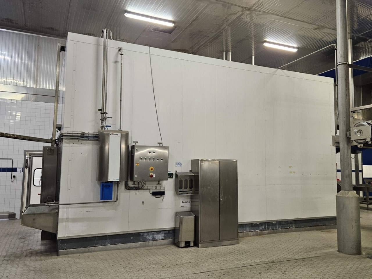 De Frigoscandia spiraalvriezer is uitgerust met een roestvrijstalen transportband van circa 335 meter lang, wat een totaal vriesoppervlak van ongeveer 170 m² oplevert. Met een invoerhoogte van circa 880 mm kan het systeem eenvoudig worden geïntegreerd in bestaande productielijnen. De band wordt aangedreven door een SEW-EURODRIVE R87F DV100L4 elektromotor, wat een stabiele en betrouwbare werking garandeert.