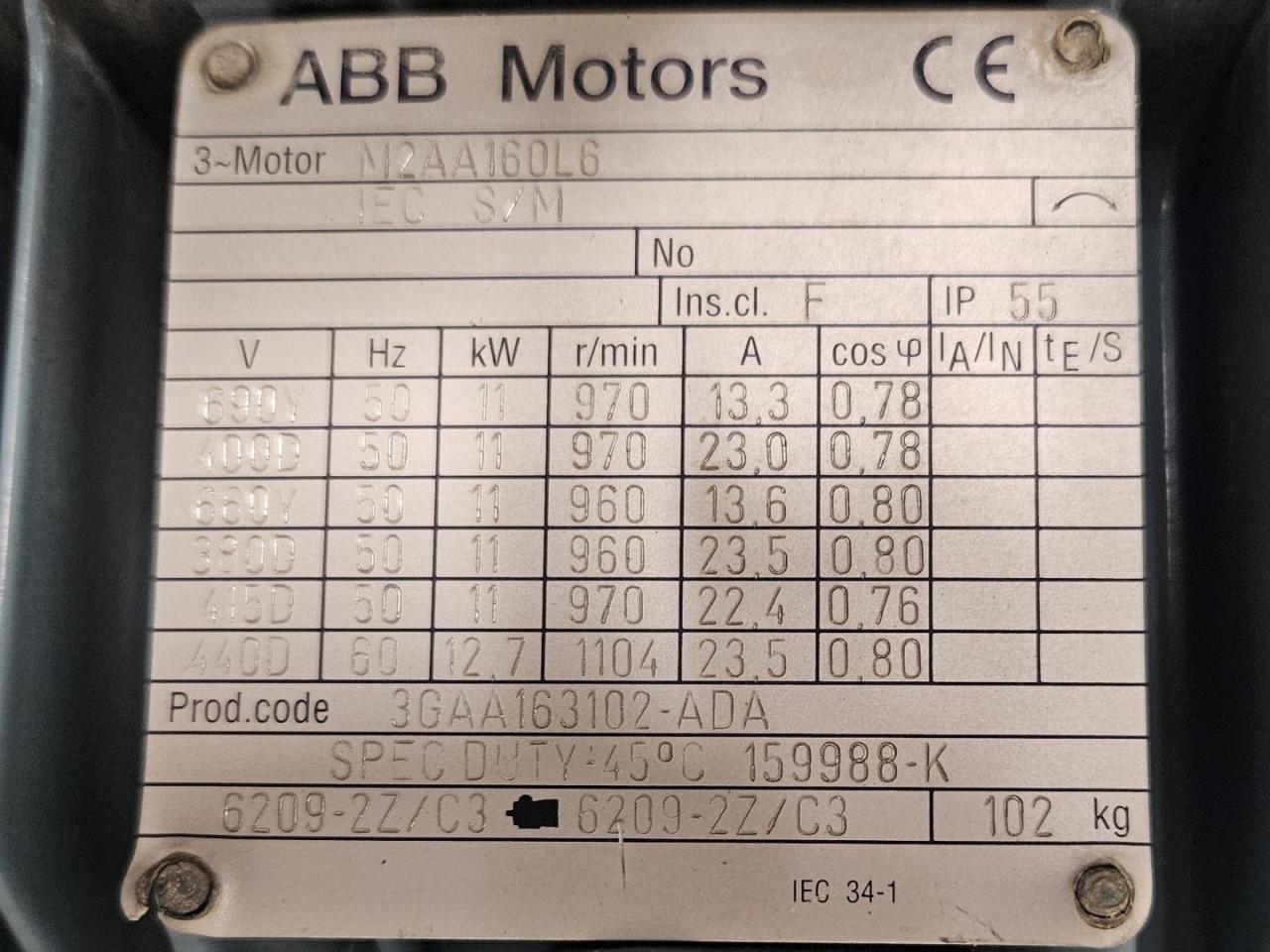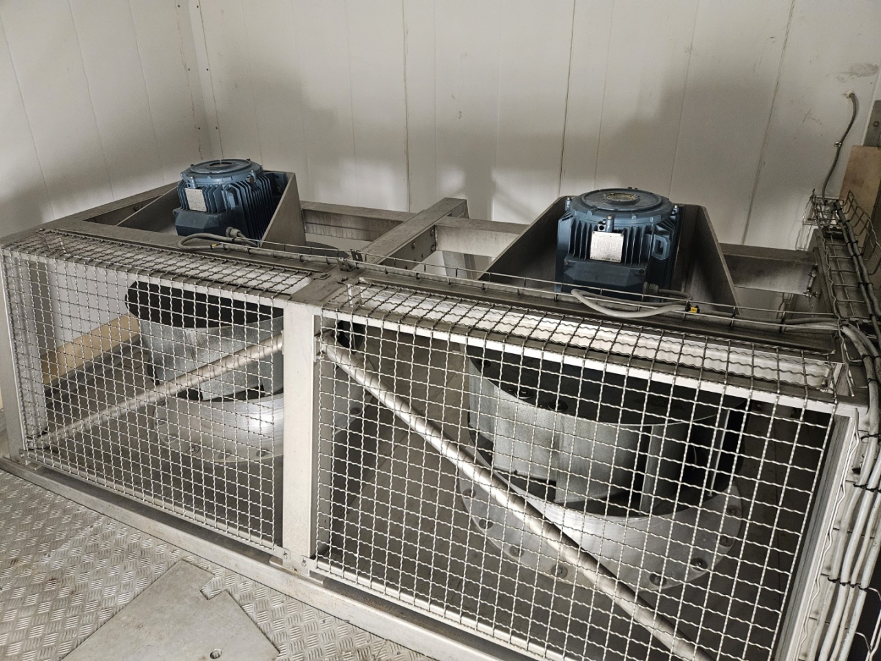 De complete set omvat tevens een NH₃-verdamper met luchtstroom gegenereerd door twee centrifugaalventilatoren, aangedreven door een ABB M2AA160L6 elektromotor (50 Hz, 11 kW, 970 tpm). Deze configuratie zorgt voor een efficiënte luchtcirculatie en uniforme vriesprestaties in het gehele systeem.