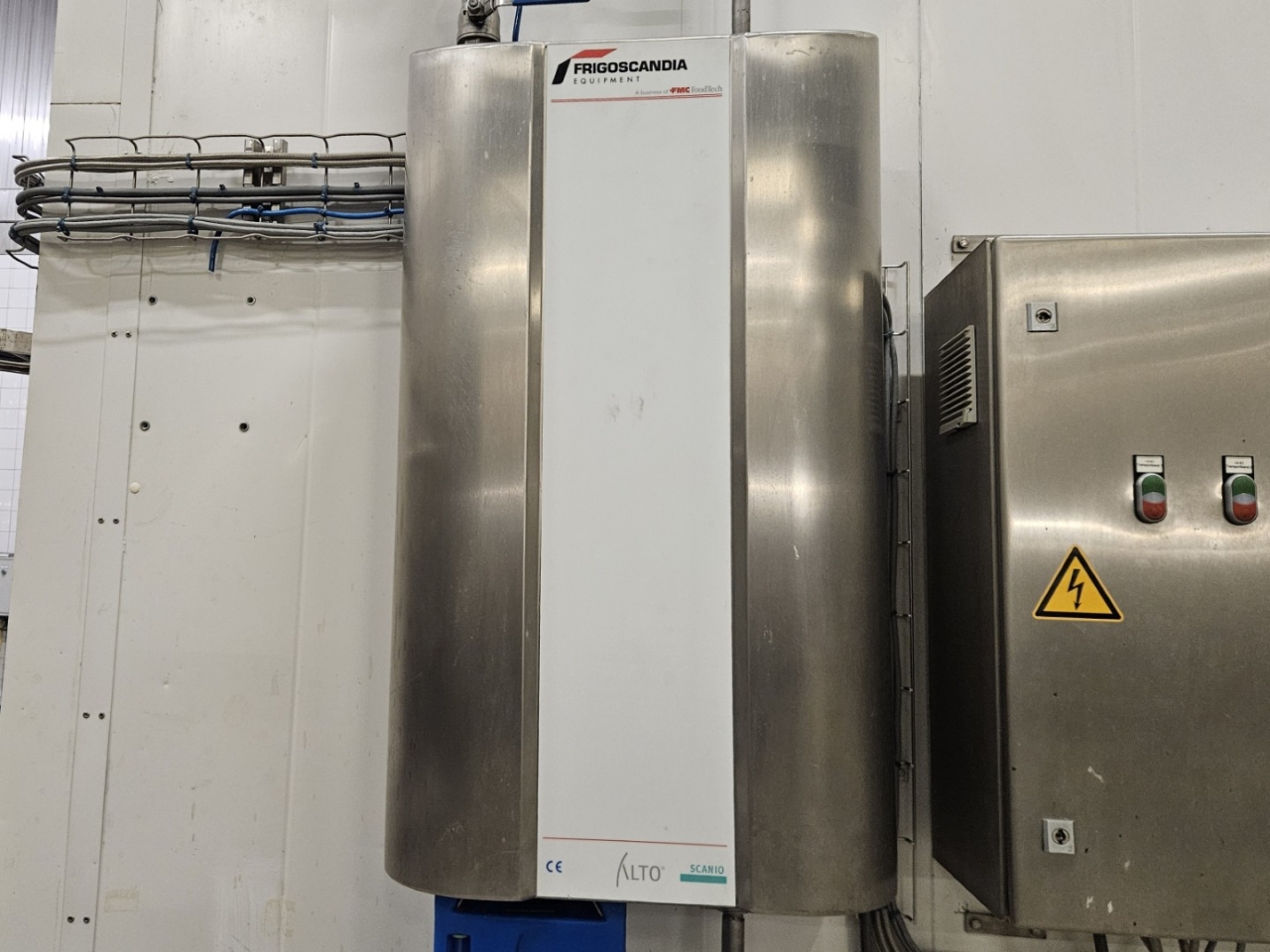 Deze machine is geconfigureerd met een noord-zuid (NS) invoer en uitvoer en een rotatie tegen de klok in (CCR), waardoor eenvoudige integratie in bestaande productielijnen mogelijk is. De Frigoscandia Classic-serie is gebouwd voor industriële omgevingen en staat bekend om zijn robuuste constructie, hygiënisch ontwerp en lange levensduur.