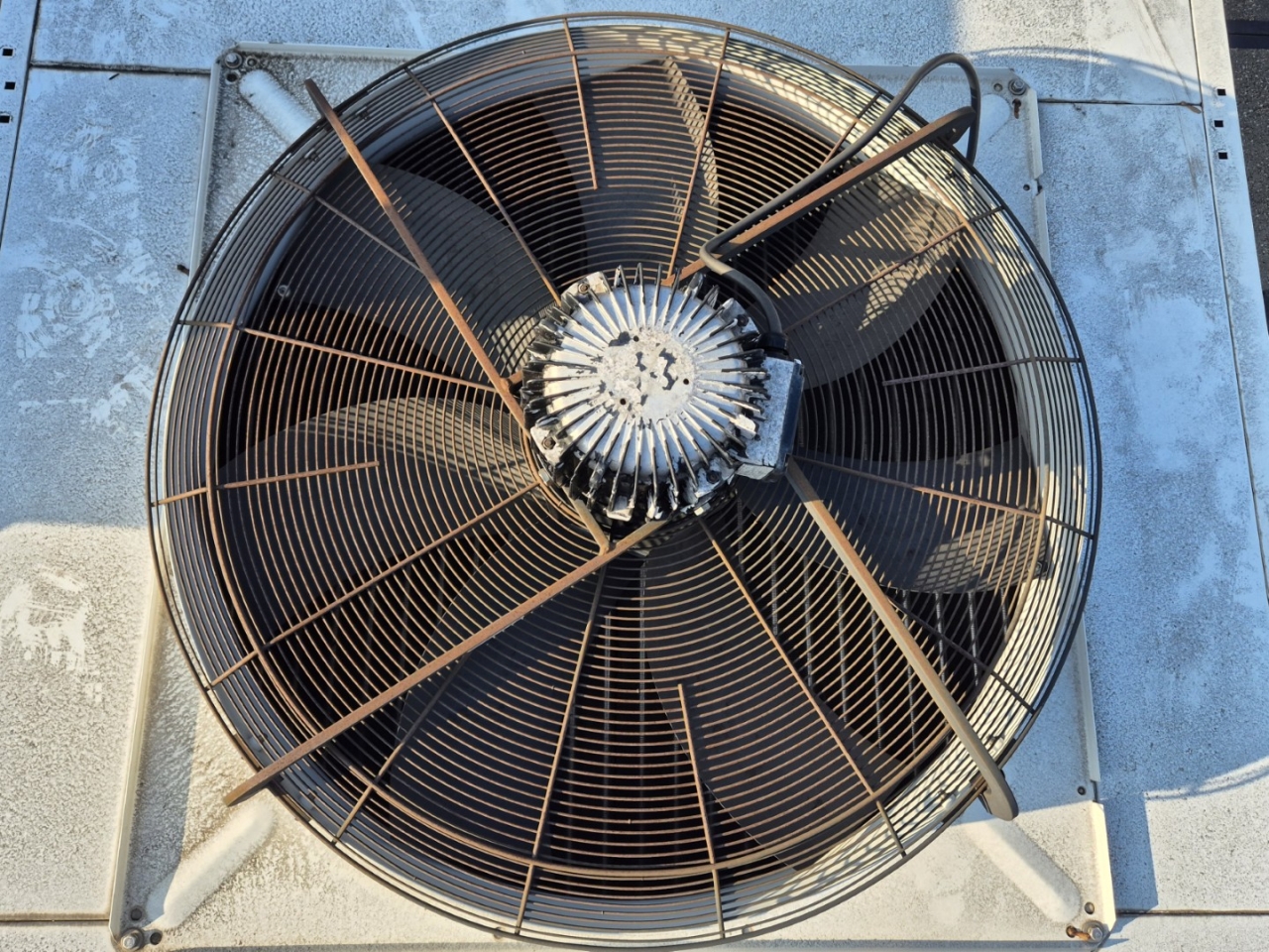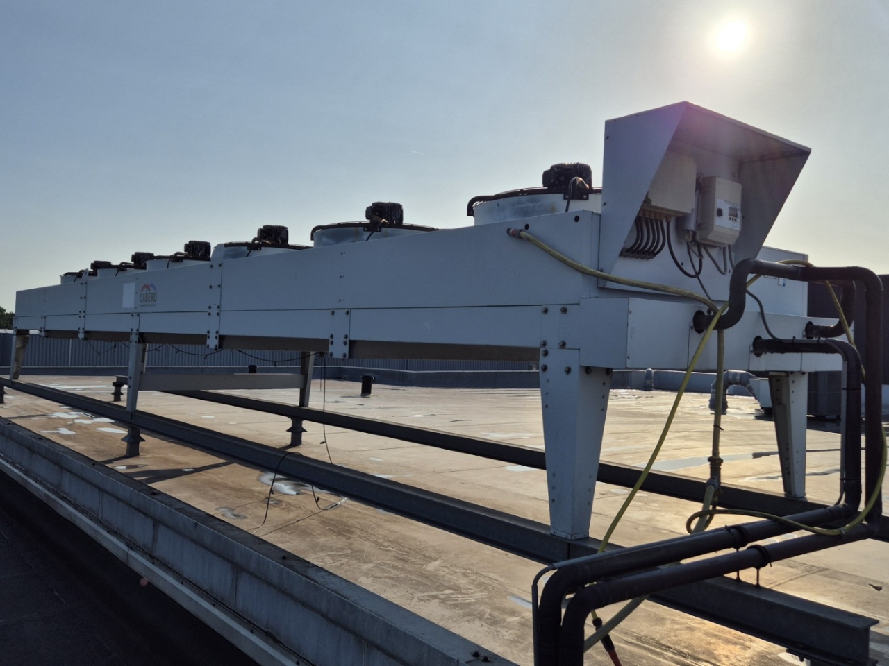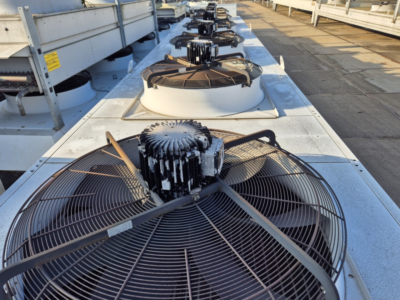 Gebruikte Cabero AC-HND 107MB/6E luchtgekoelde condensor op Freon. Compleet met 6 Süd-Electric MDB-T3100-PNS-N ventilatoren - 50 Hz - 0,30/0,68 kW - 240/410 RPM - diameter 1000 mm en een totale luchtstroom van 65.352 m³/h. De ventilatoren kunnen worden aangestuurd door een Ziehl-Abegg controller.
