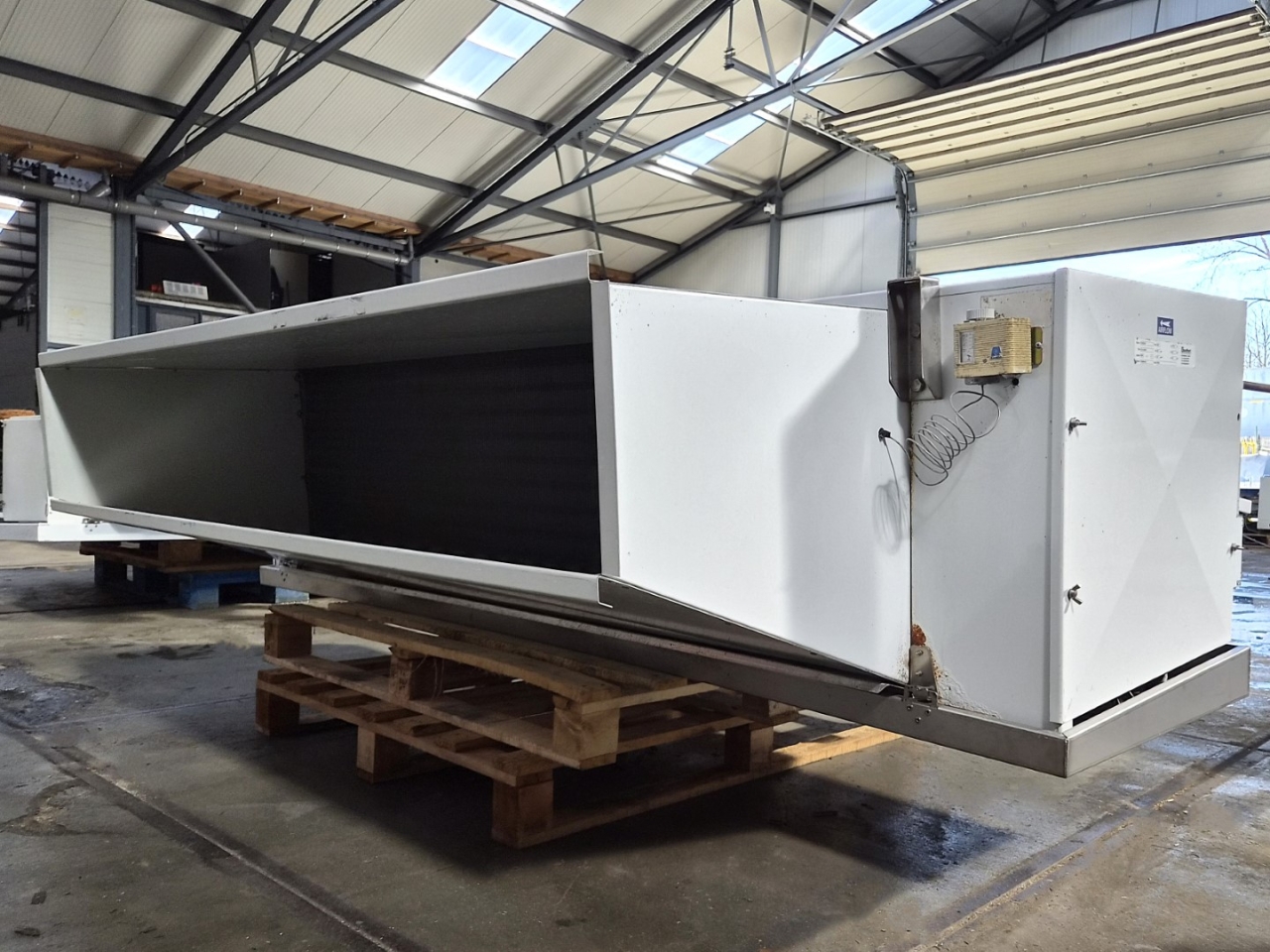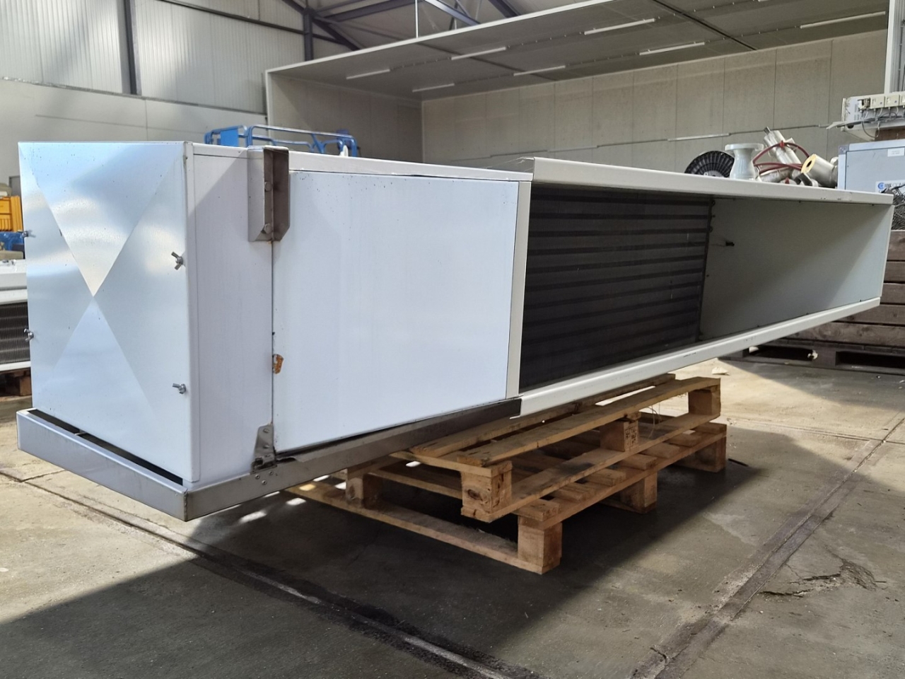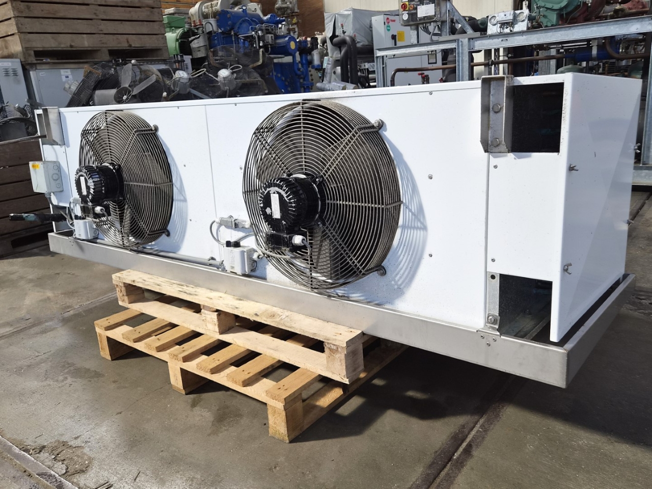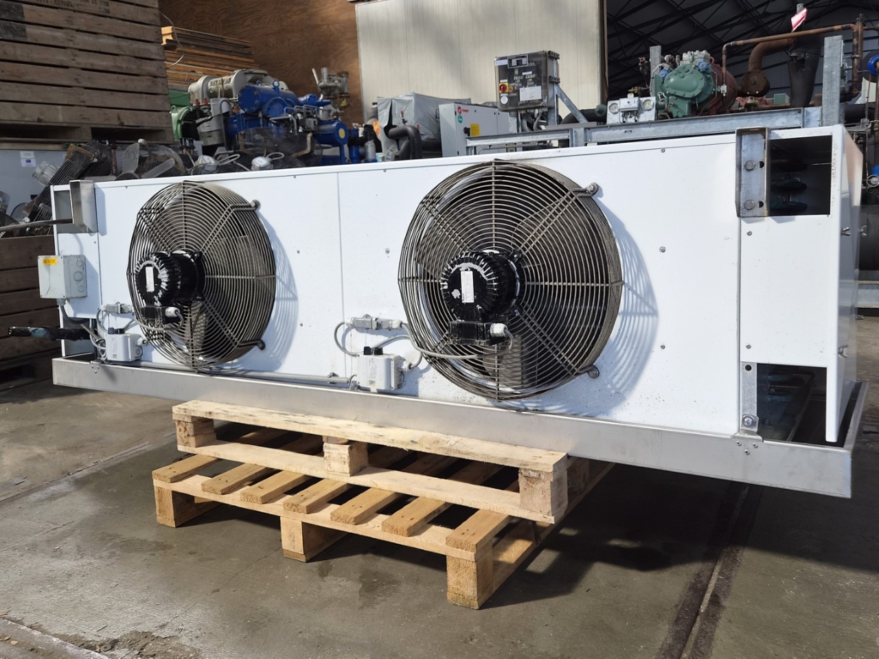 Gebruikte Goedhart VCI-C-62507 Freon-verdamper met elektrische ontdooiing. Compleet met 2 Süd-Electric MDA-P2055-NVN-N ventilatoren: 50 Hz - 0,66/0,88 kW - 1050/1380 tpm - diameter 500 mm en een totale luchtstroom van 14.135 m³/h.
