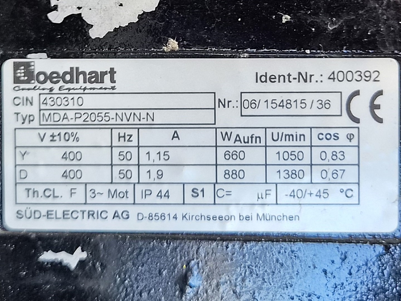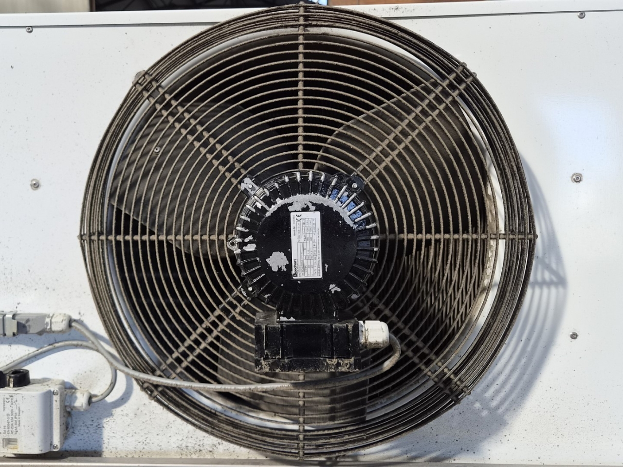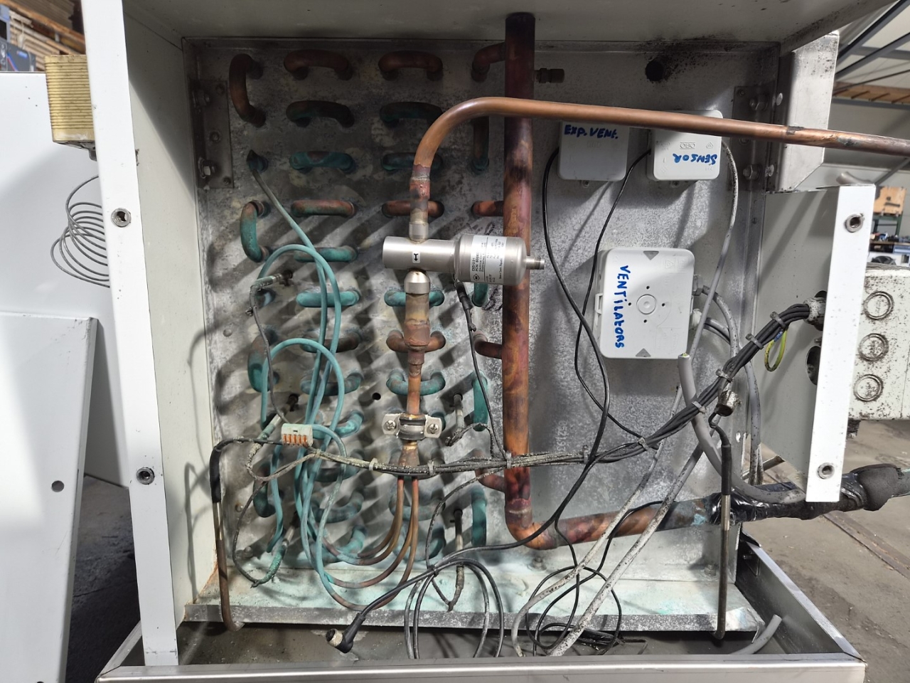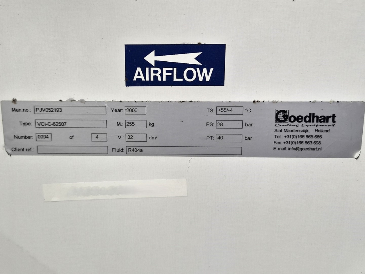 Gebruikte Goedhart VCI-C-62507 Freon-verdamper met elektrische ontdooiing. Compleet met 2 Süd-Electric MDA-P2055-NVN-N ventilatoren: 50 Hz - 0,66/0,88 kW - 1050/1380 tpm - diameter 500 mm en een totale luchtstroom van 14.135 m³/h.