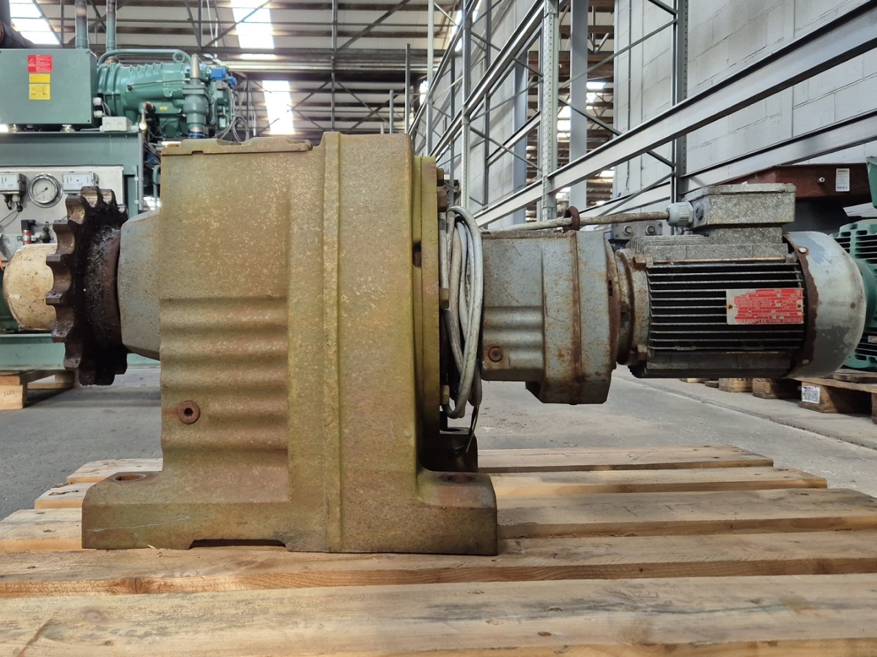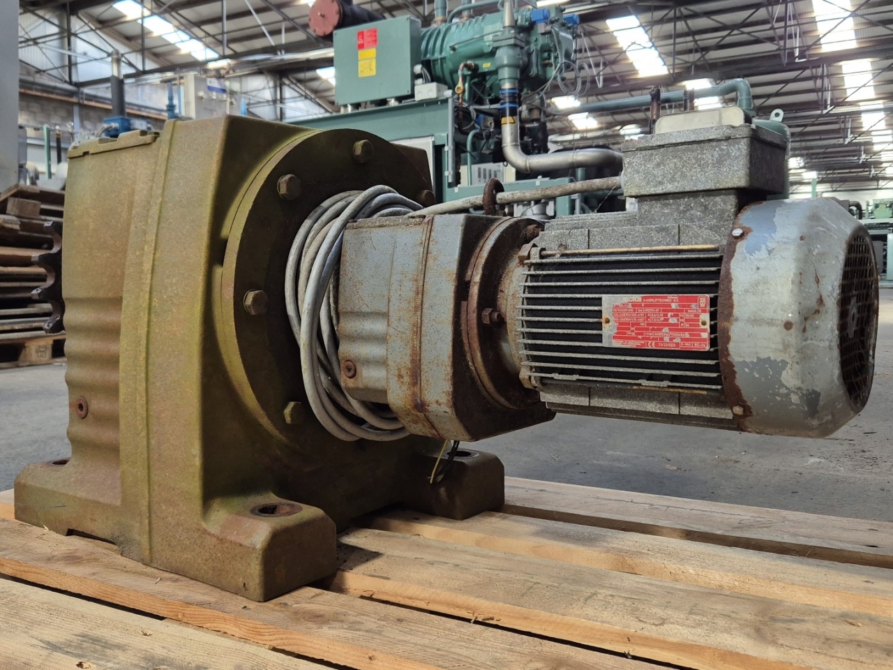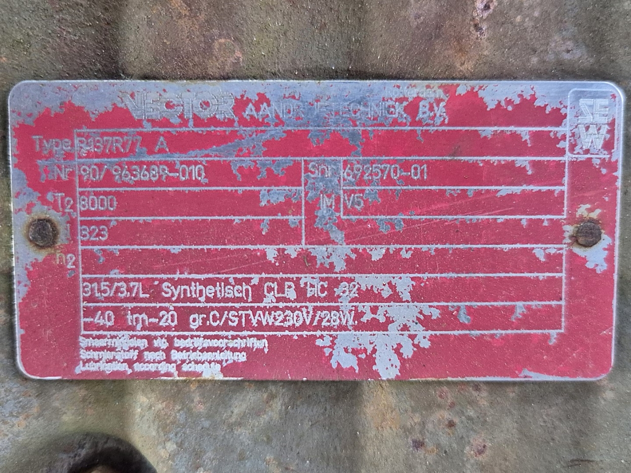 Gebruikte Vector / Sew R137R77 versnellingsbak aangedreven door een Vector DFT100LS4 elektromotor: 50/60 Hz - 2,5 kW - 1400/1700 tpm. Afmetingen: 1200x420x500 mm (LxBxH).