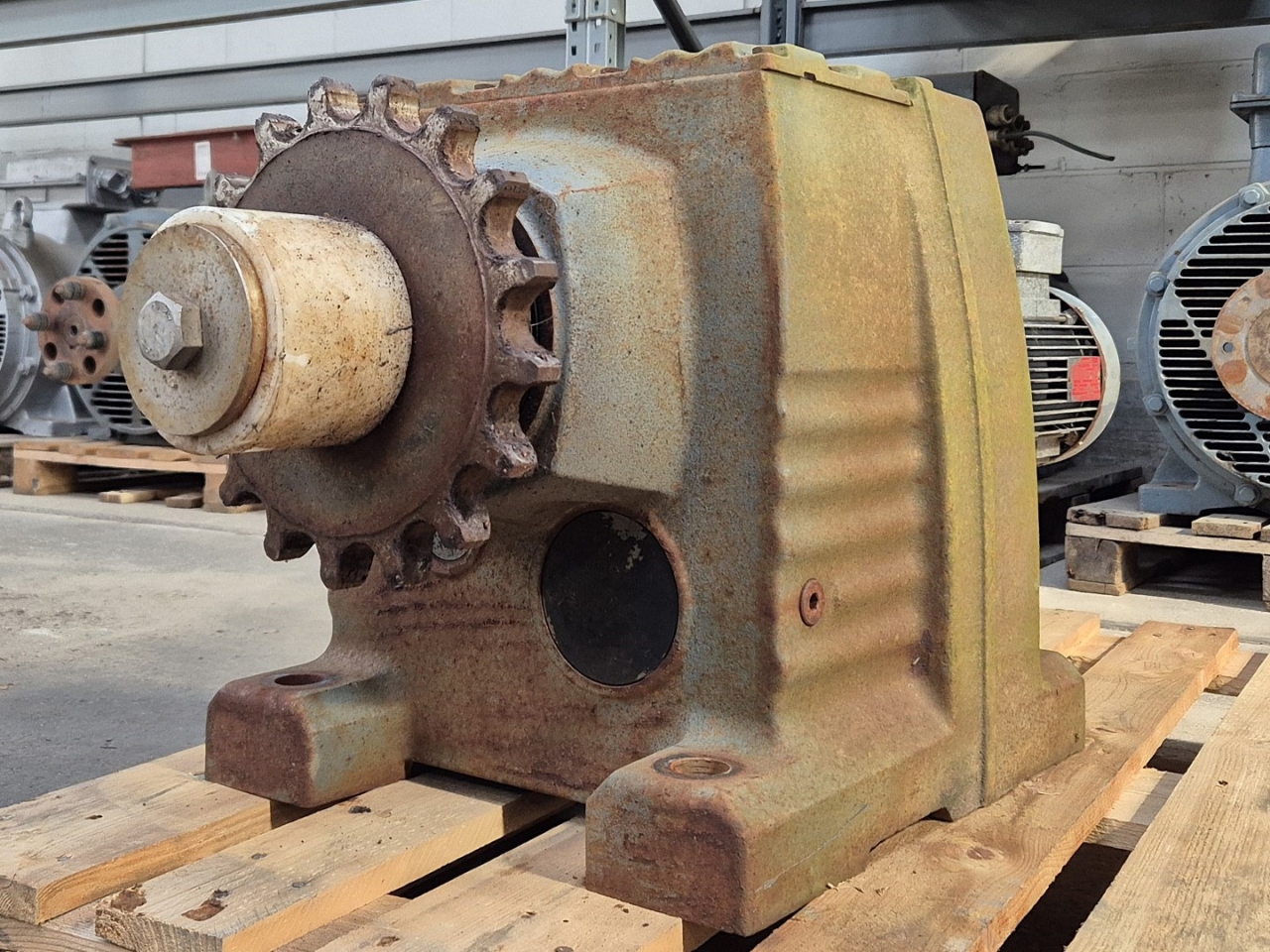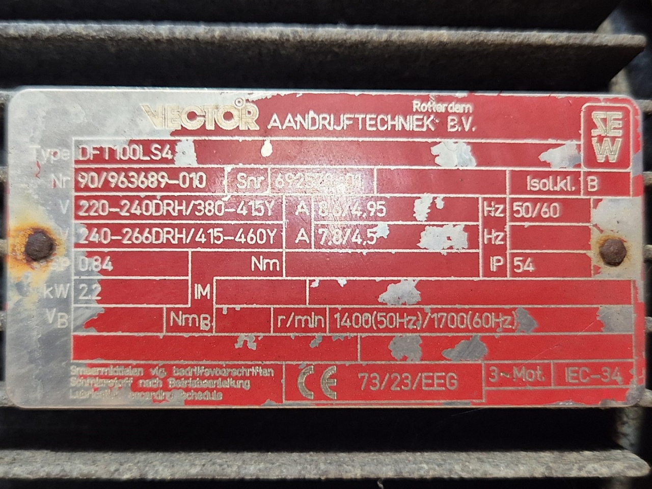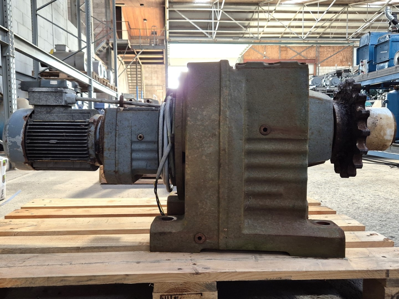 Gebruikte Vector / Sew R137R77 versnellingsbak aangedreven door een Vector DFT100LS4 elektromotor: 50/60 Hz - 2,5 kW - 1400/1700 tpm. Afmetingen: 1200x420x500 mm (LxBxH).