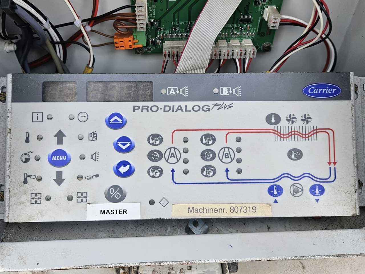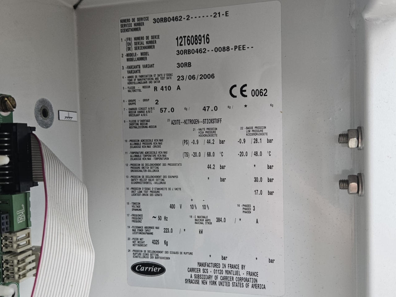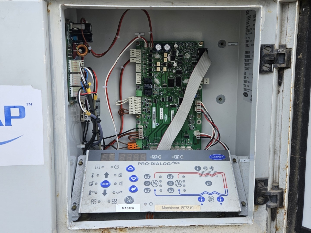 Used Carrier 30 RB 0462 air-cooled chiller on R410A. Complete with 6 Performer SH300A4ACA & 1 Danfoss SH300B4CC scroll compressors, condensor with 7 fans that produce an airflow of 113.749 m³/h, shell and tube as evaporator, 2 water pumps, 2 liquid line filter drier, control cabinet with a Carrier Pro-Dialog Plus.
