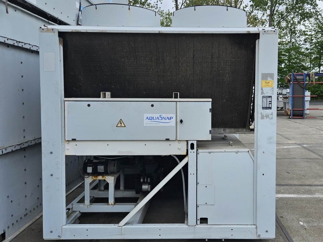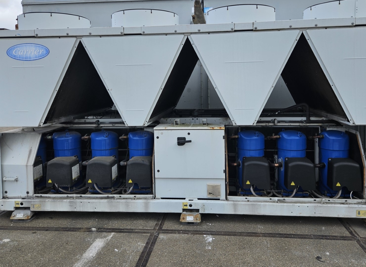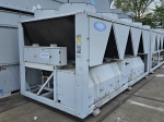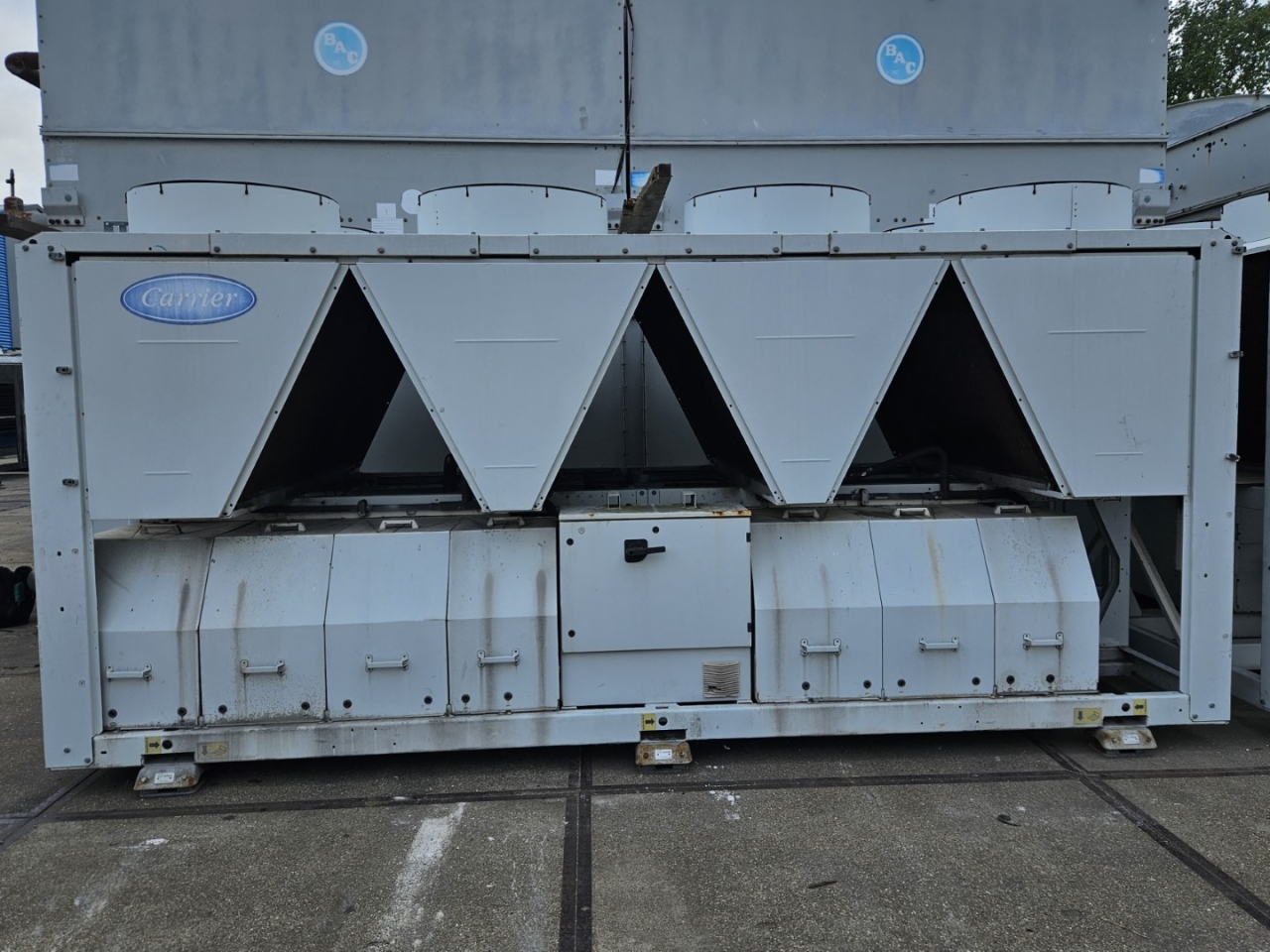 Used Carrier 30 RB 0462 air-cooled chiller on R410A. Complete with 6 Performer SH300A4ACA & 1 Danfoss SH300B4CC scroll compressors, condensor with 7 fans that produce an airflow of 113.749 m³/h, shell and tube as evaporator, 2 water pumps, 2 liquid line filter drier, control cabinet with a Carrier Pro-Dialog Plus.