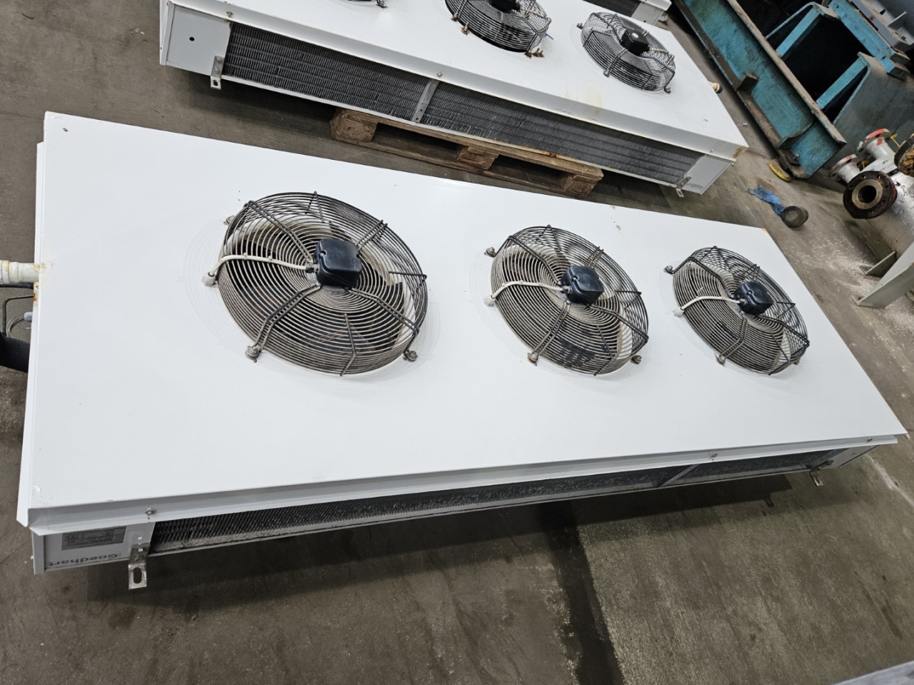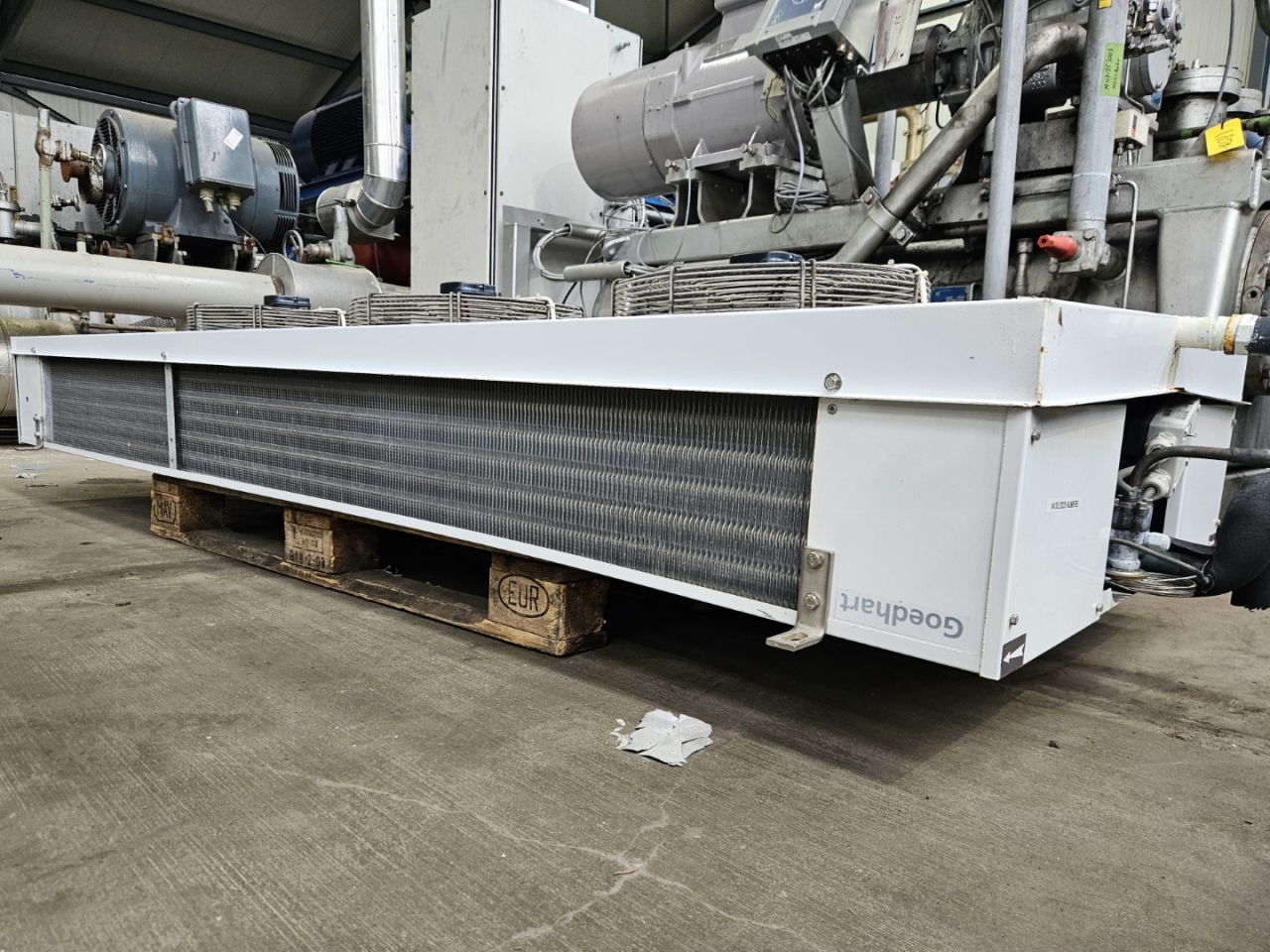 Used Goedhart FC38Dp 63407-230 Freon evaporator. Complete with 3 EBM-Papst S6E400-AP10-46 fans 50/60 Hz - 940/1080 RPM - diameter 400 mm and a total airflow of 8.441 m³/h.