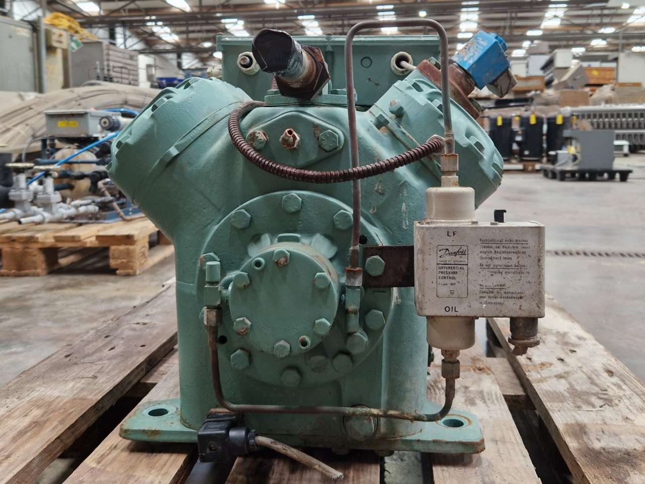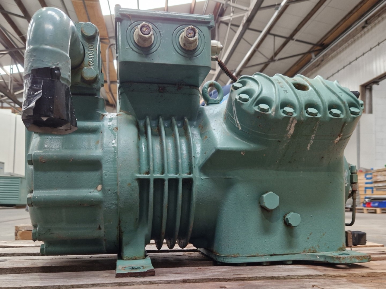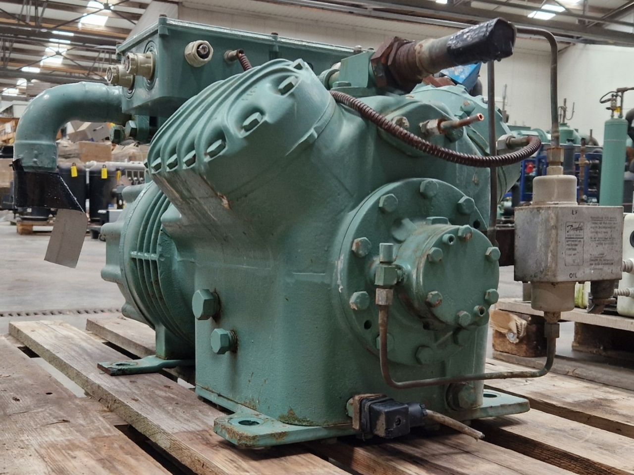 Used Bitzer 4G-30.2 semi-hermetic reciprocating compressor on Freon. Complete with a pressure safety switch and a sight glass. The compressor has a displacement of 84,5 m³/h at 1450 RPM.
