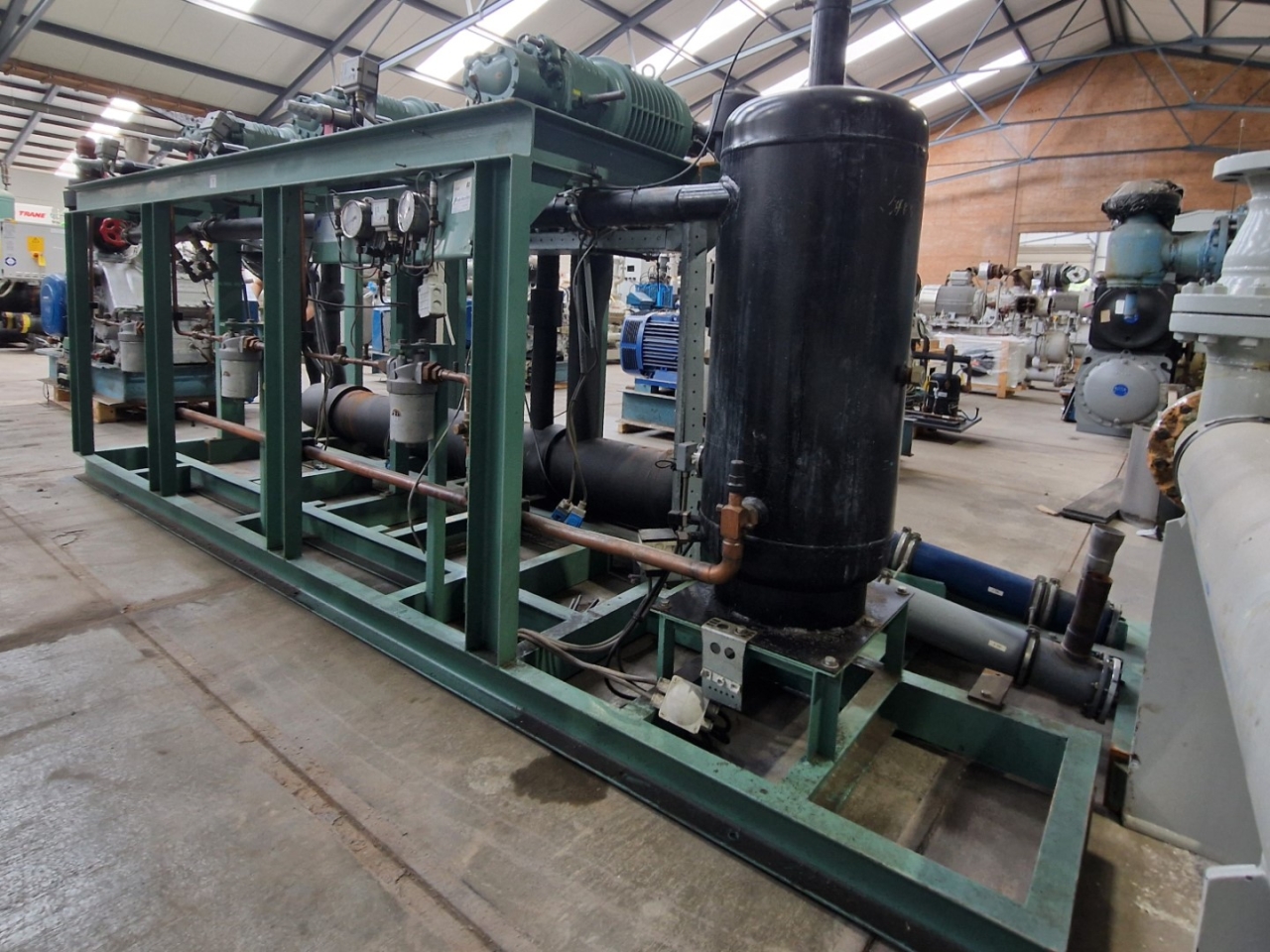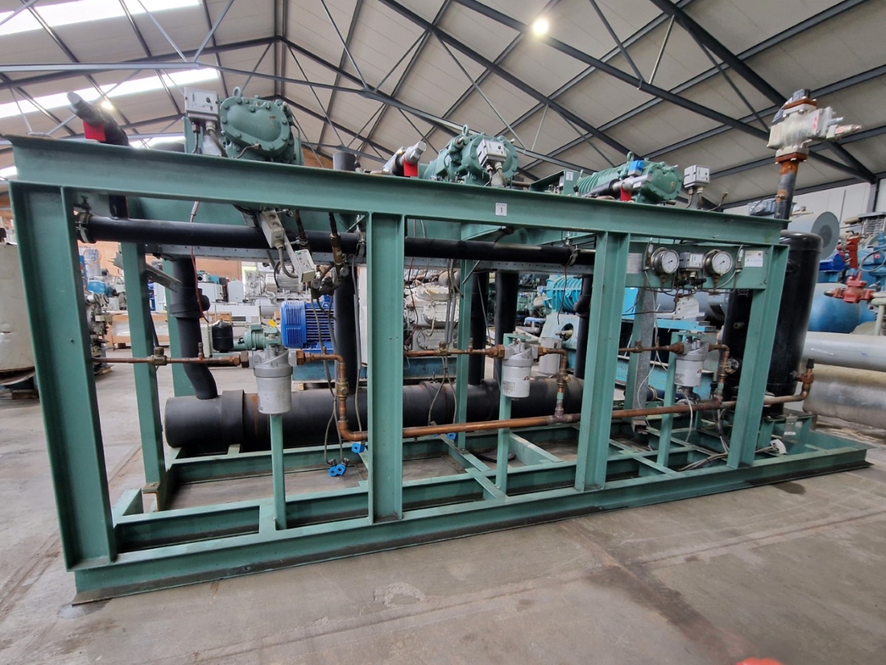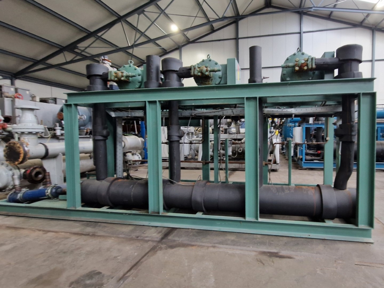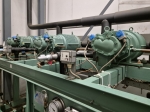 Used Bitzer HSK6451-50Y-40P (x2) & HSK6451-50-40P (x1) semi-hermetic screw compressor rack on Freon with a economizer. Complete with a OS400 oil separator with a volume of 110 liters, pressure and safety switches/gauges and a sight glass. The compressors have a total displacement of 420 m³/h at 50 Hz & 504 m³/h at 60 Hz. The capacities are with a economizer.