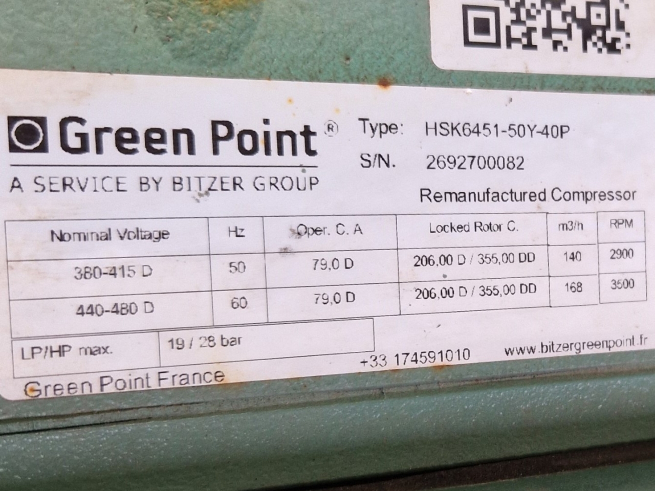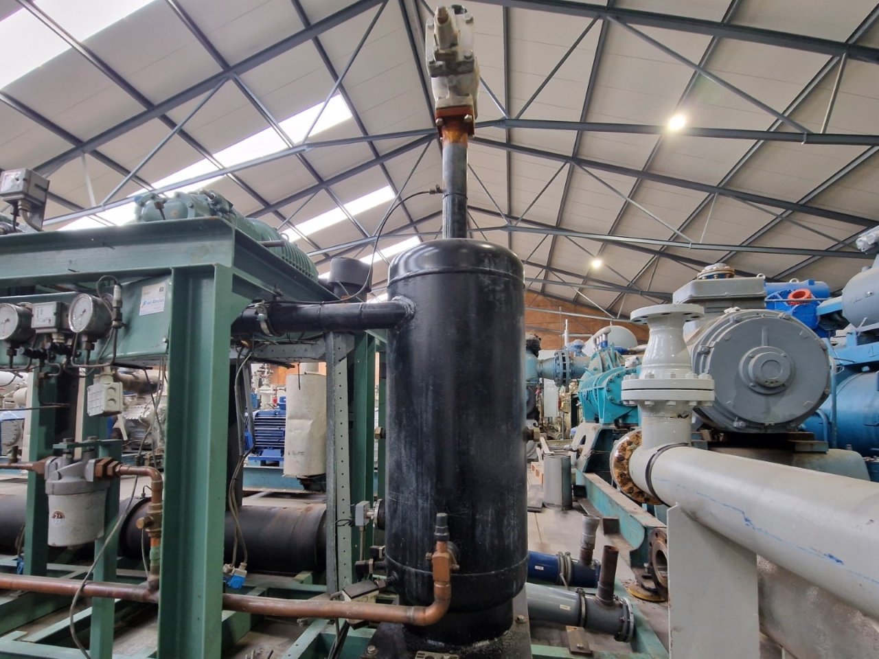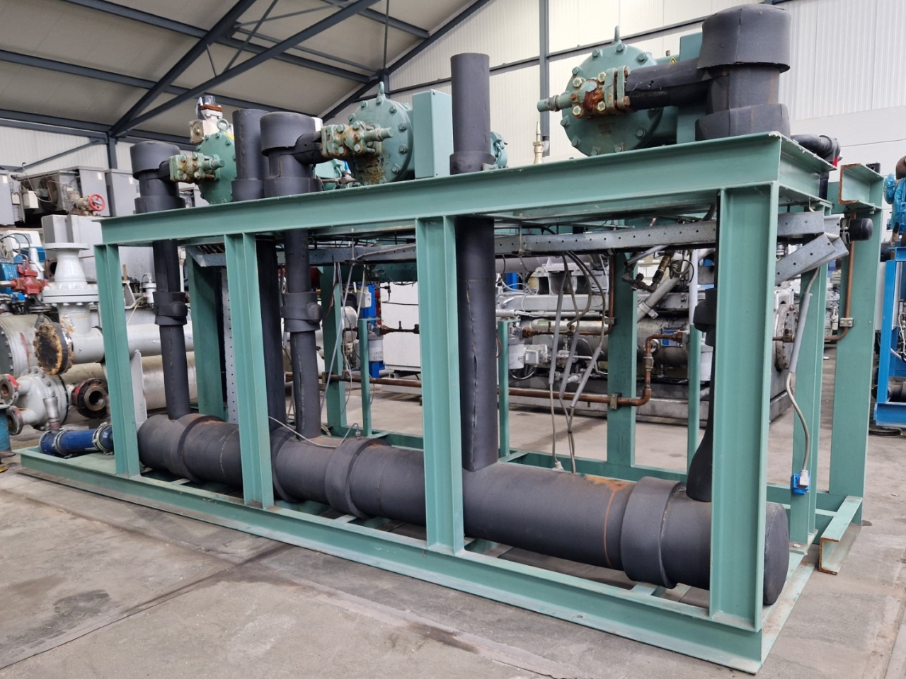 Used Bitzer HSK6451-50Y-40P (x2) & HSK6451-50-40P (x1) semi-hermetic screw compressor rack on Freon with a economizer. Complete with a OS400 oil separator with a volume of 110 liters, pressure and safety switches/gauges and a sight glass. The compressors have a total displacement of 420 m³/h at 50 Hz & 504 m³/h at 60 Hz. The capacities are with a economizer.
