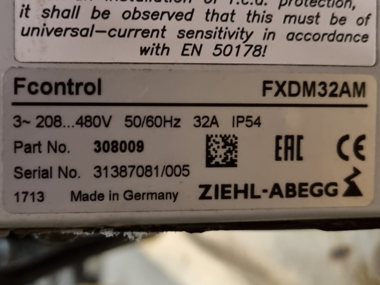 Used Ziehl-Abegg FXDM32AM Fcontrol. Specifications: 3~ 480V 50/60 Hz 32A IP54.