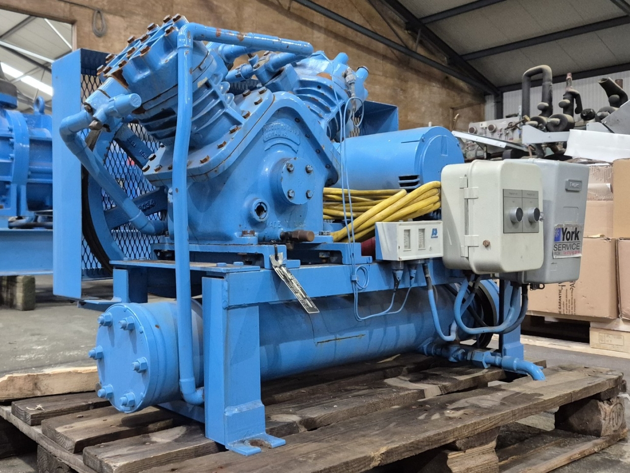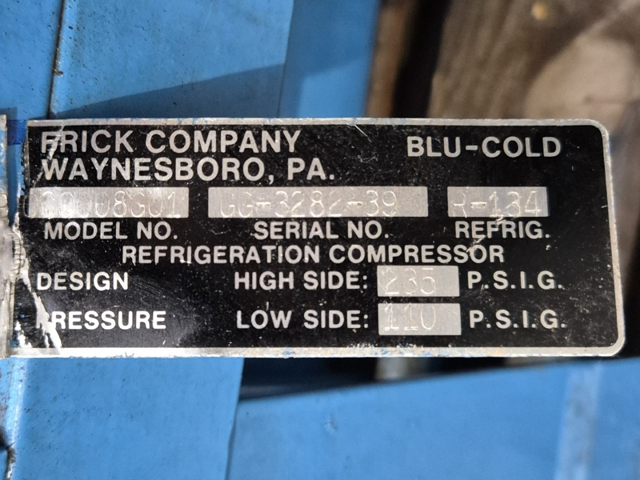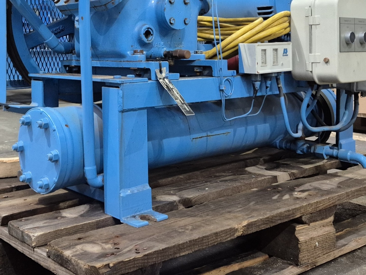Used Freon recovery unit. Complete with a Frick V22562 reciprocating compressor, Marathon ZVL V84TDR9040AE electric motor - 50 Hz - 3,7 kW - 1450 RPM, water cooled shell and tube, pressure and safety switch.