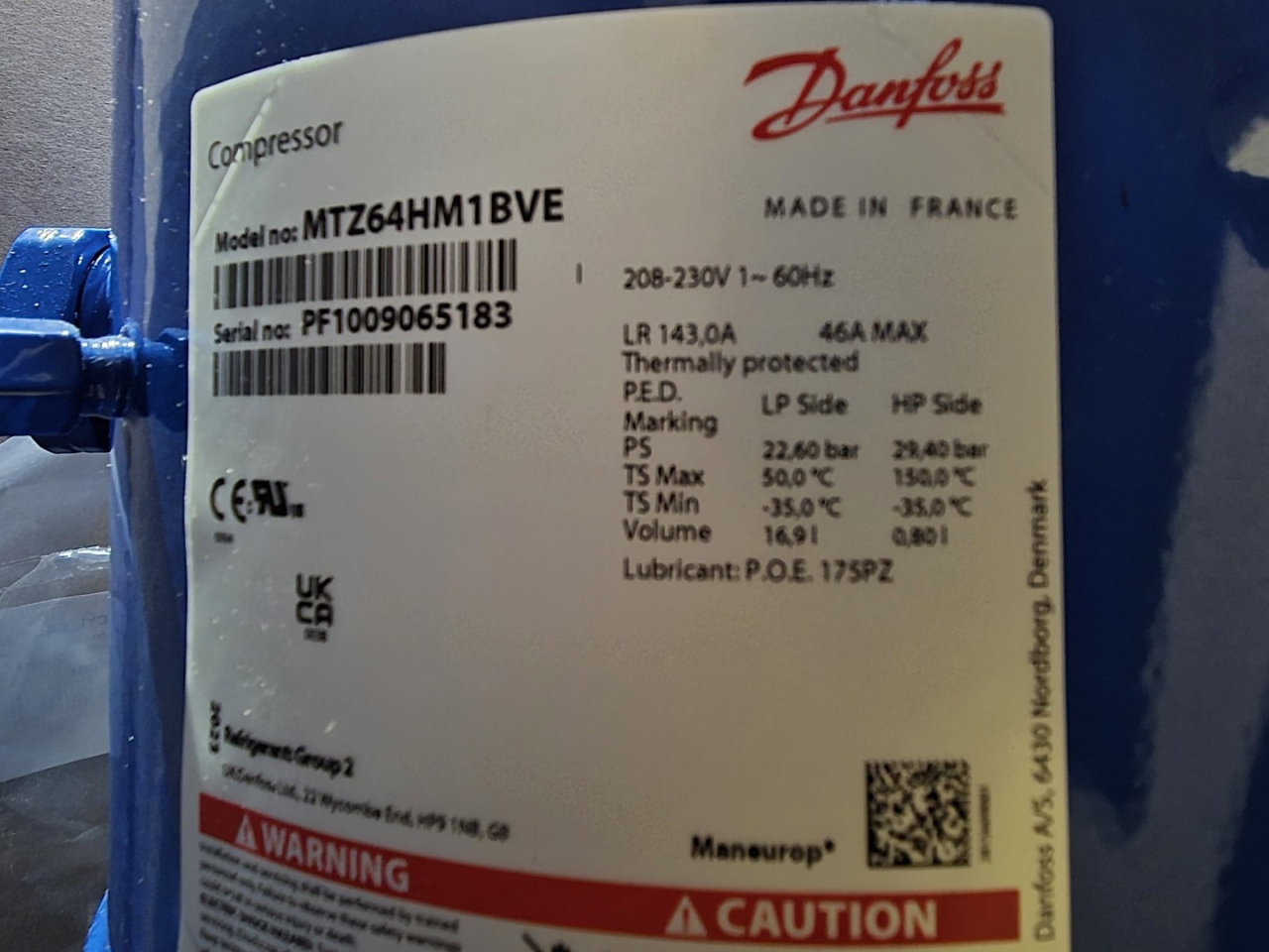 New in the box Danfoss MTZ64HM1BVE reciprocating compressor on Freon.