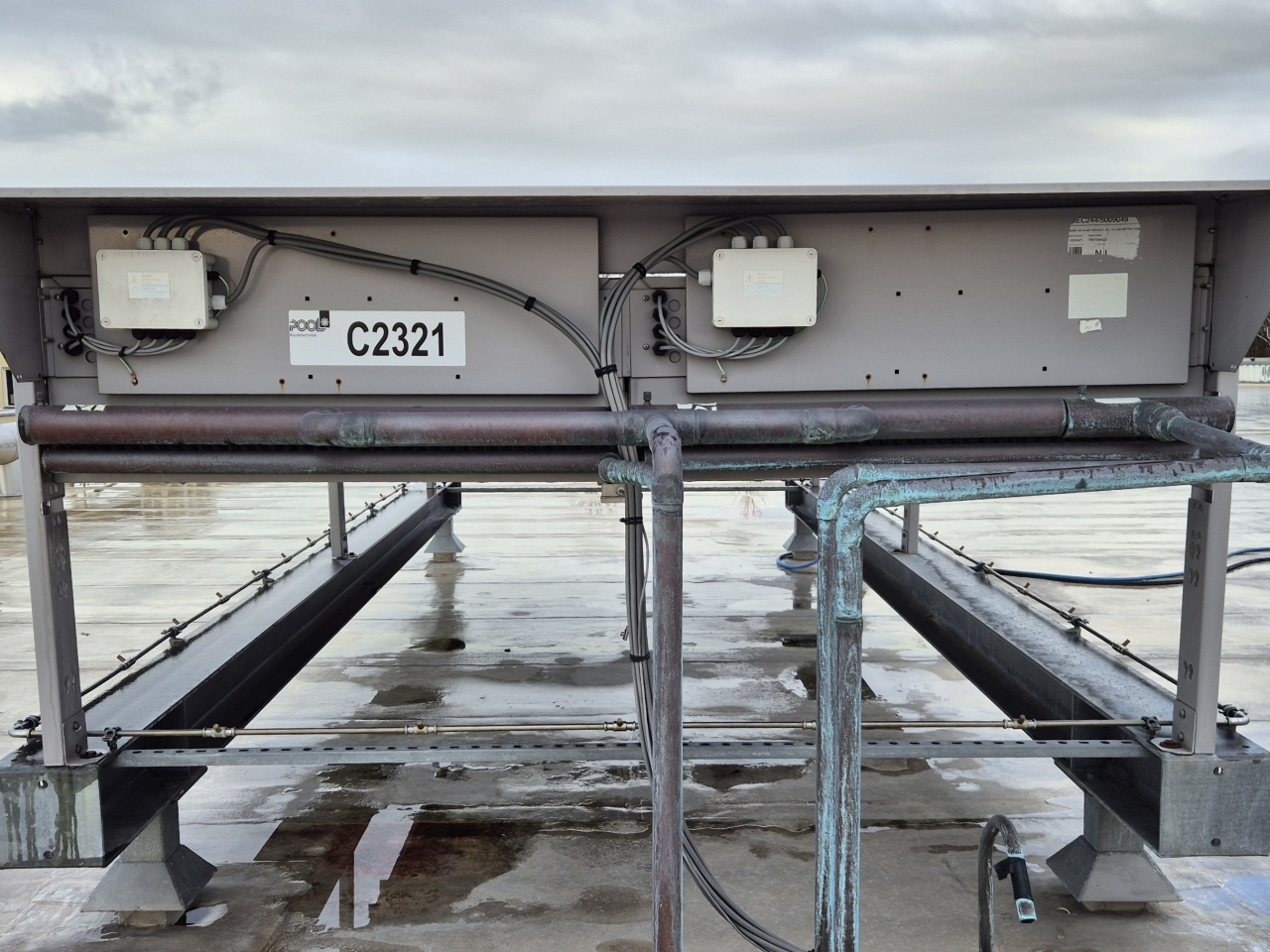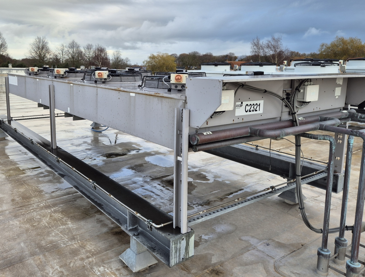 Used Goedhart KOAL-S EC244-N608S air-cooled condenser on Freon. Complete with 8 S&P HRT/8-630/30-BPN1 fan - 50 Hz - 0,29 kW - 635 RPM - diameter 630 mm and a total airflow of 54.432 m³/h.
