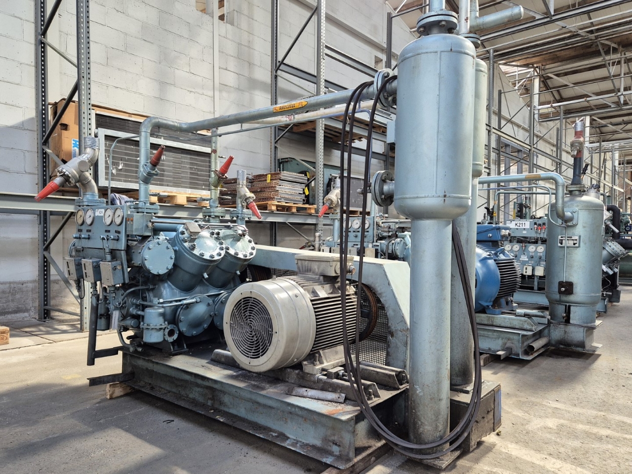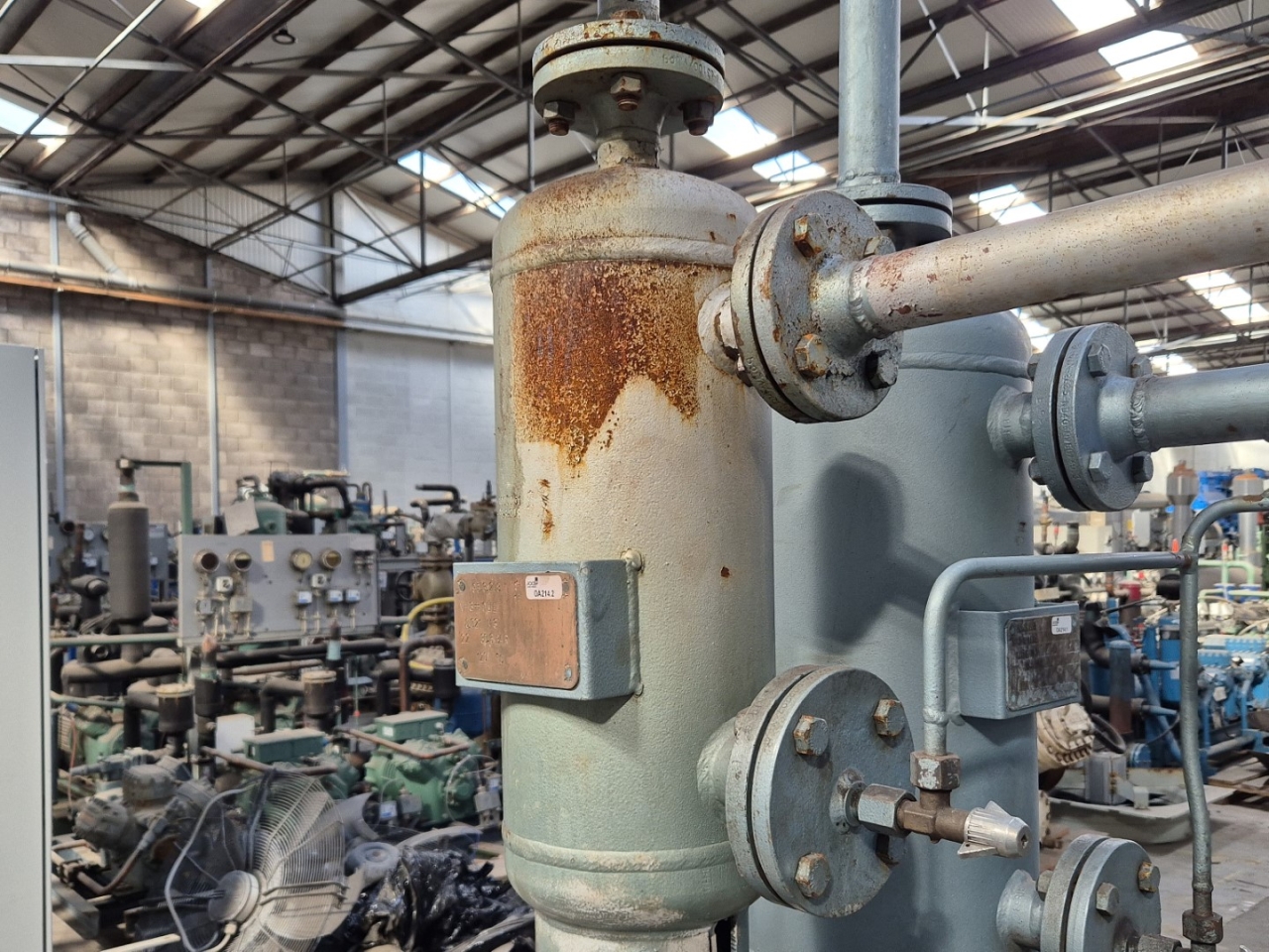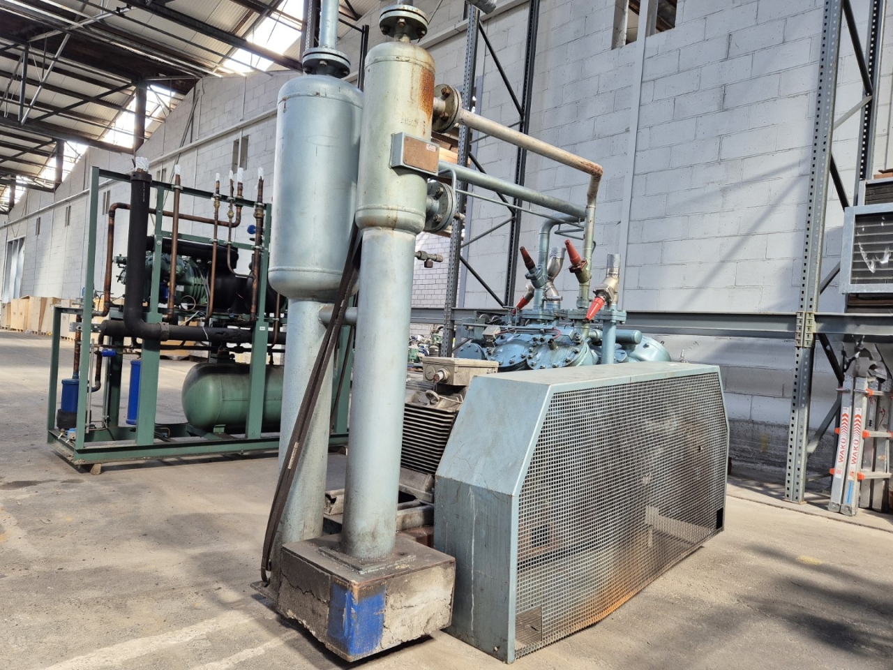 Used Grasso RC 3111 open-type reciprocating compressor on NH3 (Ammonia). Complete with a Rototr.nl electromotor: 50/60 Hz - 55/63 kW - 1475/1775 RPM, Grasso 95.3.209 oil separator with a volume of 51 liters, Grasso 95.3.208 oil separator with a volume of 21 liters, pressure and safety switches/gauges and a sight glass. The compressor has a displacement of 399 m³/h at 1000 RPM. *Capacity based on a condensing temperature of +35ºC and at 867 RPM