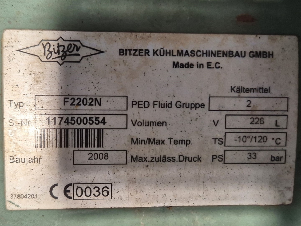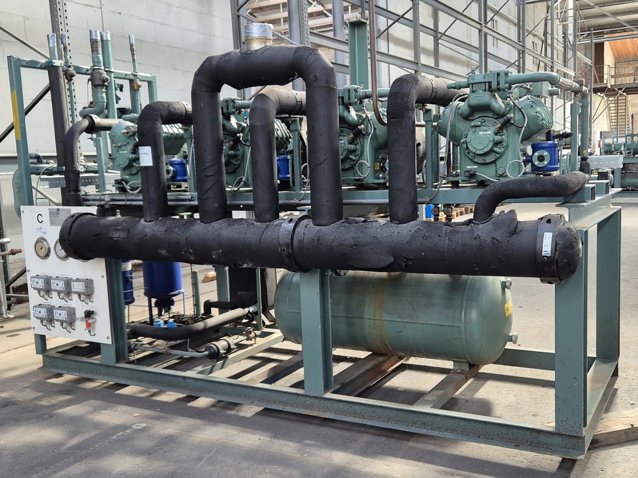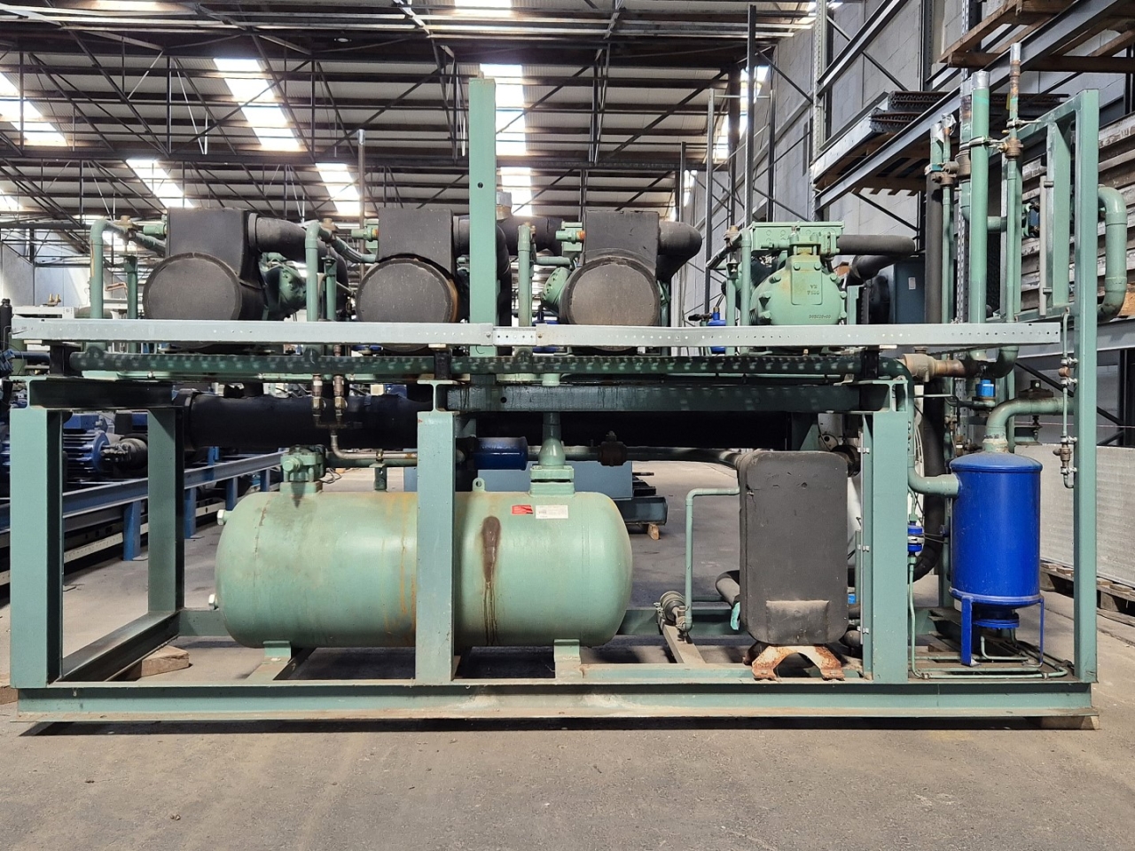 Used Bitzer 6F-40.2Y-40P (x3) & 4J-13.2Y-40P (x1) semi-hermetic reciprocating compressor rack on Freon. Complete with a Bitzer F2202N liquid receiver with a volume of 228 liters, Henry Technologies S-5203-CE oil separator, Henry Technologies S-9109-CE oil reservoir, brazed heat exchanger, pressure and safety switches/gauges and a liquid line filter drier. The compressors have a displacement of 518,3 m³/h at 50 Hz.