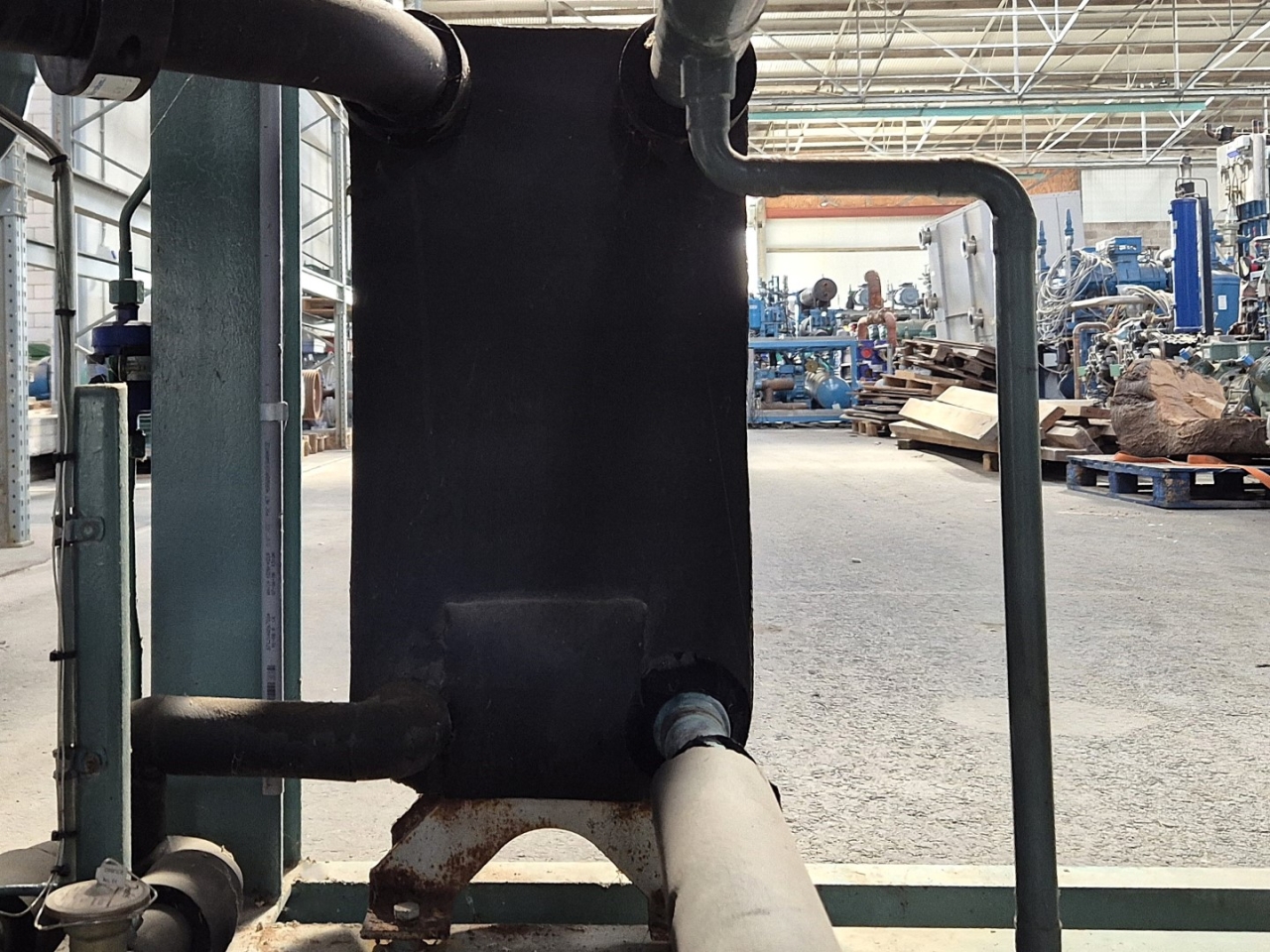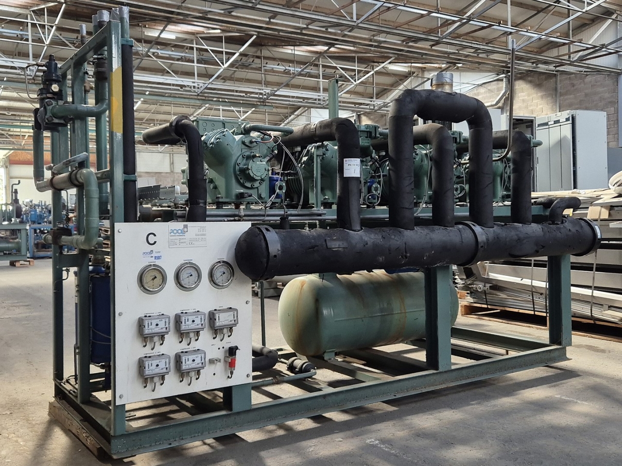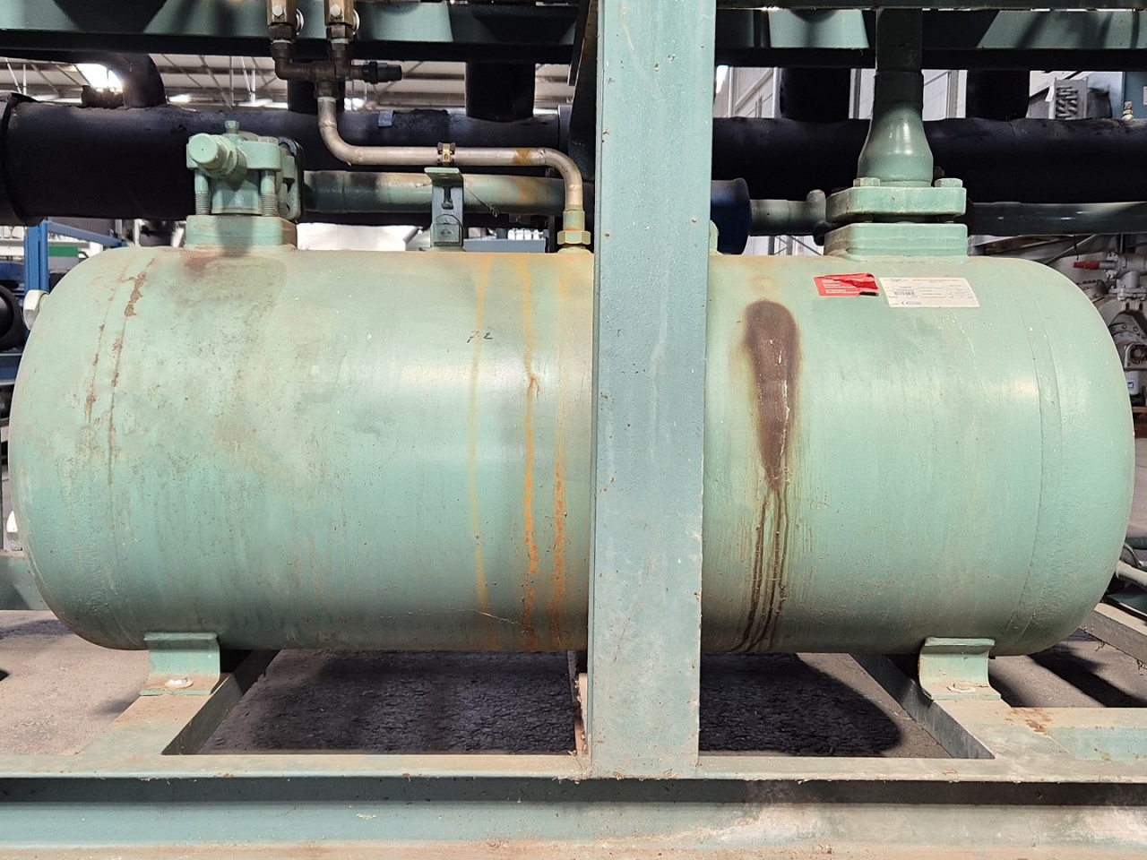 Used Bitzer 6F-40.2Y-40P (x3) & 4J-13.2Y-40P (x1) semi-hermetic reciprocating compressor rack on Freon. Complete with a Bitzer F2202N liquid receiver with a volume of 228 liters, Henry Technologies S-5203-CE oil separator, Henry Technologies S-9109-CE oil reservoir, brazed heat exchanger, pressure and safety switches/gauges and a liquid line filter drier. The compressors have a displacement of 518,3 m³/h at 50 Hz.