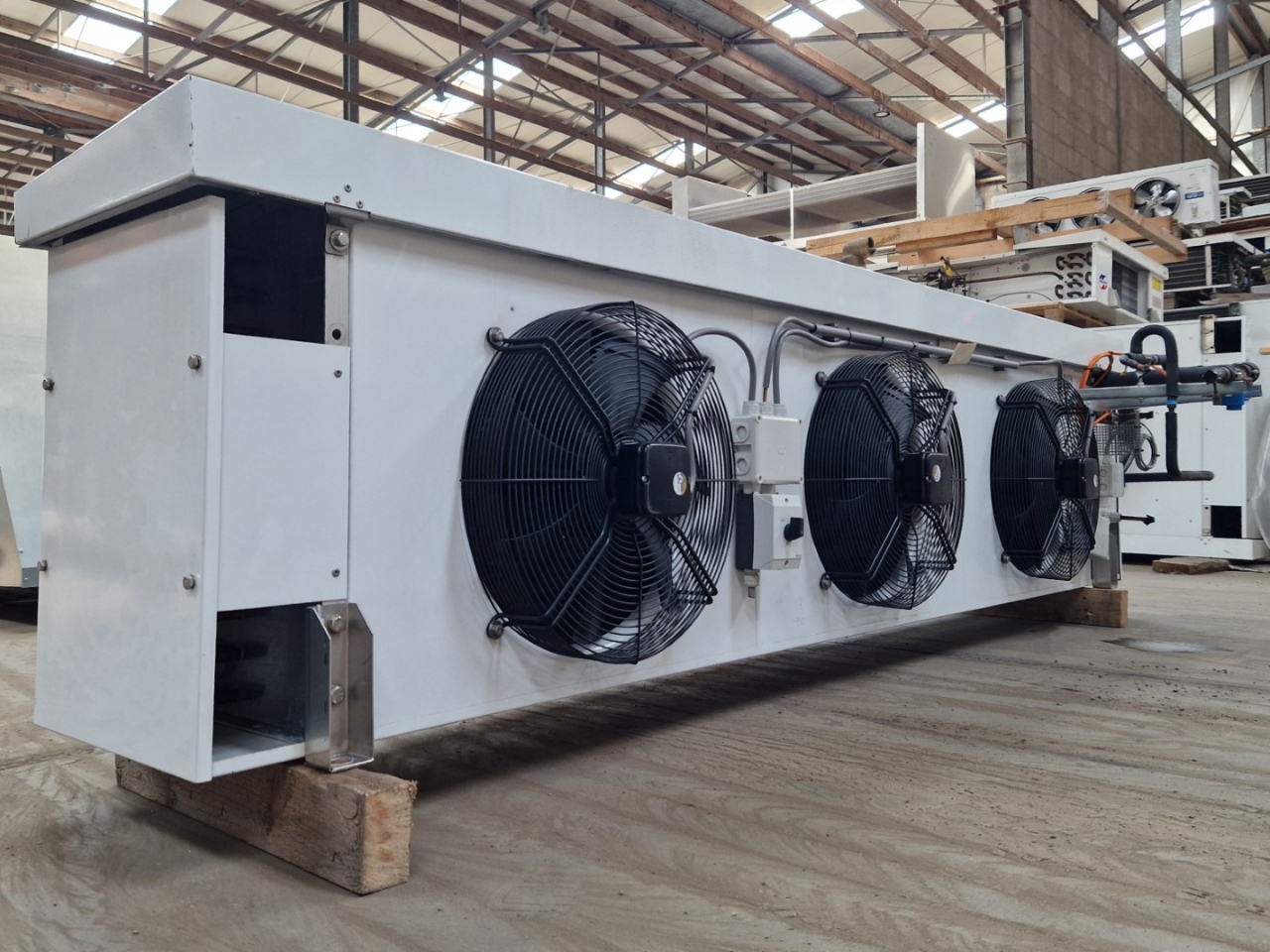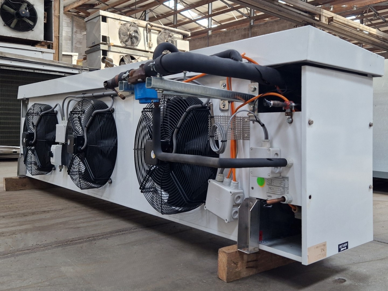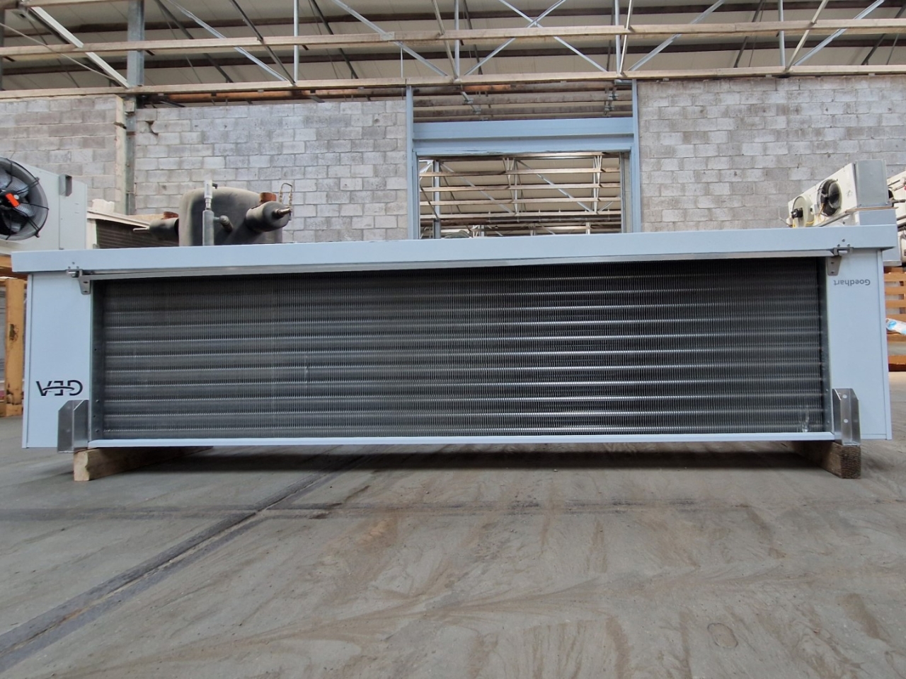 Used Goedhart VCI-p-33457 evaporator on Freon with hot gas defrost. Complete with 3 Gea Goedhart FN045-VDW.2F.A7P2 fans - 50 Hz - 0,35/0,22 kW - 1280/970 RPM - diameter 450 mm and a total airflow of 16.031 m³/h.