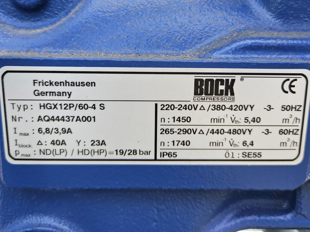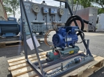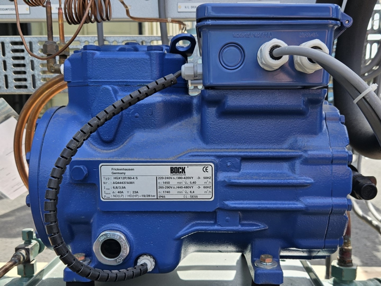 Used Bock water-cooled condensing unit on Freon. Complete with a Bock HGX12P/60-4 S semi-hermetic compressor, Bitzer K073H shell and tube condenser, liquid line filter drier, pressure and safety switches/gauges, sight glass and a control cabinet with a Merkury Mk3 8-2/5M display. The compressor has a displacement of 5,4 m³/h at 50 Hz.