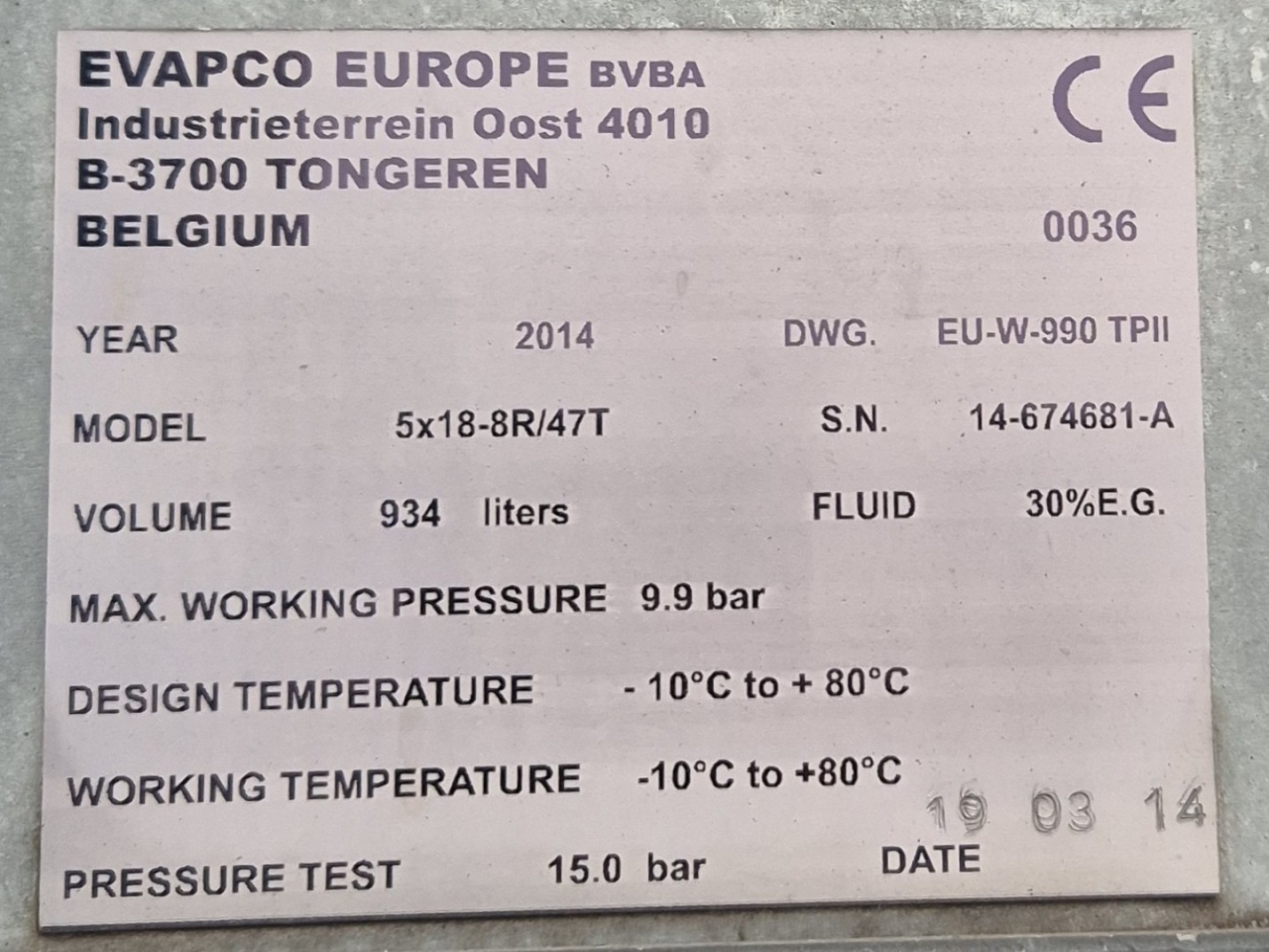 Used Evapco ATW 180-4M cooling tower for Glycol built in 2014. Complete with 1 belt driven fans that produce an airflow of 172.440 m³/h and a water pump with a water flow of 234 m³/h.