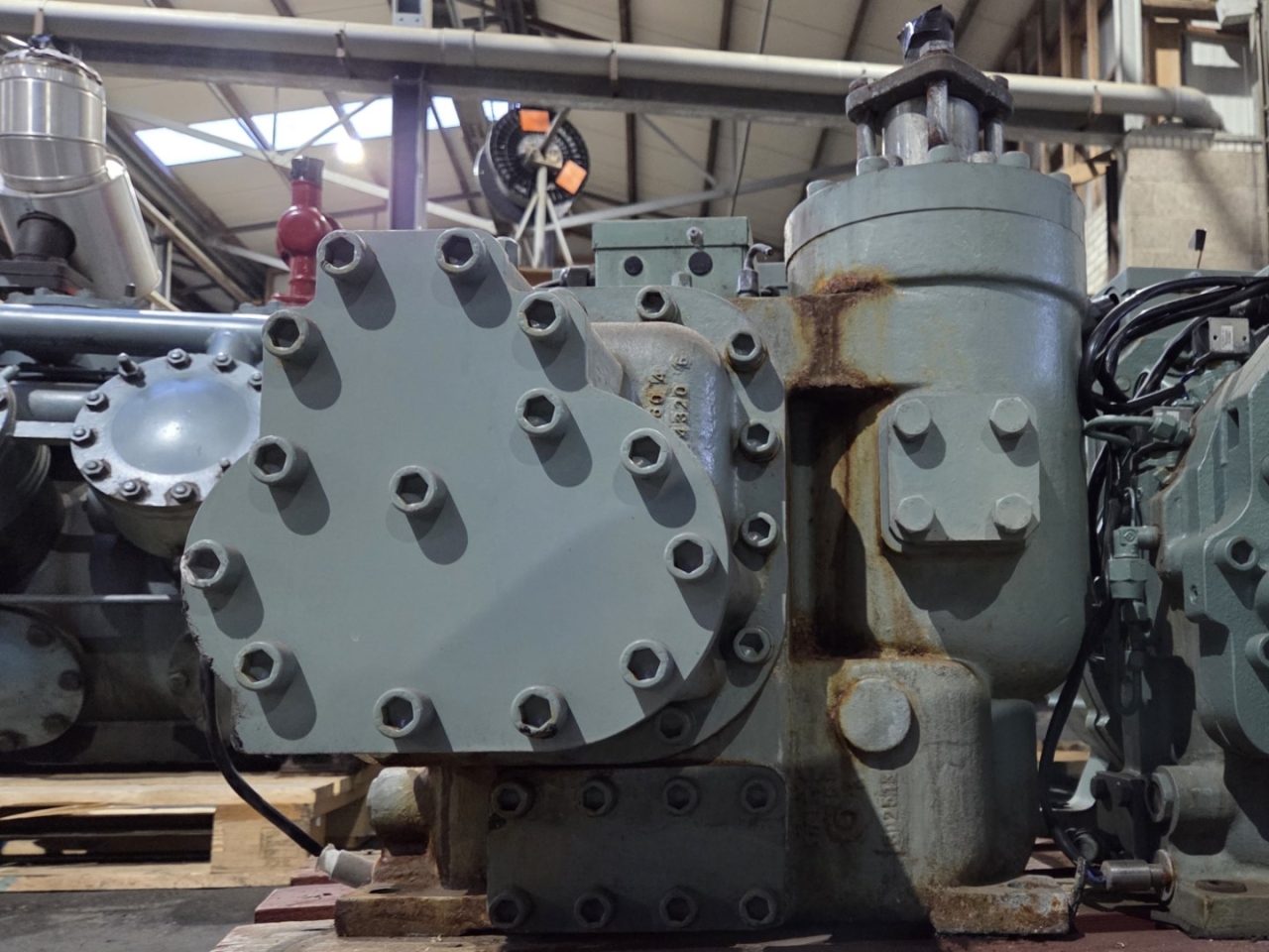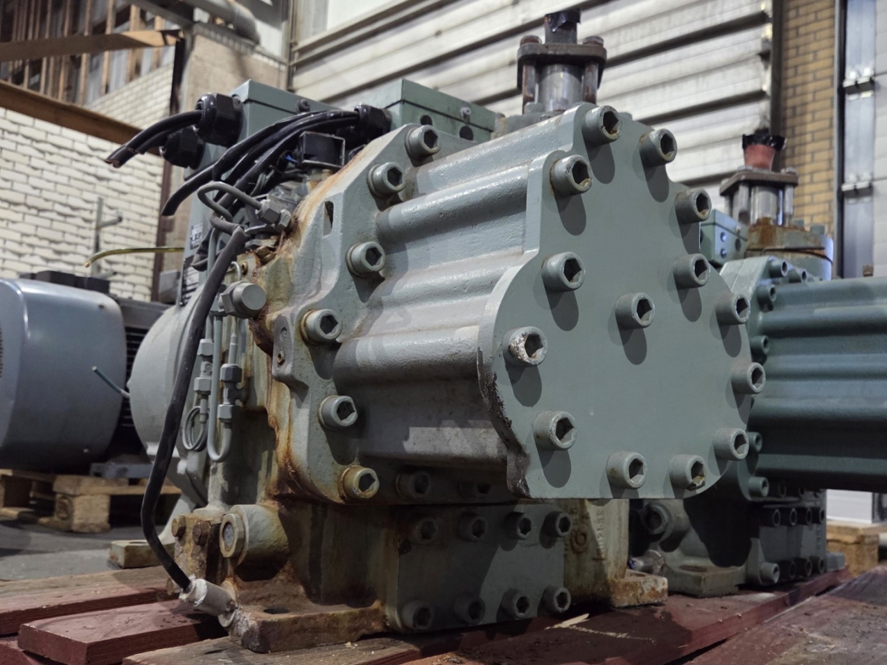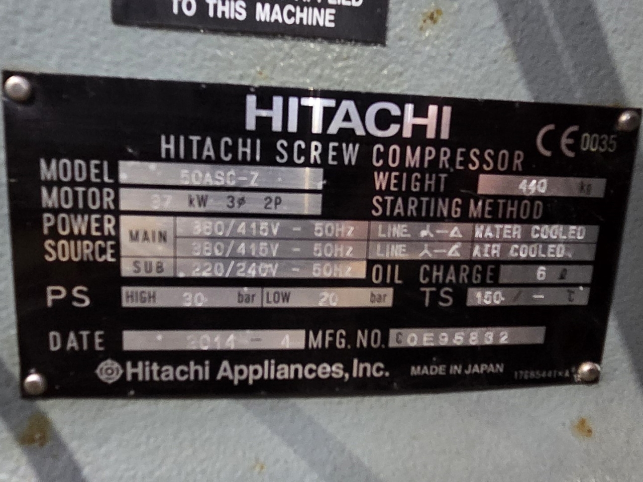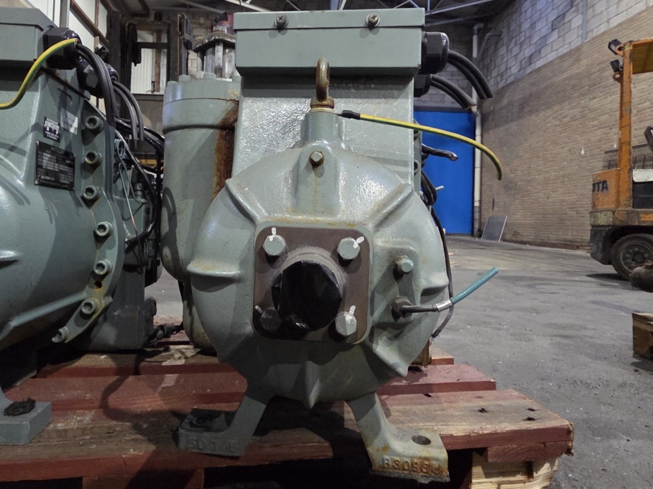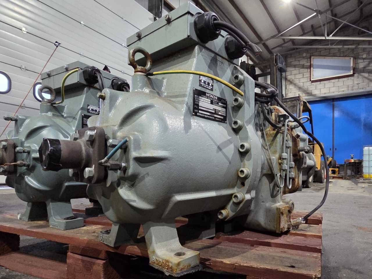 Used Hitachi 50ASC-Z screw compressor on Freon with a sight glass and capacity control. The compressor has a displacement of 169,5 m³/h.