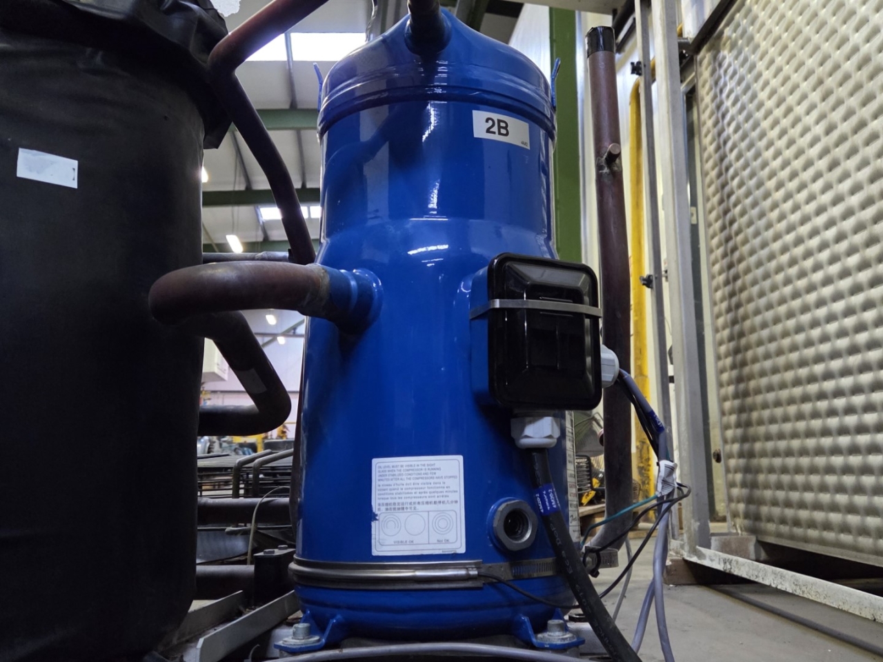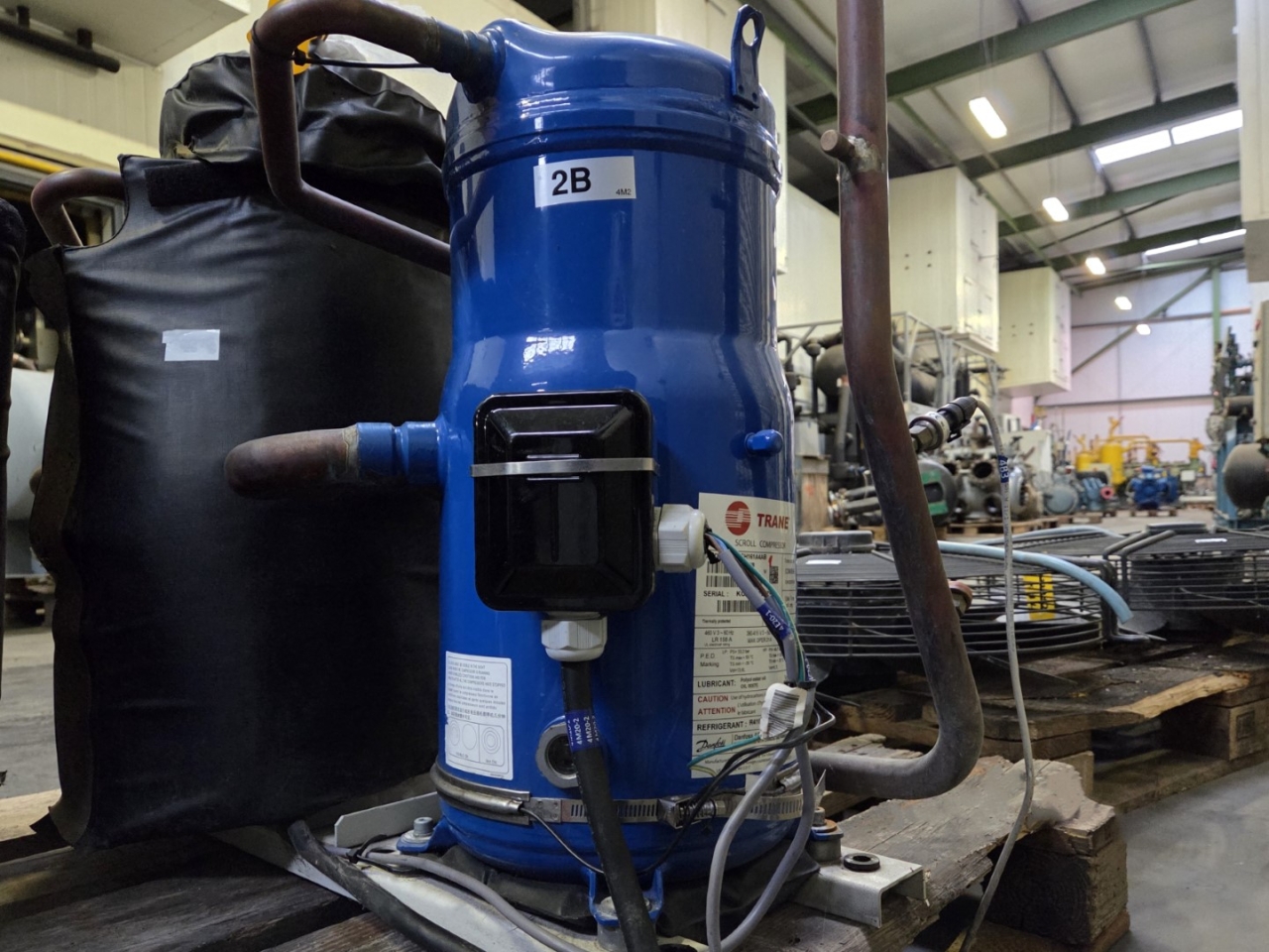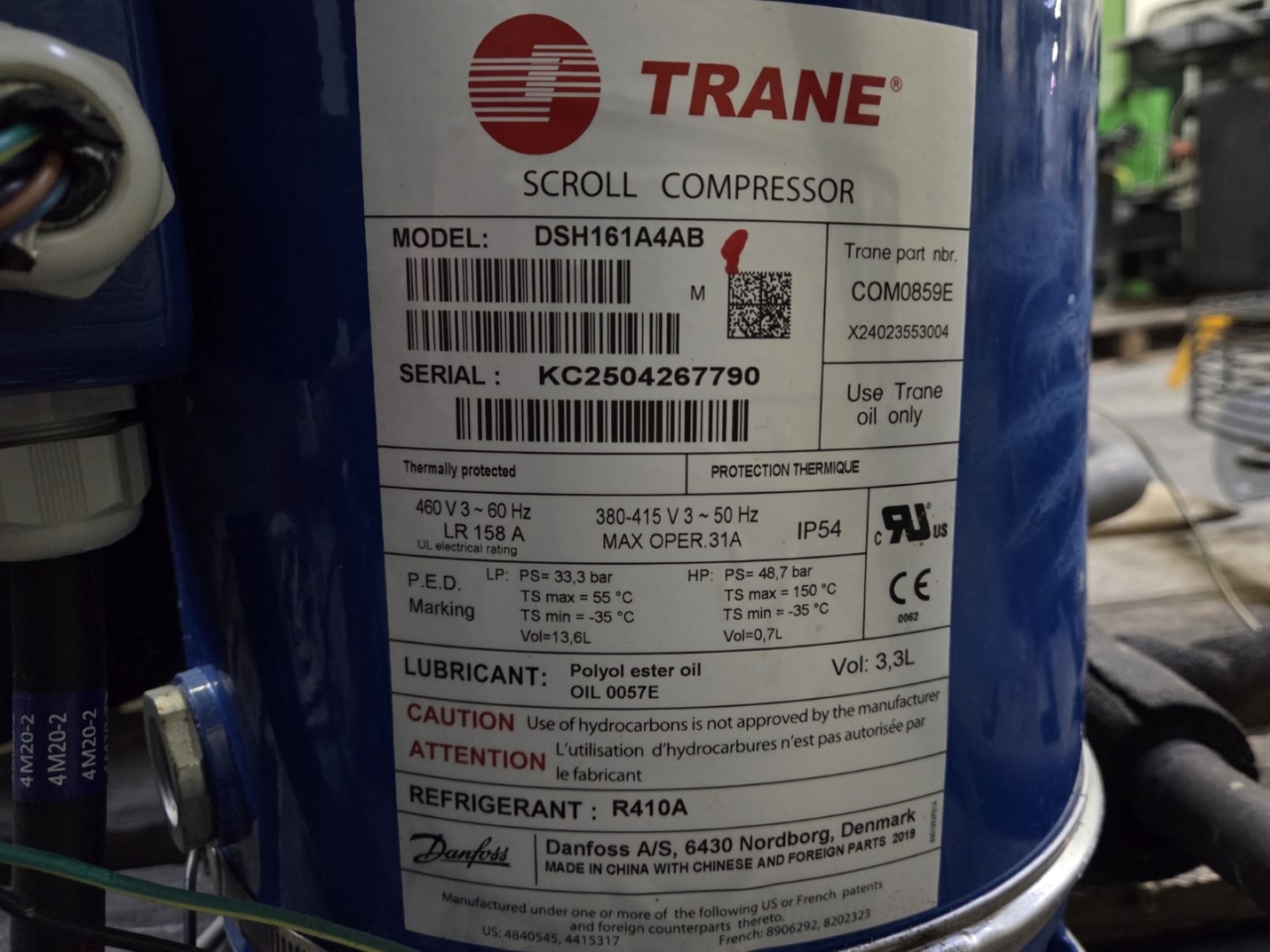 Used Danfoss / Trane DSH161A4AB scroll compressor on Freon with a sight glass. The compressor has a displacement of 26,4 m³/h.