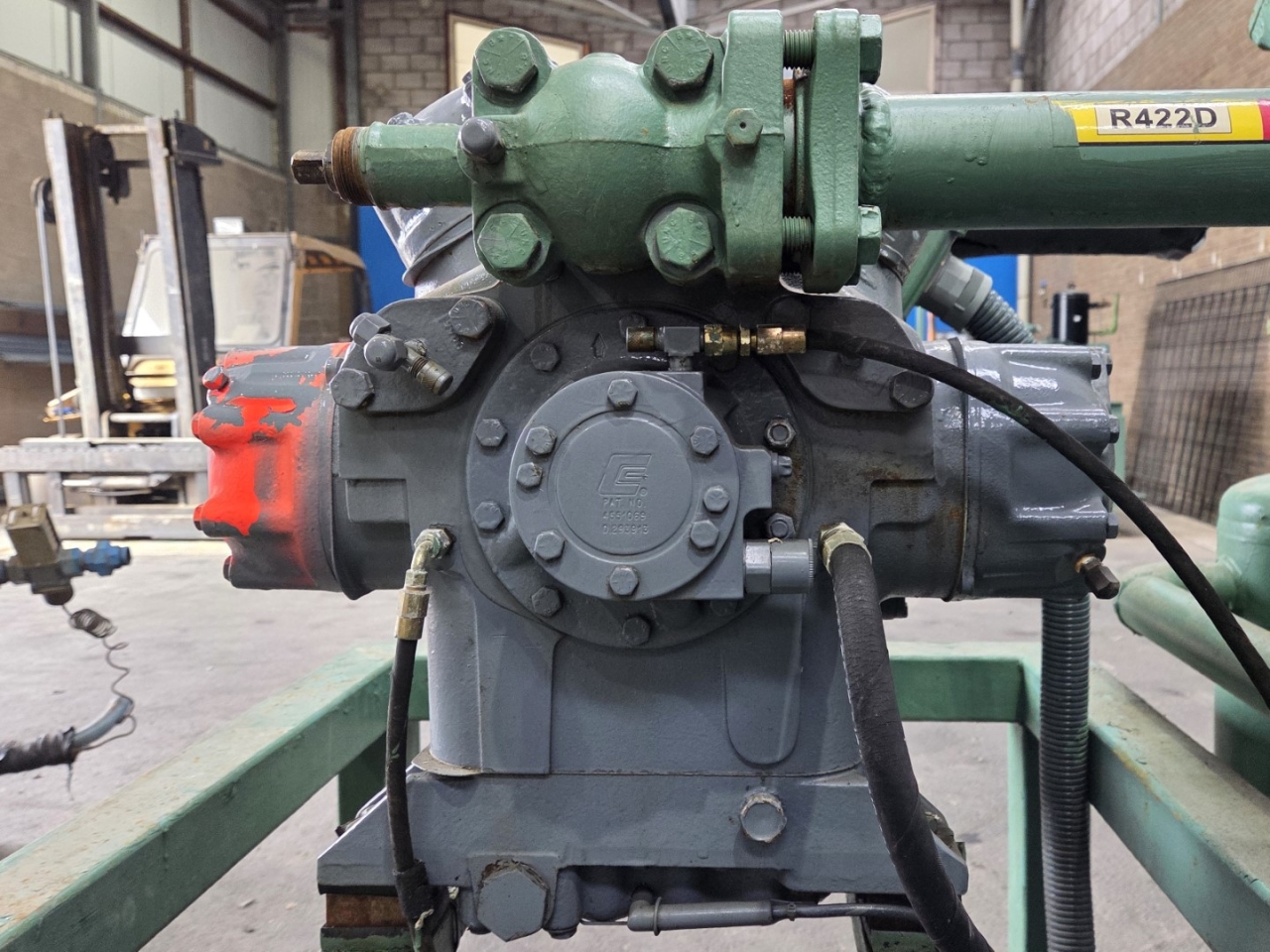 Used DWM/Copeland D8SK1-700X-BWM/D semi-hermetic reciprocating compressor unit on Freon. Complete with a A. Torrecilla S.A. 1709071 liquid receiver with a volume of 81 liters, Henry Technologies S-5412-CE oil separator, pressure safety switches/gauges, sight glass and control cabinet. The compressor has a displacement of 210 m³/h at 50 Hz.