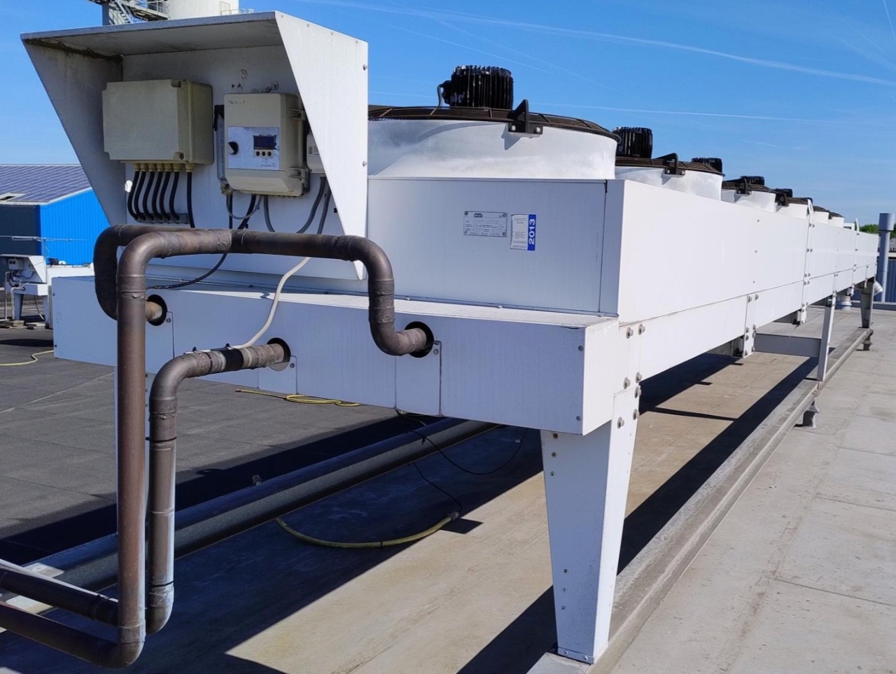 Used Cabero AC-HND 107MB/6E drycooler. Complete with 6 Süd-Electric MDB-T3100-PNS-N fans - 50 Hz - 0,30/0,68 kW - 240/410 RPM - diameter 1000 mm and a total airflow of 65.352 m³/h. The fans can be controlled by a Ziehl-Abegg controller.