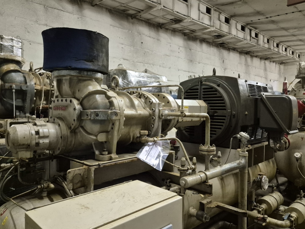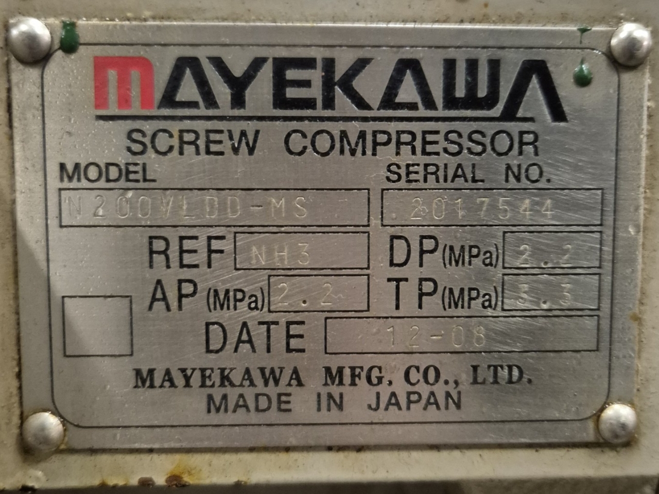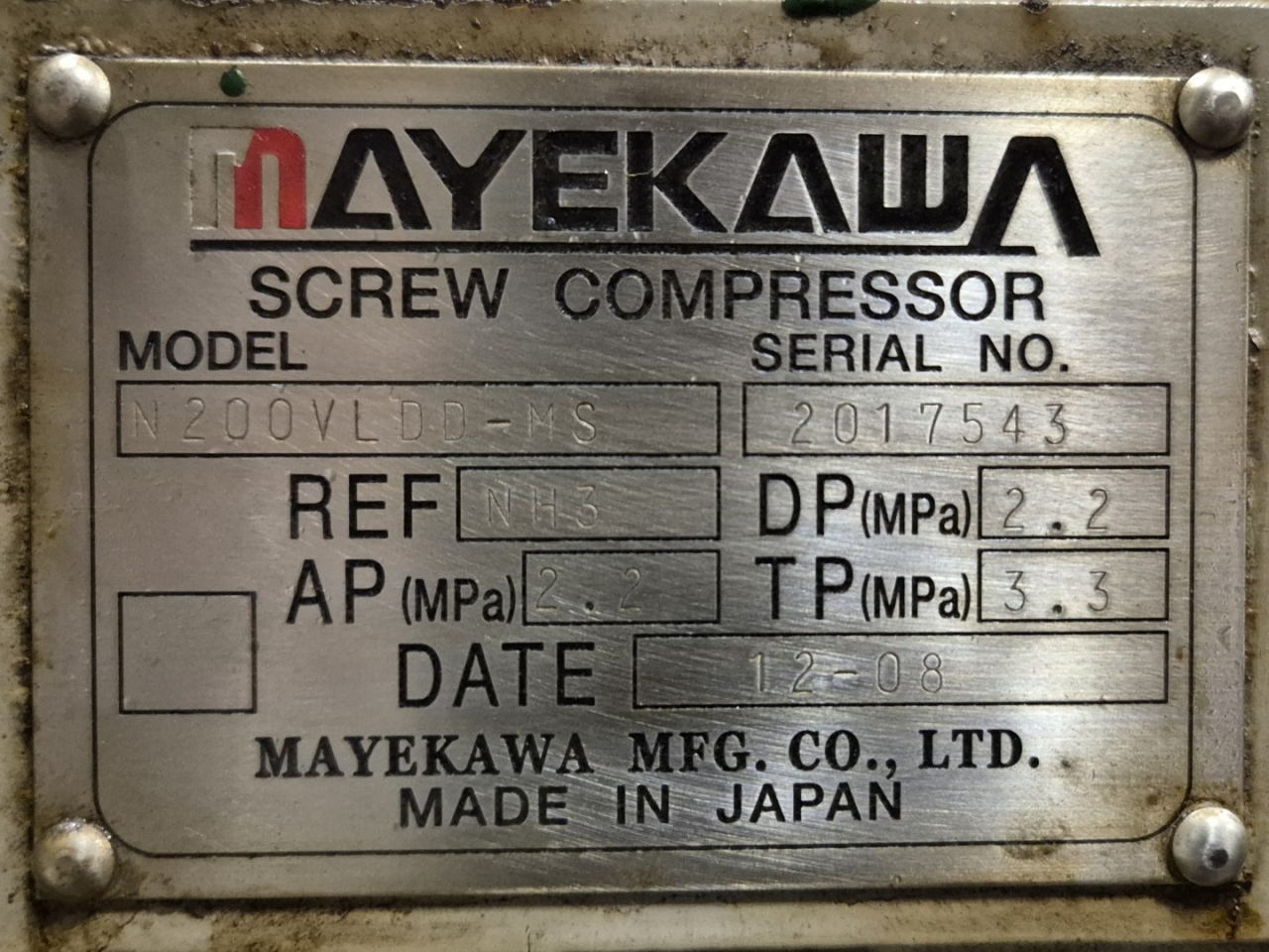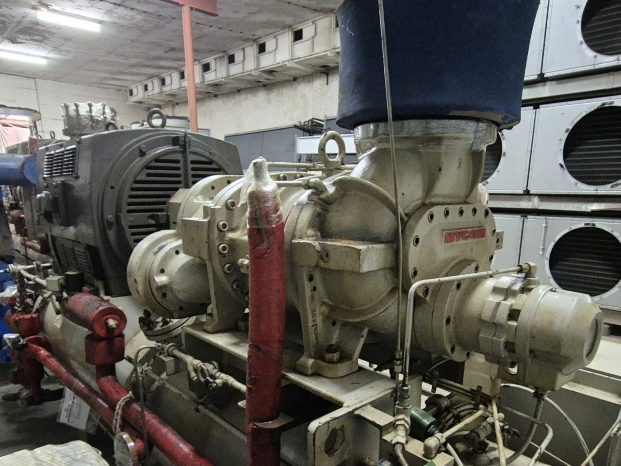Used Mycom N200VLDD-MS screw compressor skid on NH3 (Ammonia). Complete with a Teco ASJC-PA electric motor - 60 Hz - 355 kW - 3565 RPM, Mayekawa T-A1906 oil separator, Mycom M50P-M oil pump and a Mycom MYPRO-CP3 controller.