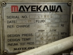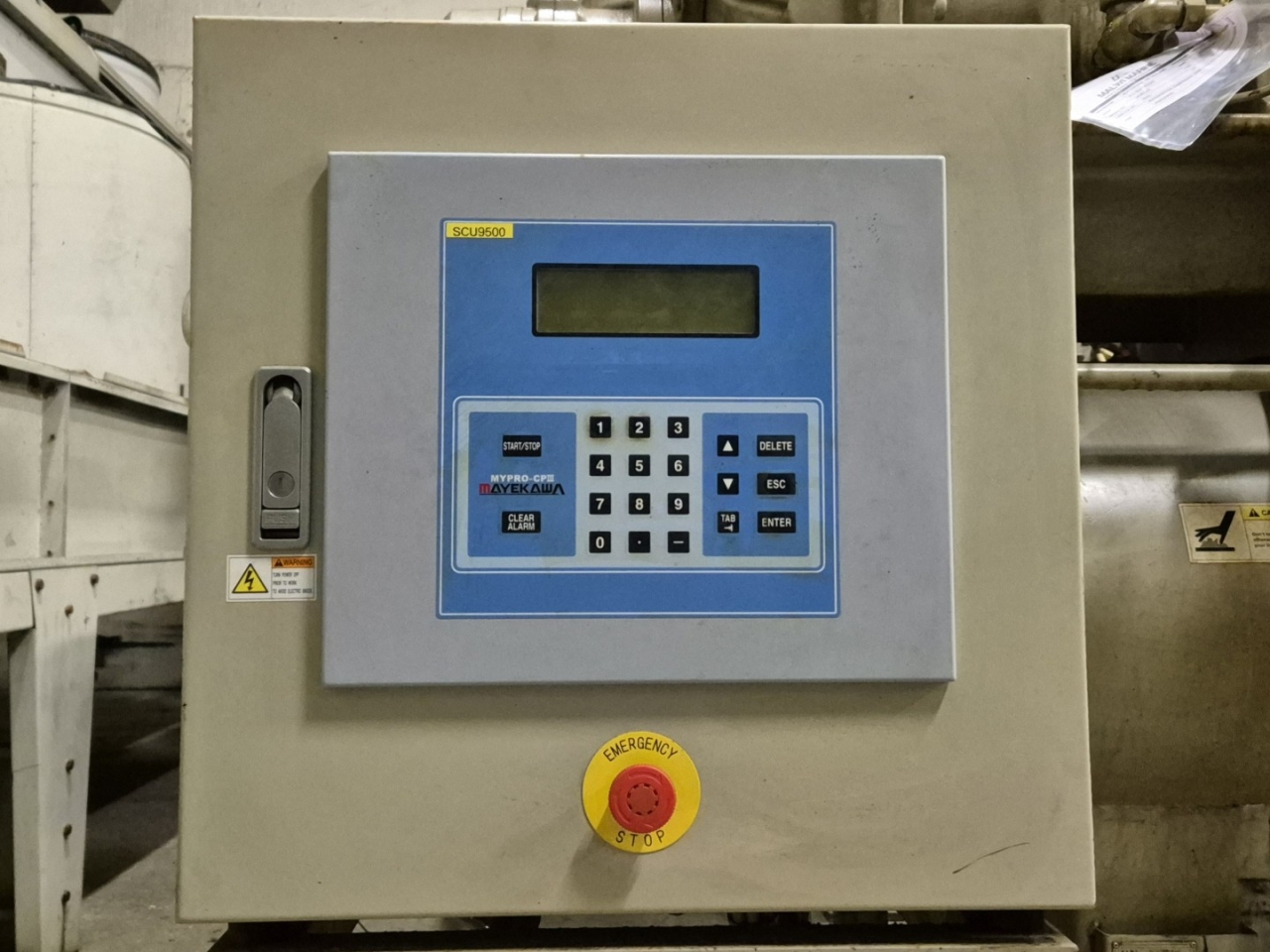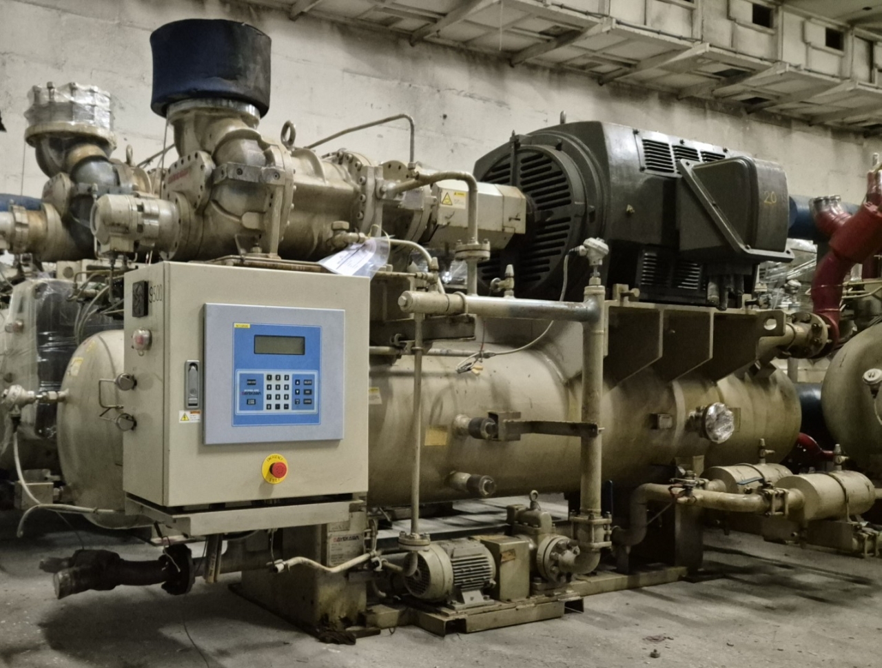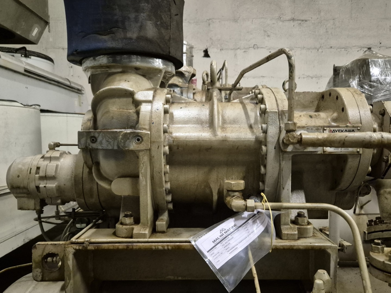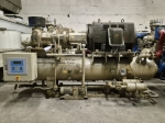 Used Mycom N200VLDD-MS screw compressor skid on NH3 (Ammonia). Complete with a Teco ASJC-PA electric motor - 60 Hz - 355 kW - 3565 RPM, Mayekawa T-A1906 oil separator, Mycom M50P-M oil pump and a Mycom MYPRO-CP3 controller.