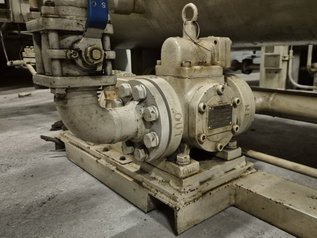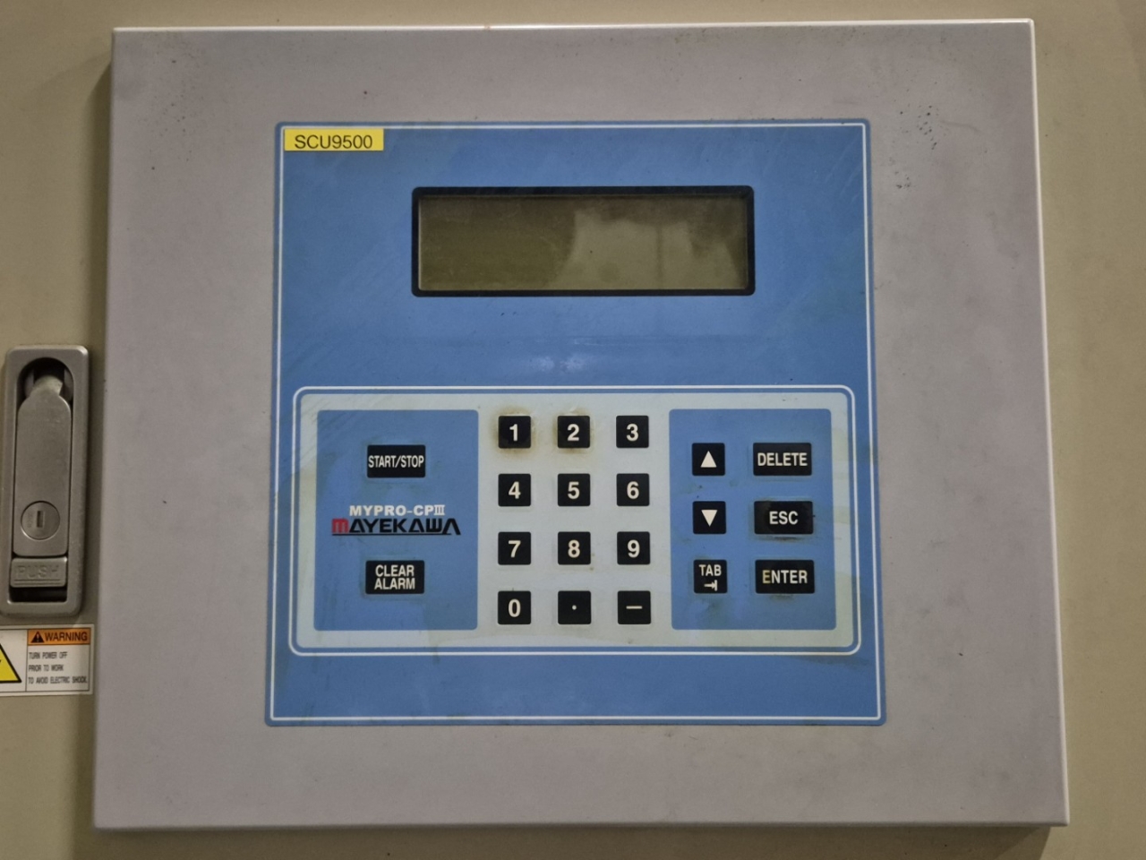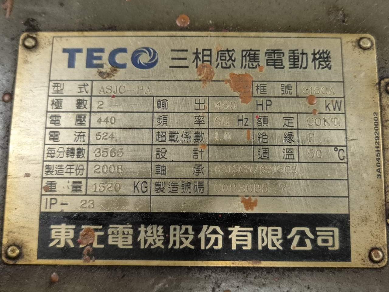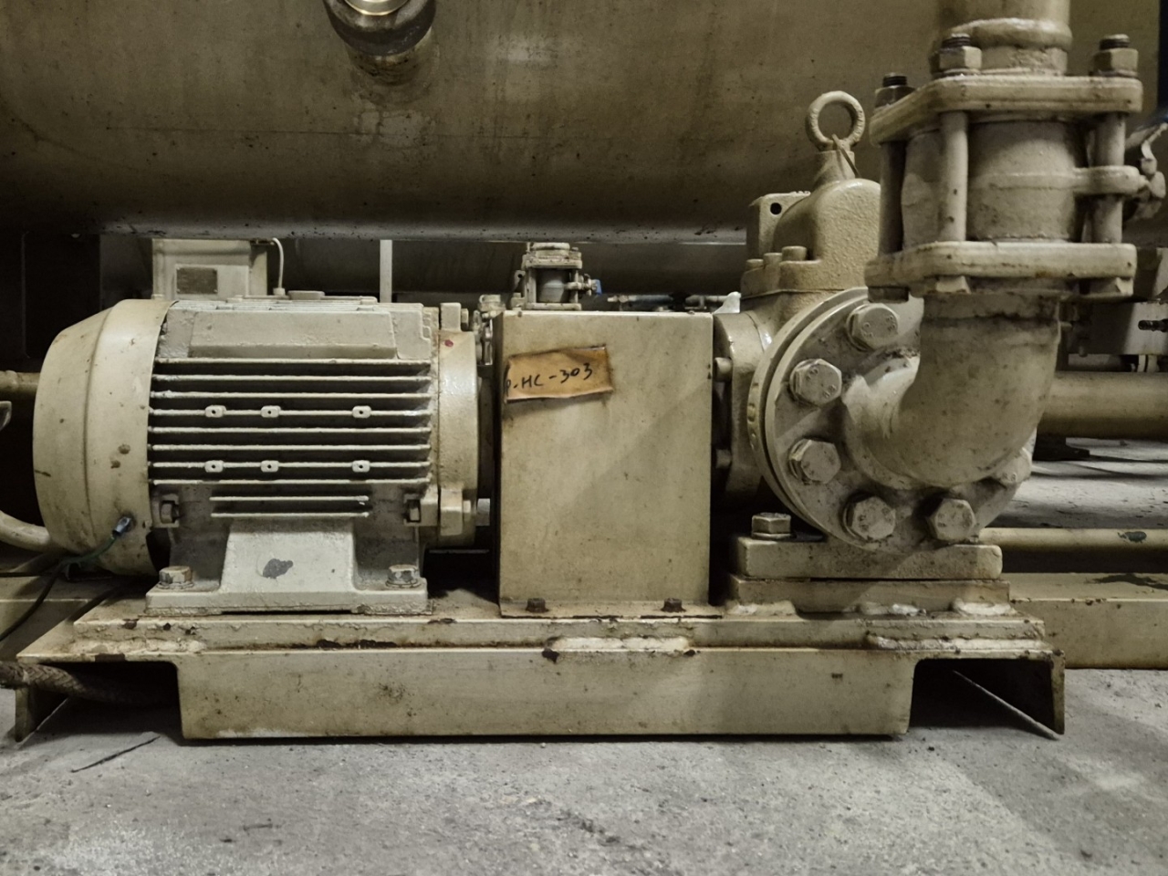 Used Mycom N200VLDD-MS screw compressor skid on NH3 (Ammonia). Complete with a Teco ASJC-PA electric motor - 60 Hz - 355 kW - 3565 RPM, Mayekawa T-A1906 oil separator, Mycom M50P-M oil pump and a Mycom MYPRO-CP3 controller.