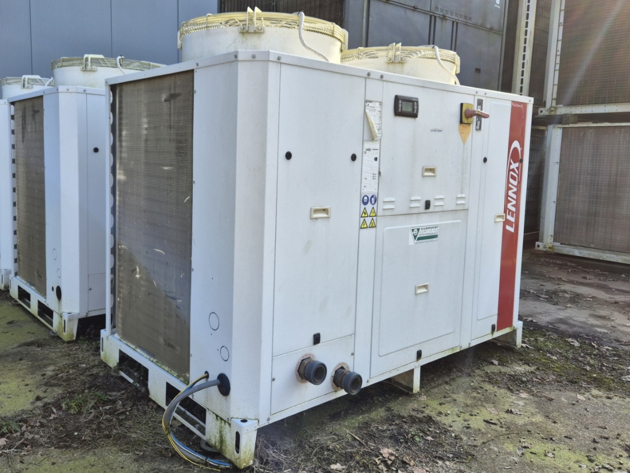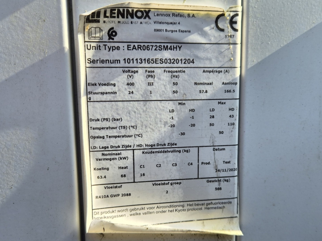 Used Lennox EAR0672SM4HY reversible air cooled chiller / heat pump on R410A. Complete with 2 Copeland ZP154KCE-TFD-455 scroll compressors, condenser with 2 Ziehl-Abegg FN071-SDQ.6F.V7P1 fans - 50 Hz - 0,94/0,62 kW - 900/690 RPM - diameter 710 mm, brazed heat exchanger as evaporator, Grundfos CM10-2- A-R-A-E-AQQE F-A-A-N water pump, Tecnac DVC-180-11 liquid receiver, liquid line filter drier and a control cabinet with a Lennox DC Advanced controller. The chillers have hardly been used.