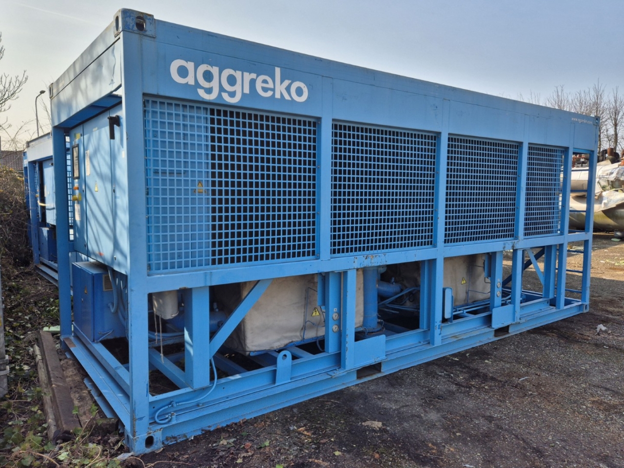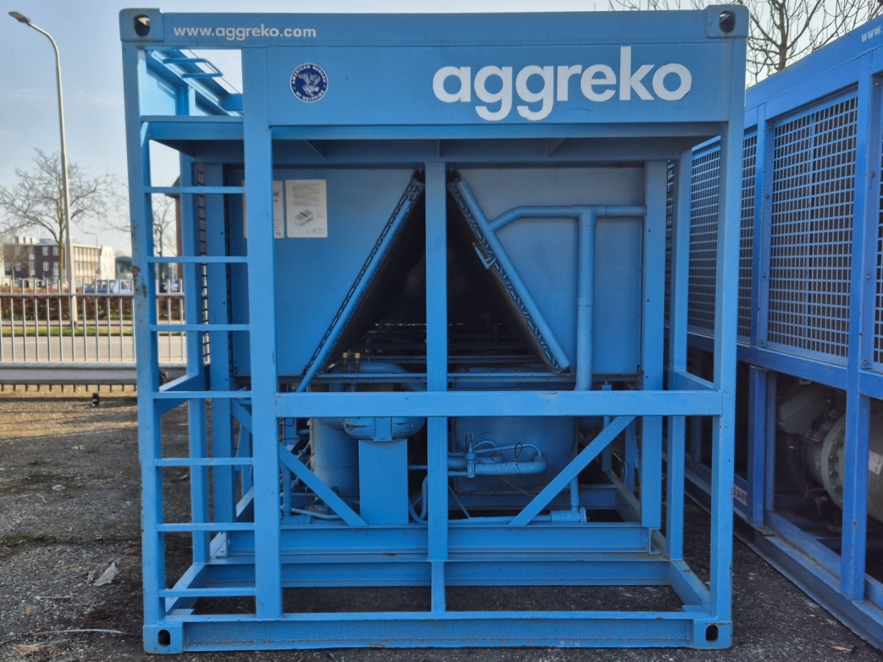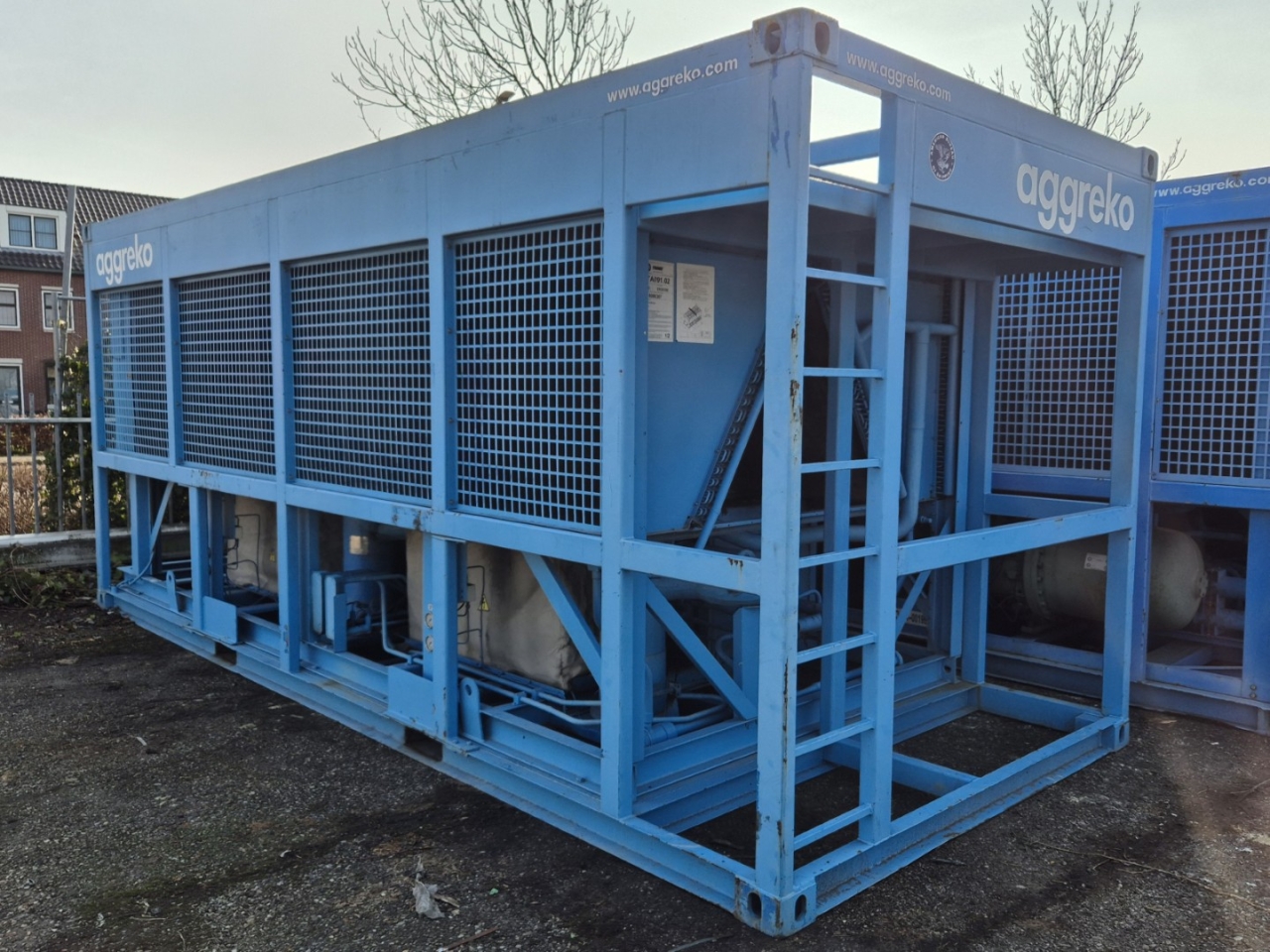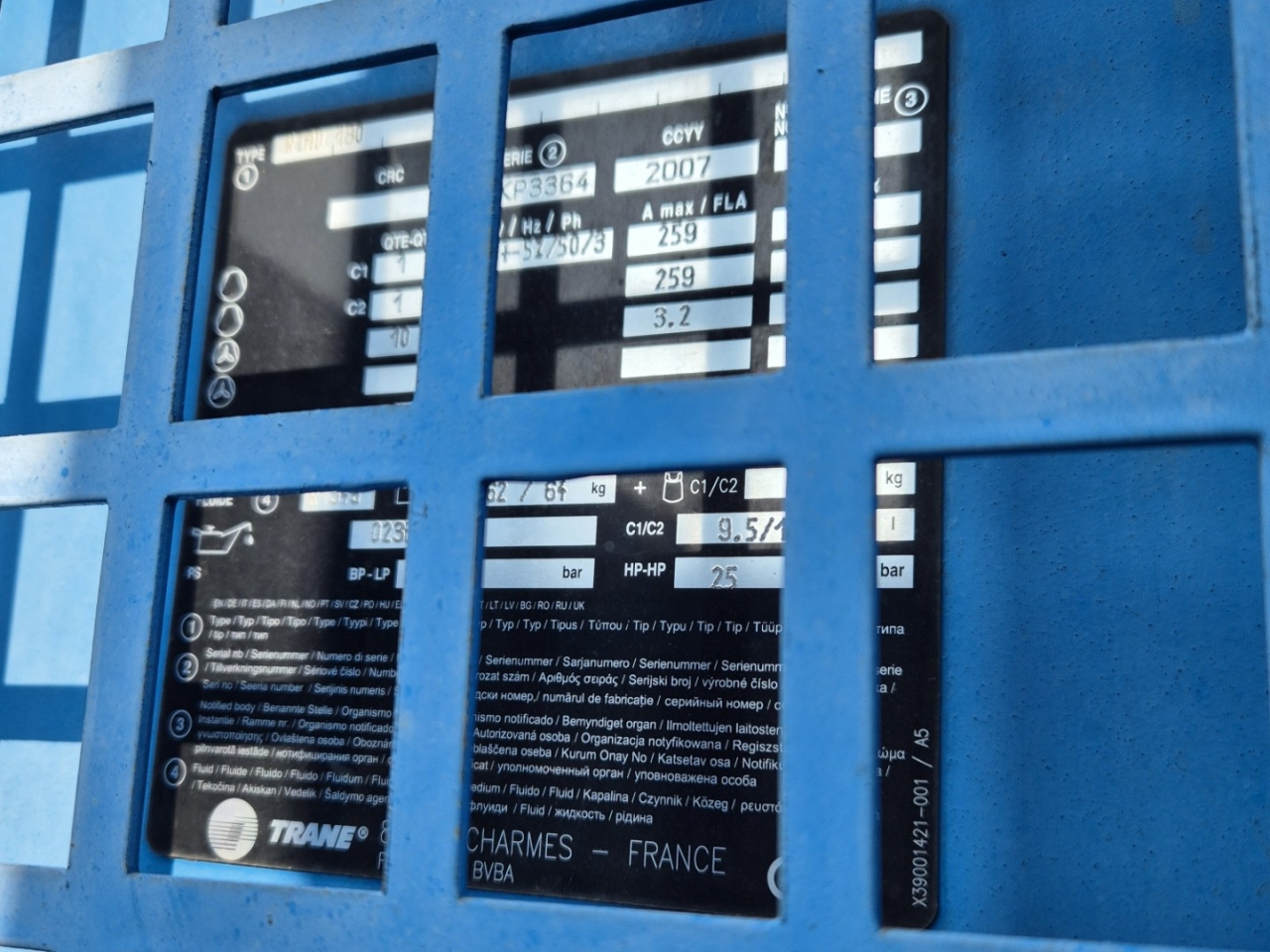 Used Aggreko WCC 750 MK3 / Trane RTAD 180 air-cooled chiller on R134A. Complete with 1x Trane CHHP0N2TKE0N134A & 1x CHHP0N2TKG0N134A semi-hermetic screw compressors, condenser with 10 fans - 50 Hz - 1,25/0,7 kW - 930/750 RPM - diameter 762 mm producing a total airflow of 169.488 m³/h, shell and tube evaporator with a minimum flow of 11,6 l/s and a maximum flow of 38 l/s and a control cabinet with frequency drives and a Trane adaptive controller.