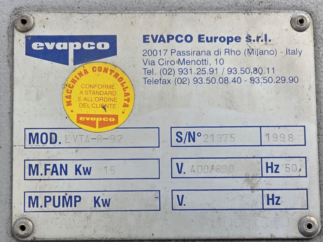Used Evapco LVTA-8-92 cooling tower. Complete with 2 fans driven by a Behncke Q3H160L4B40-BC electric motor: 50/60 Hz - 15,0/17,2 kW - 1474/1773 RPM.