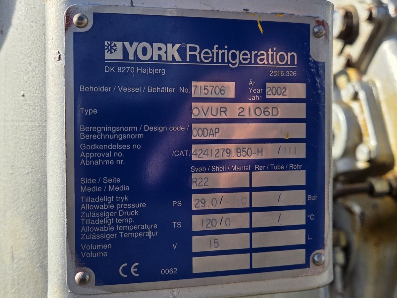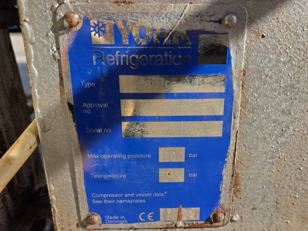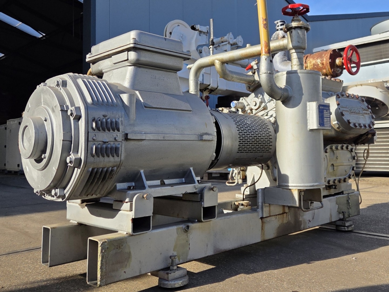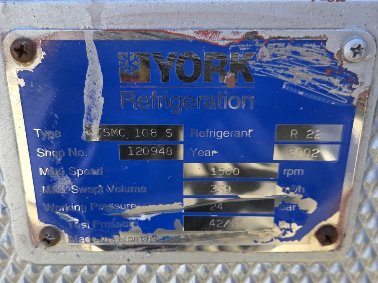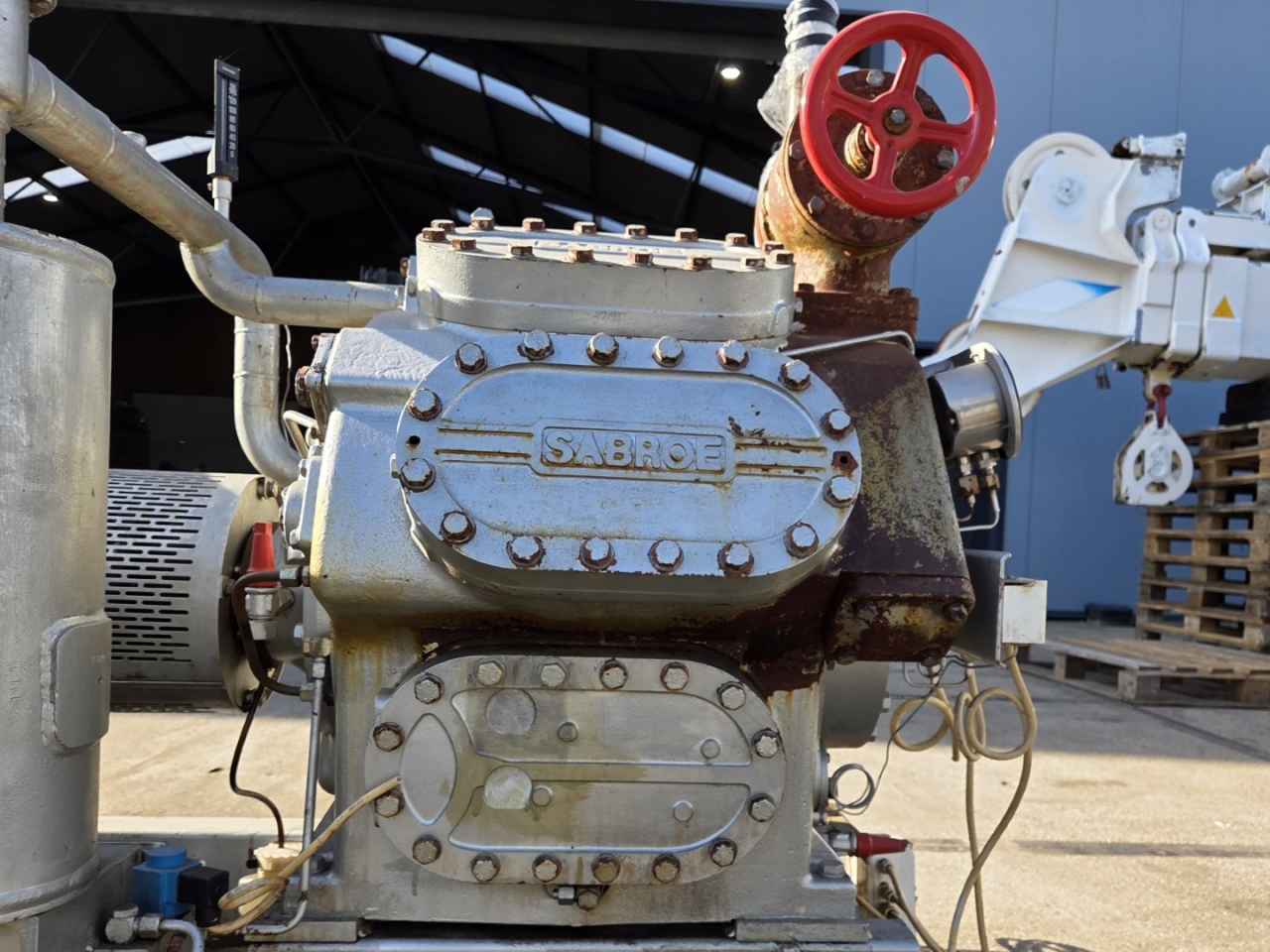 Used Sabroe TSMC 108 S open-type two stage reciprocating compressor on Freon. Complete with a Schorch KN7225M-CB01B-Z electric motor - 50/60 Hz - 37/42,5 kW - 975/1175 RPM, Sabroe OVUR 2106D oil separator with a volume of 15 liter, pressure and safety switches/gauges. The compressor has a displacement of 339 m³/h.
