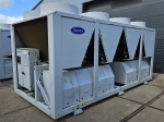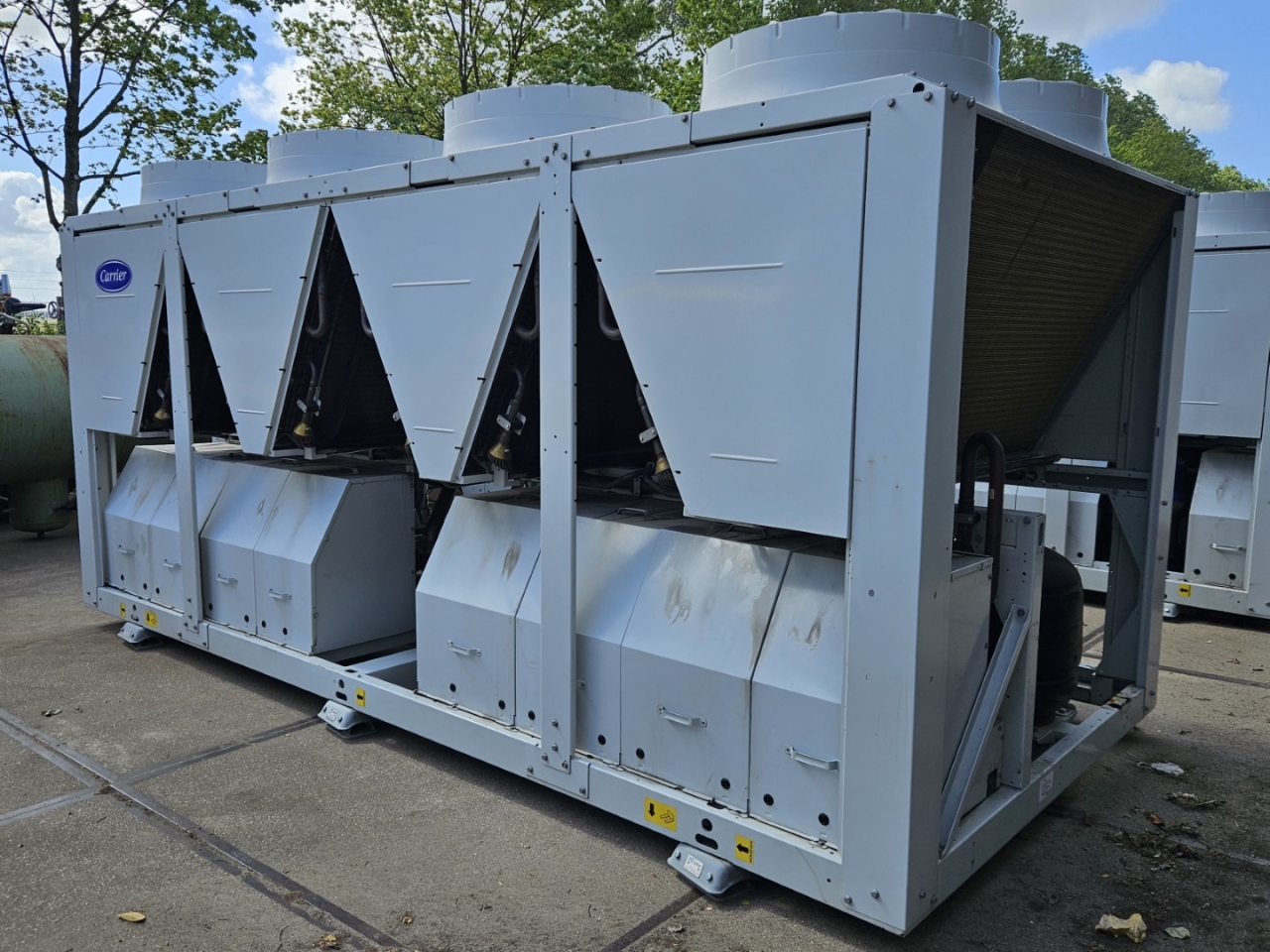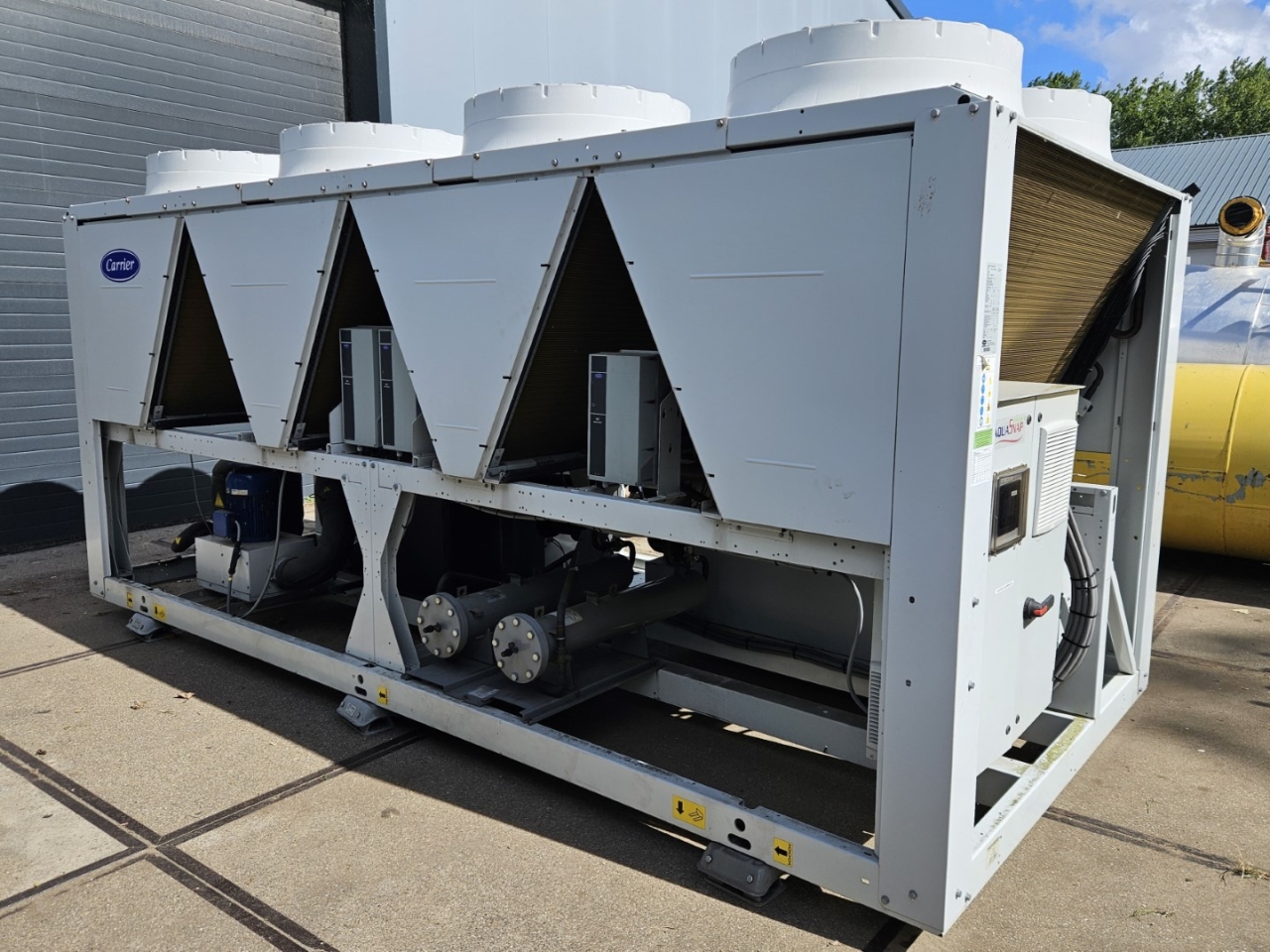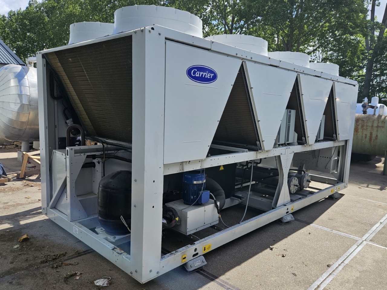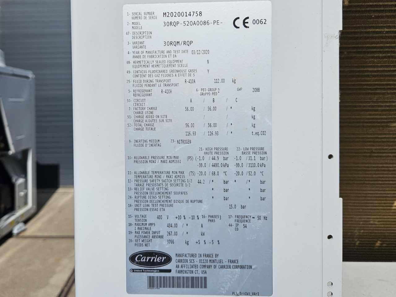Used Carrier 30 RQP 520 air-cooled chiller / heat pump on R410A built in 2020. Complete with 8 Danfoss SH295A4ACE scroll compressors, condenser with 8 fans that produce an airflow of 129.999 m³/h, brazed heat exchanger as evaporator, Lowara water pump, expansion vessel, 1 Danfoss FC-102P7K5T4E55H1 & 2 FC-102P11KT4E55H1 frequency converters and a control cabinet with a SmartView controller.