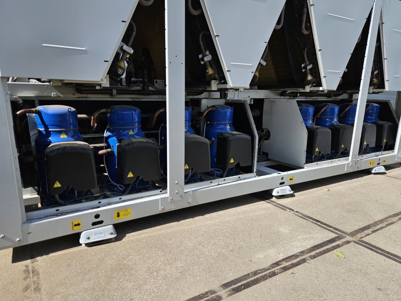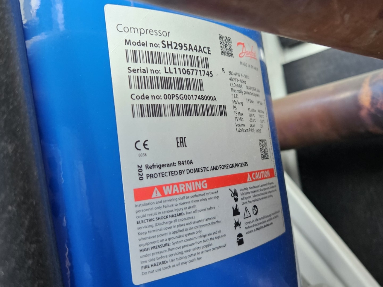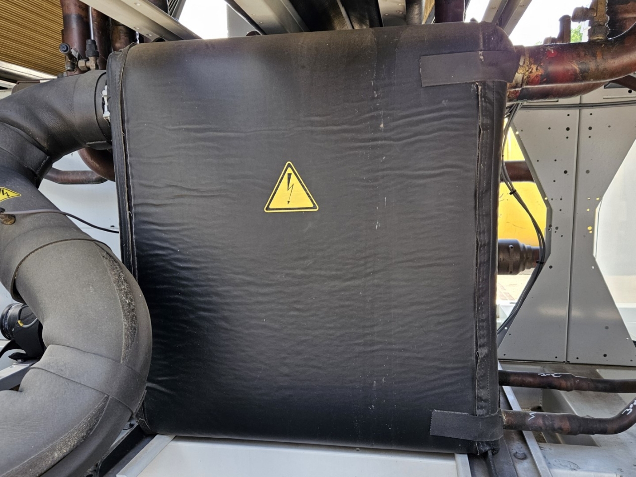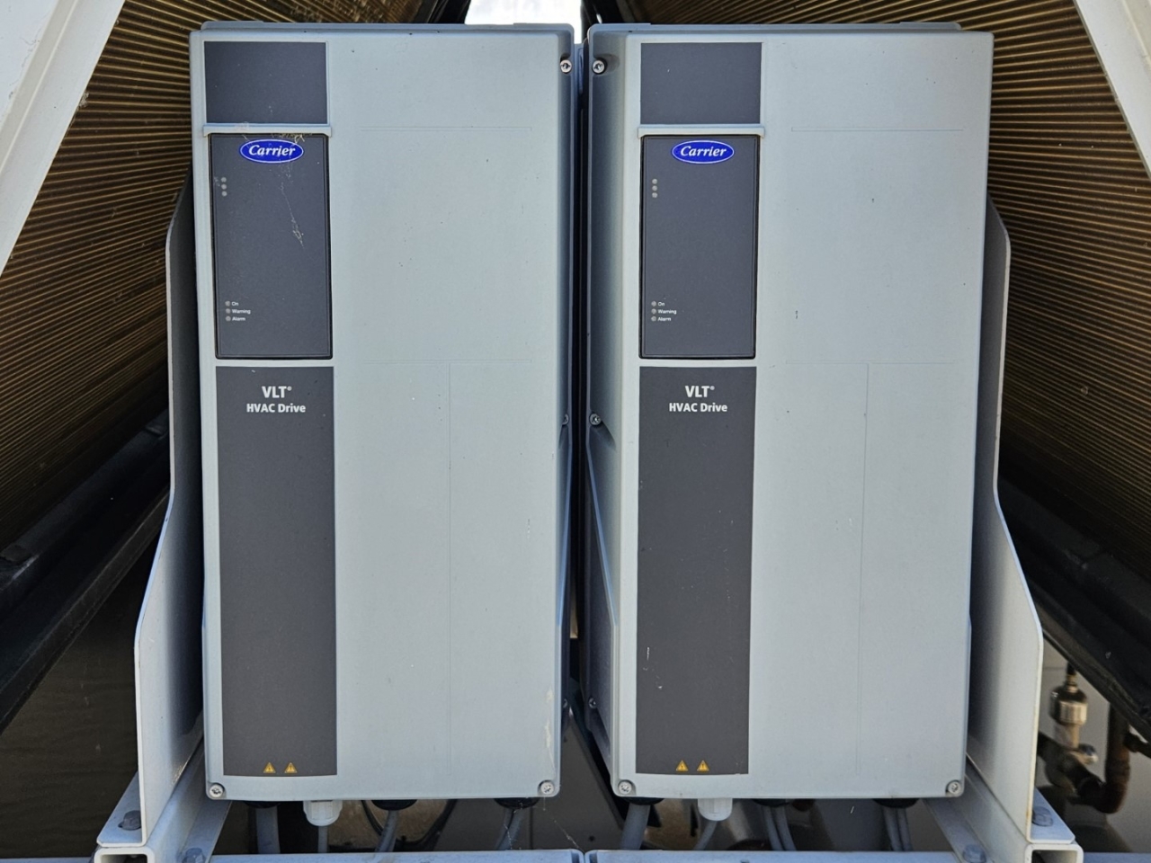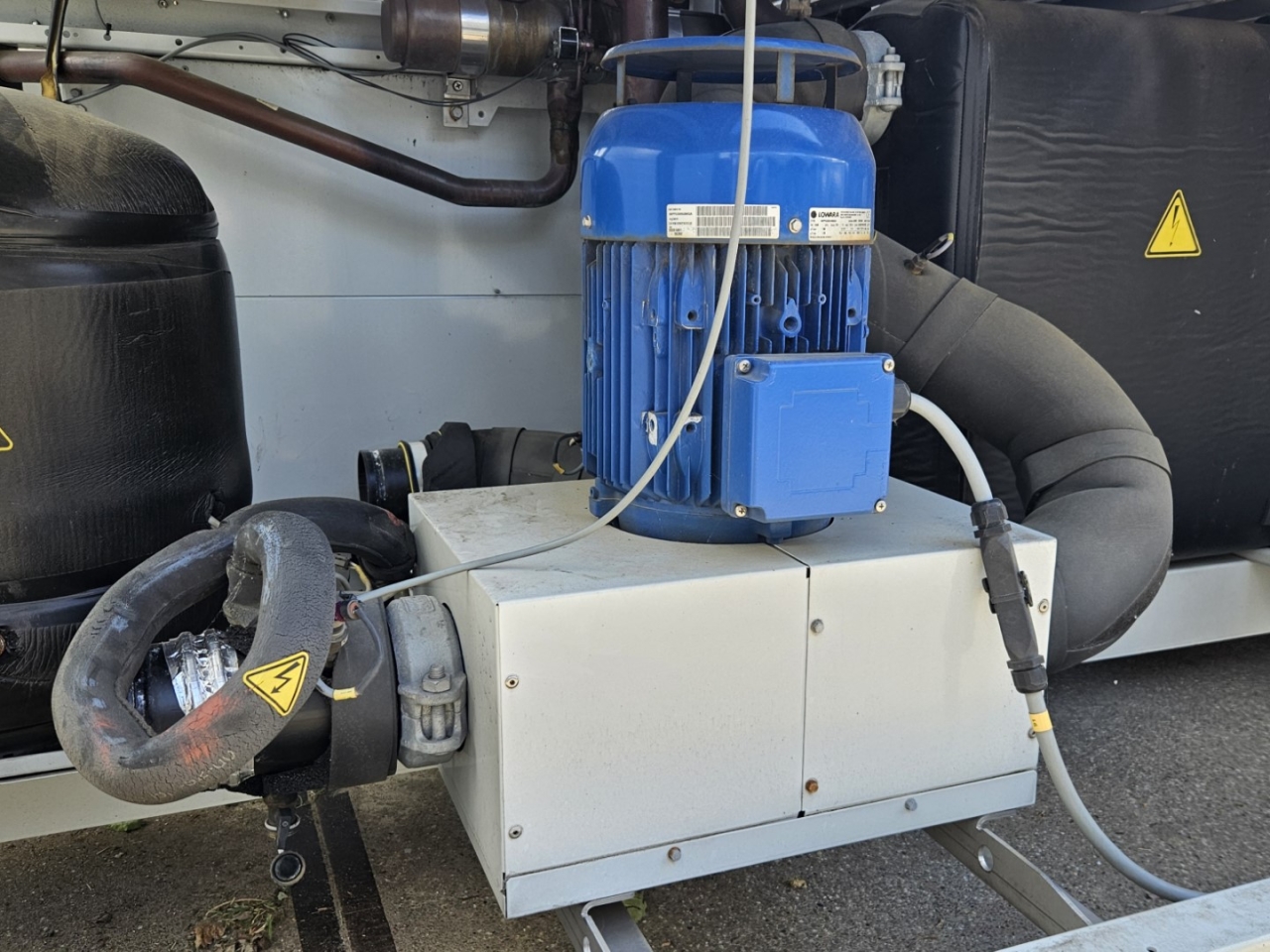 Used Carrier 30 RQP 520 air-cooled chiller / heat pump on R410A built in 2020. Complete with 8 Danfoss SH295A4ACE scroll compressors, condenser with 8 fans that produce an airflow of 129.999 m³/h, brazed heat exchanger as evaporator, Lowara water pump, expansion vessel, 1 Danfoss FC-102P7K5T4E55H1 & 2 FC-102P11KT4E55H1 frequency converters and a control cabinet with a SmartView controller.